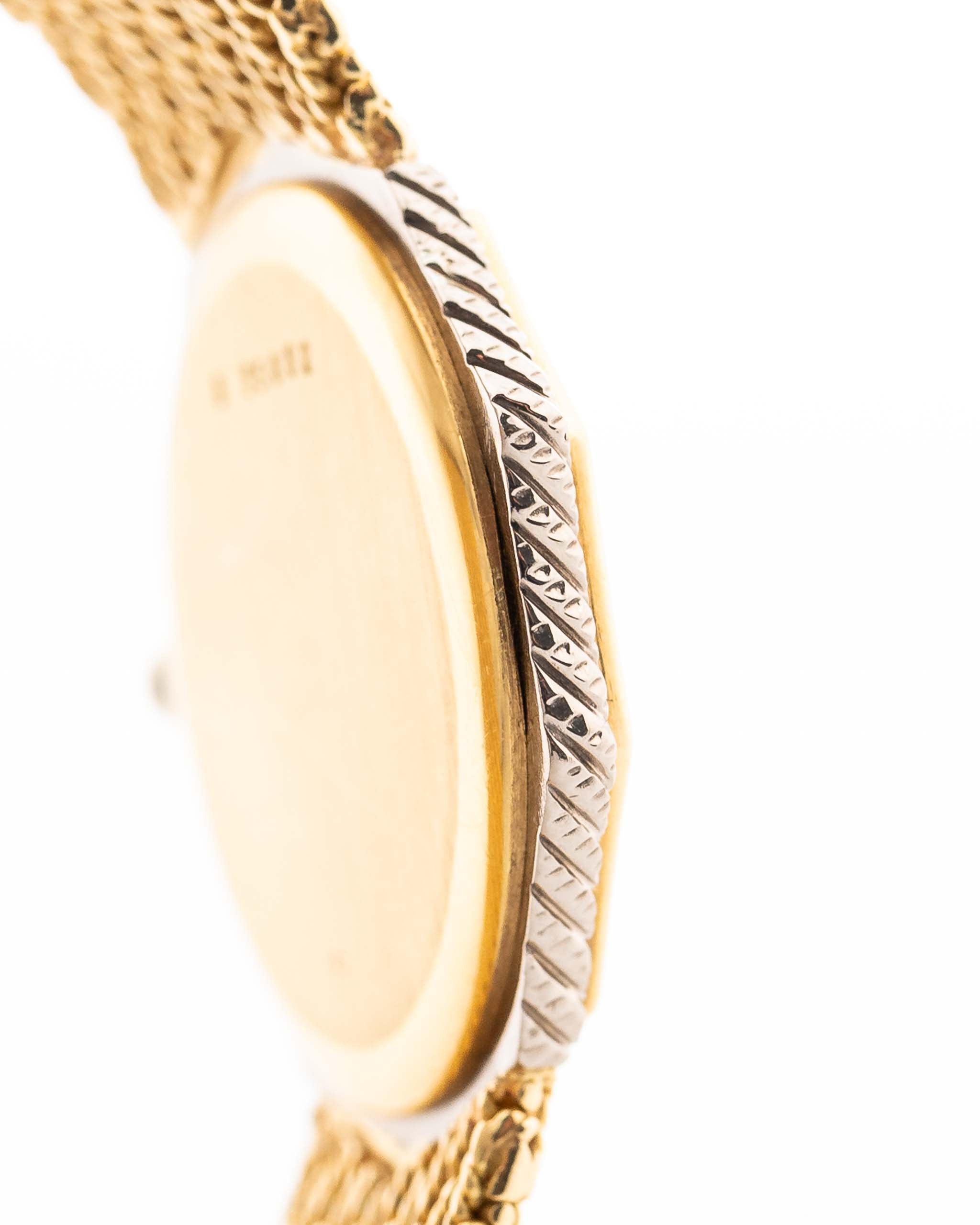 Le point fort réside dans la lunette contrastée en or blanc de style corde, associée à un bracelet intégré unique en or jaune 18 carats et à un fermoir signé AP. Animée par le calibre Audemars Piguet Cal. 2003 à remontage manuel, cette pièce allie un design sculptural à une horlogerie classique. Une montre habillée AP rare et très expressive, au caractère indéniablement années 1980.