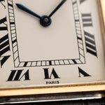 Housed in an elegant 18k yellow gold case with beautifully preserved lines, the 23.5 x 29.5 mm proportions make this a discreet yet undeniably stylish presence on the wrist. The dial is flawless: crisp Roman numerals, the “Paris” signature (sold at Cartier Paris) at 6 o’clock, and original blued sword hands — all wrapped in Cartier’s timeless visual harmony.