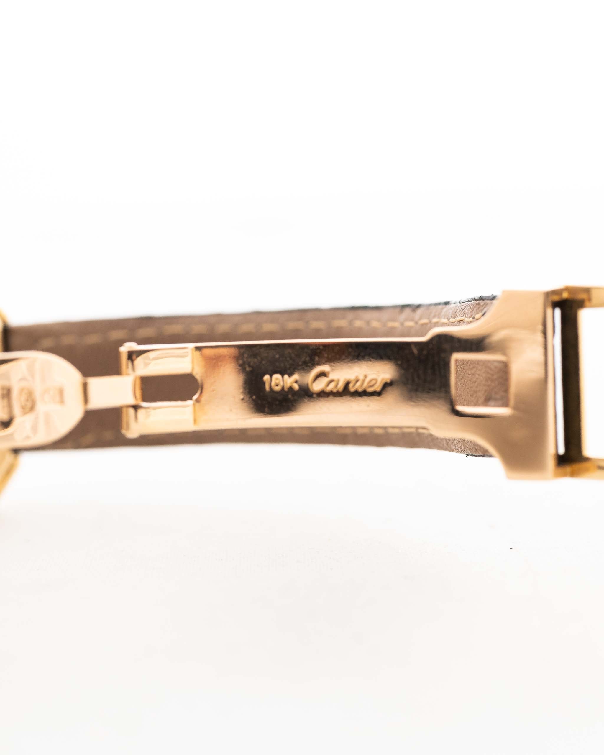 En or jaune 18 carats massif, la montre se présente magnifiquement, conservant des surfaces nettes et des lignes fortes. Accompagnée de son bracelet Cartier d'origine et de sa boucle en or assortie (ainsi que d'un bracelet supplémentaire pour un usage pratique), cette pièce allie la rareté, l'élégance et un charme parisien incomparable.