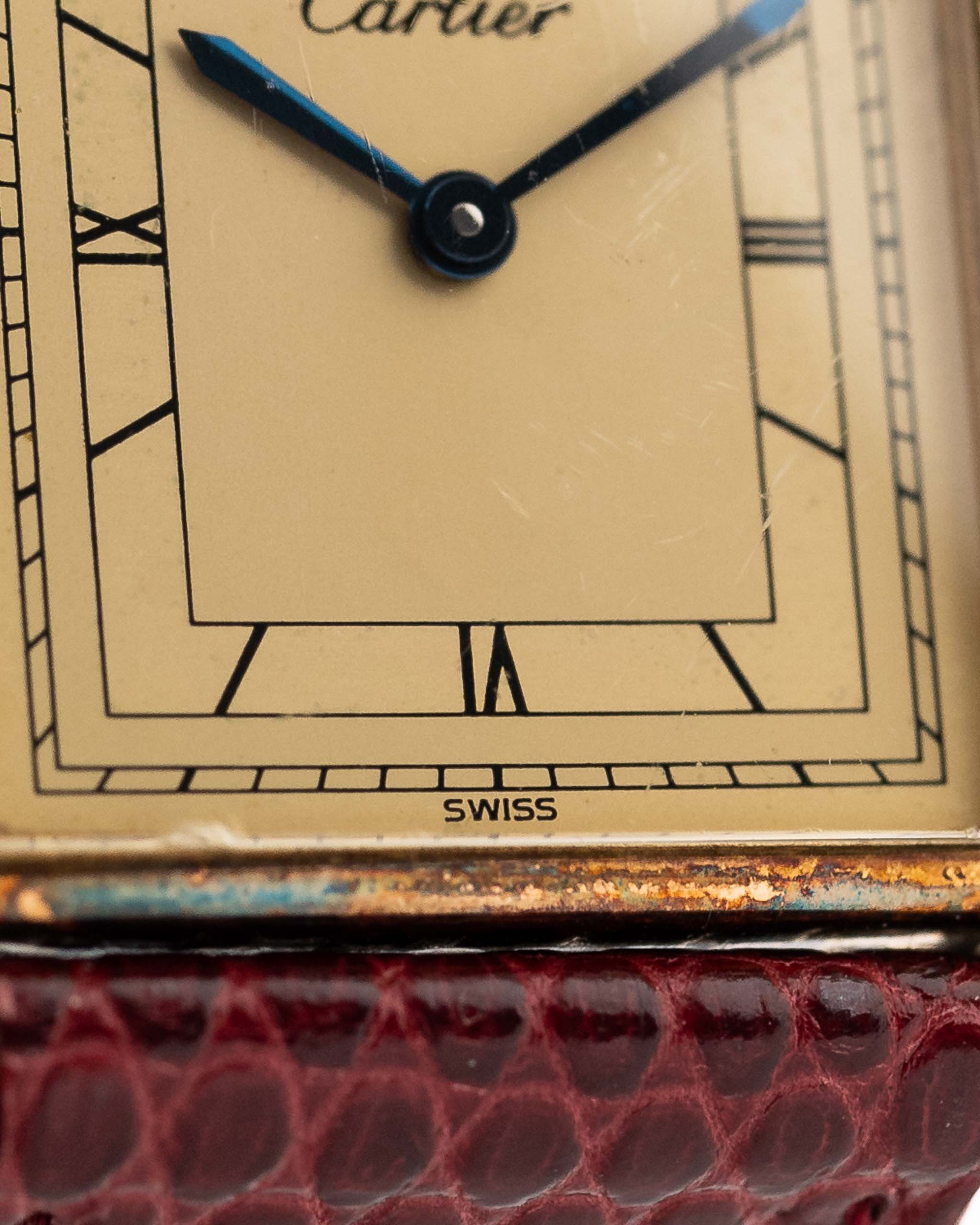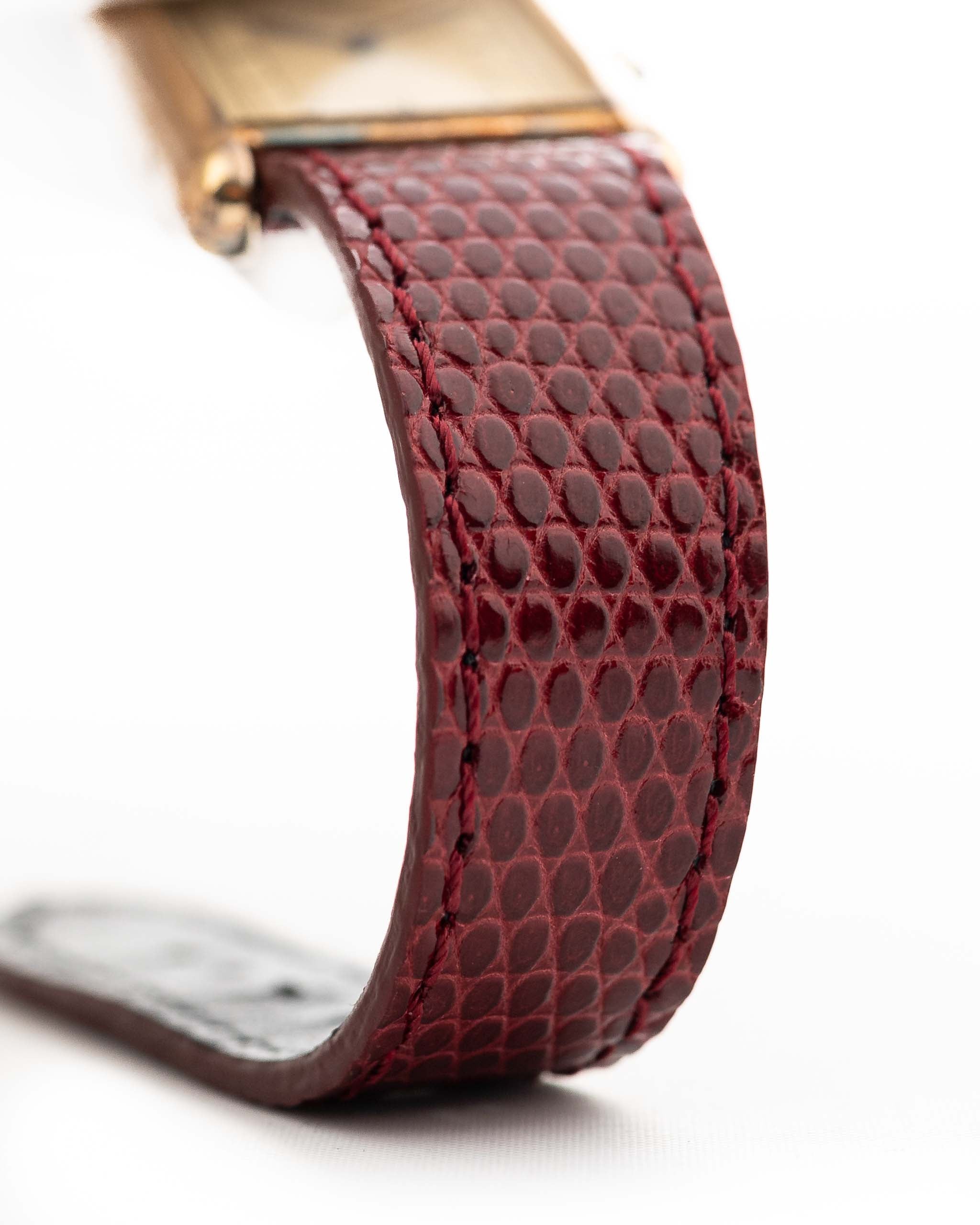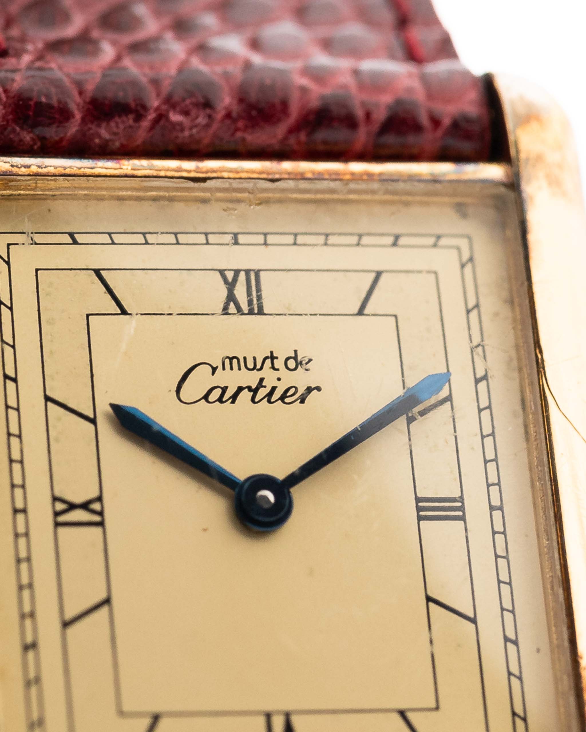 This reference 81006, from the Must de Cartier line, captures that legacy with vintage charm. Its 925 sterling silver case, plated in yellow gold (vermeil), houses a two-tone champagne dial with elegant Roman numerals and blued sword hands — a combination that evokes classic Parisian sophistication. The red Cartier leather strap adds a bold yet refined finishing touch.