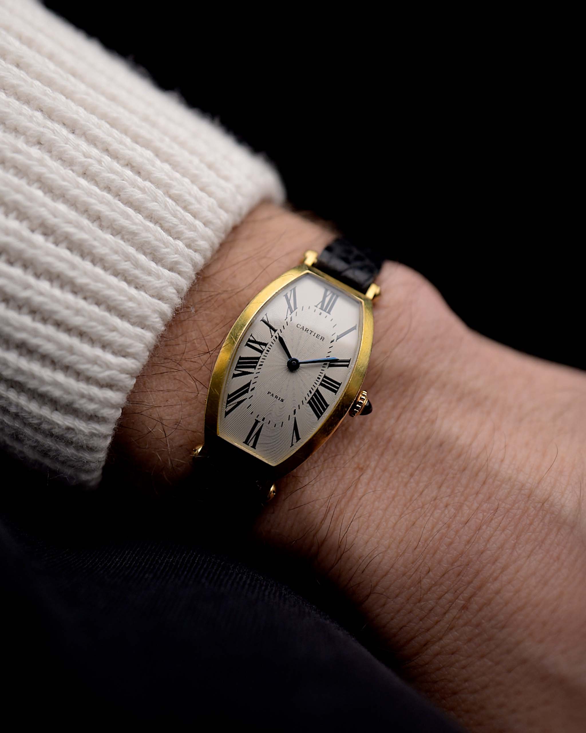 Photo en gros plan d'une Cartier Tonneau 18k Guilloché Paris des années 1980. 39mm avec boîtier en or jaune 18k, mouvement à remontage manuel, cadran Guilloché Paris original et bracelet en cuir noir.