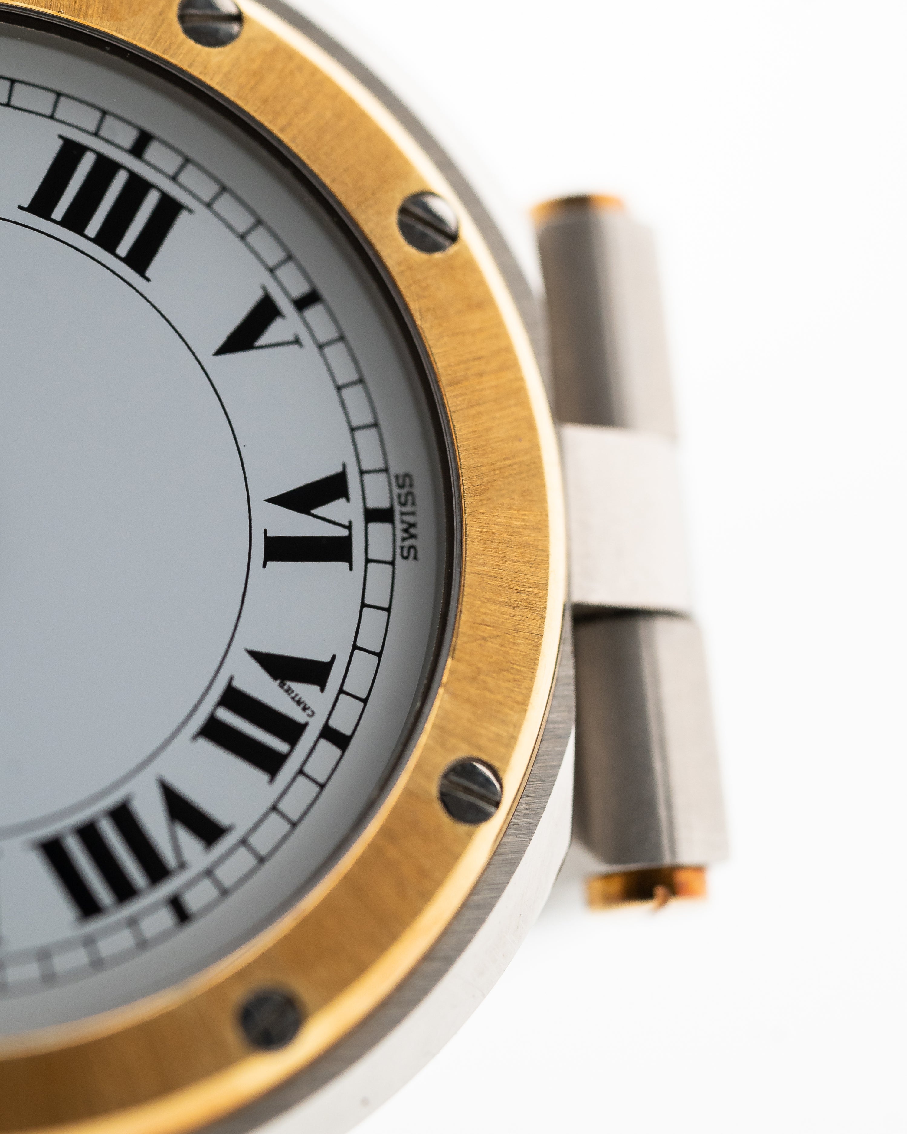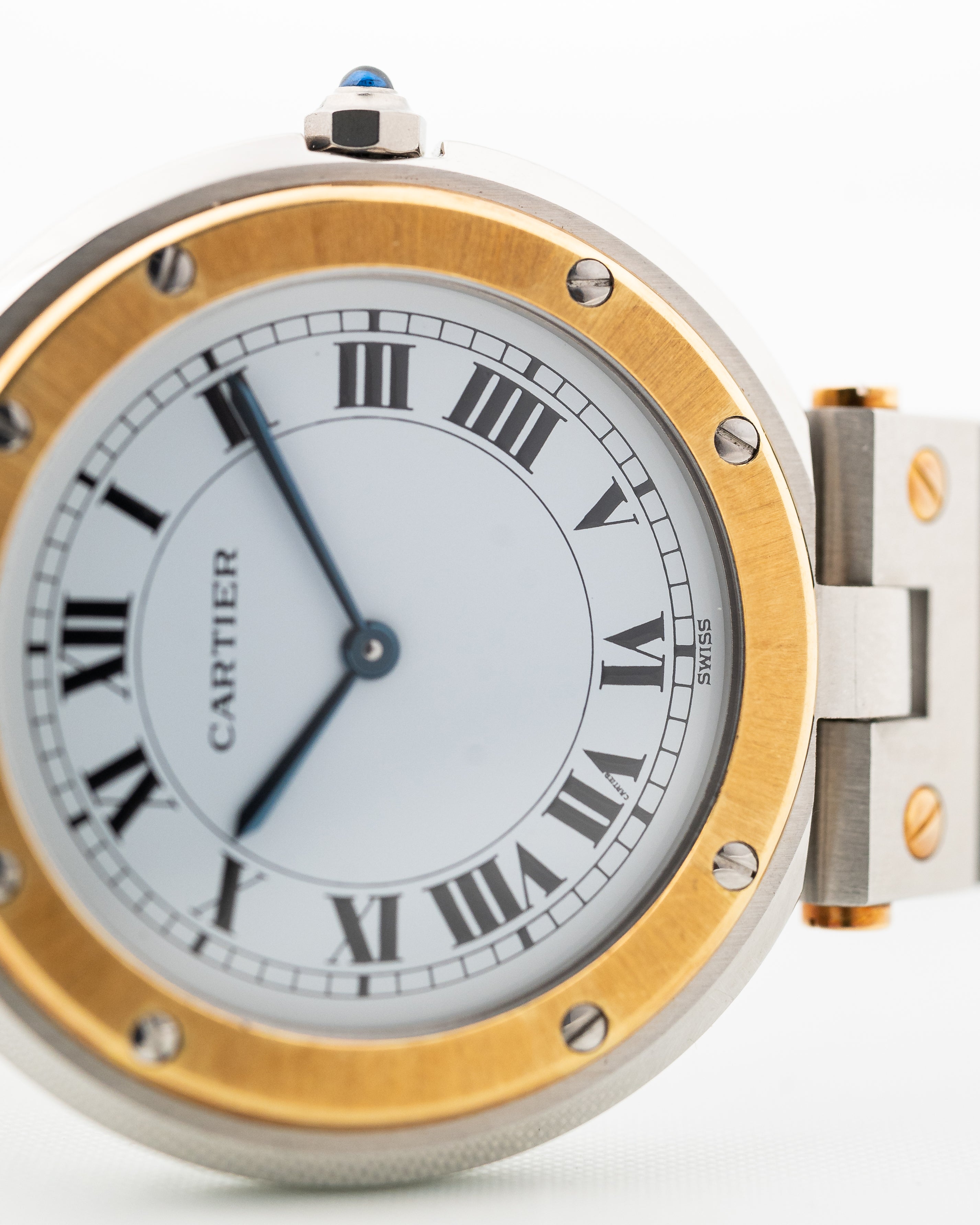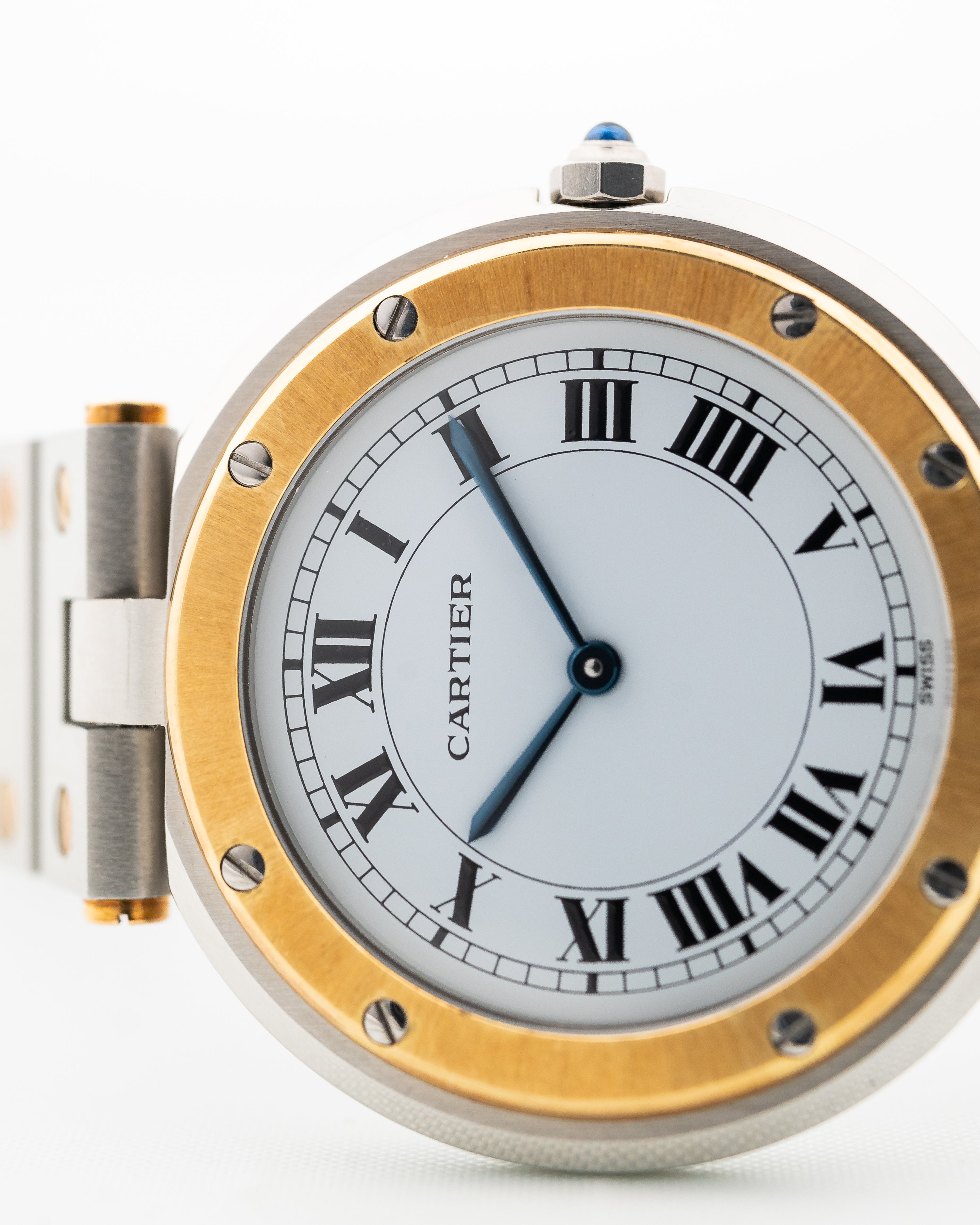 Cette Cartier Santos Vendome Ronde en acier inoxydable bicolore se distingue par son cadran à chiffres romains blancs, ses aiguilles en acier bleui et, bien sûr, ses accents en or 18 carats.