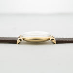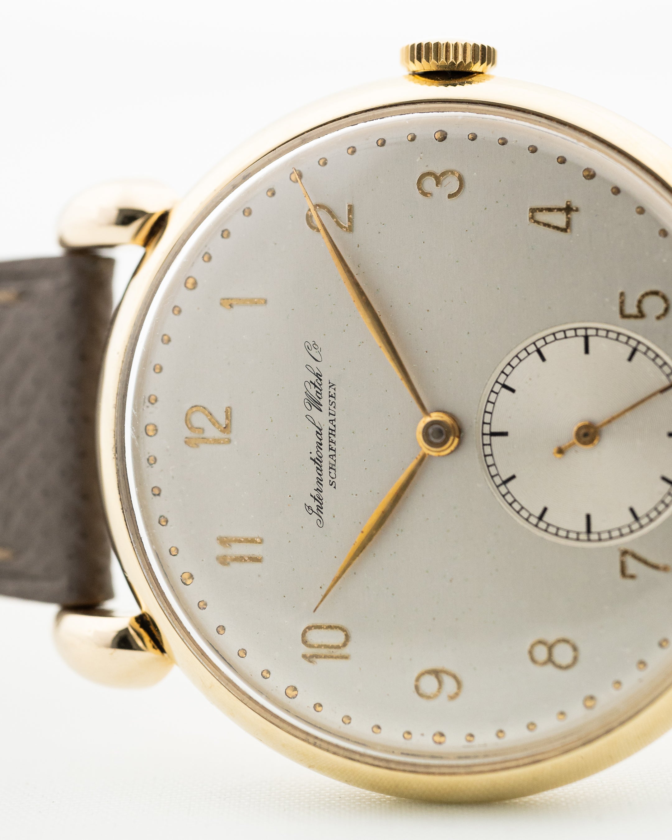 IWC a produit très tôt une très grande variété de montres-bracelets, allant des montres habillées aux montres d'aviation. Cet exemple, en or jaune 14 carats avec des cornes en forme de goutte d'eau, restera une constante dans les collections, d'autant plus qu'il est en très bon état.