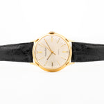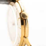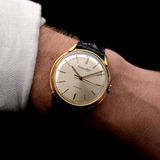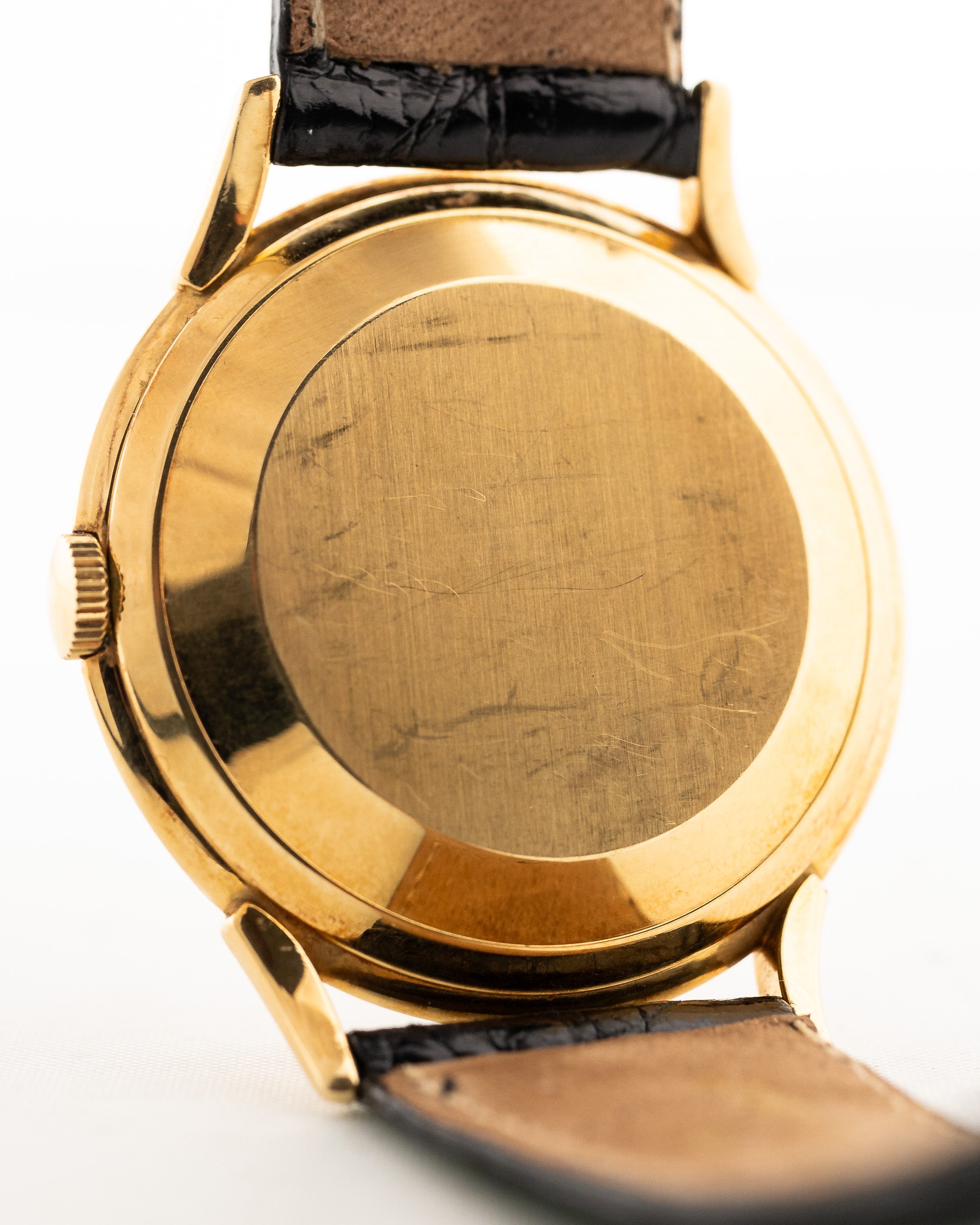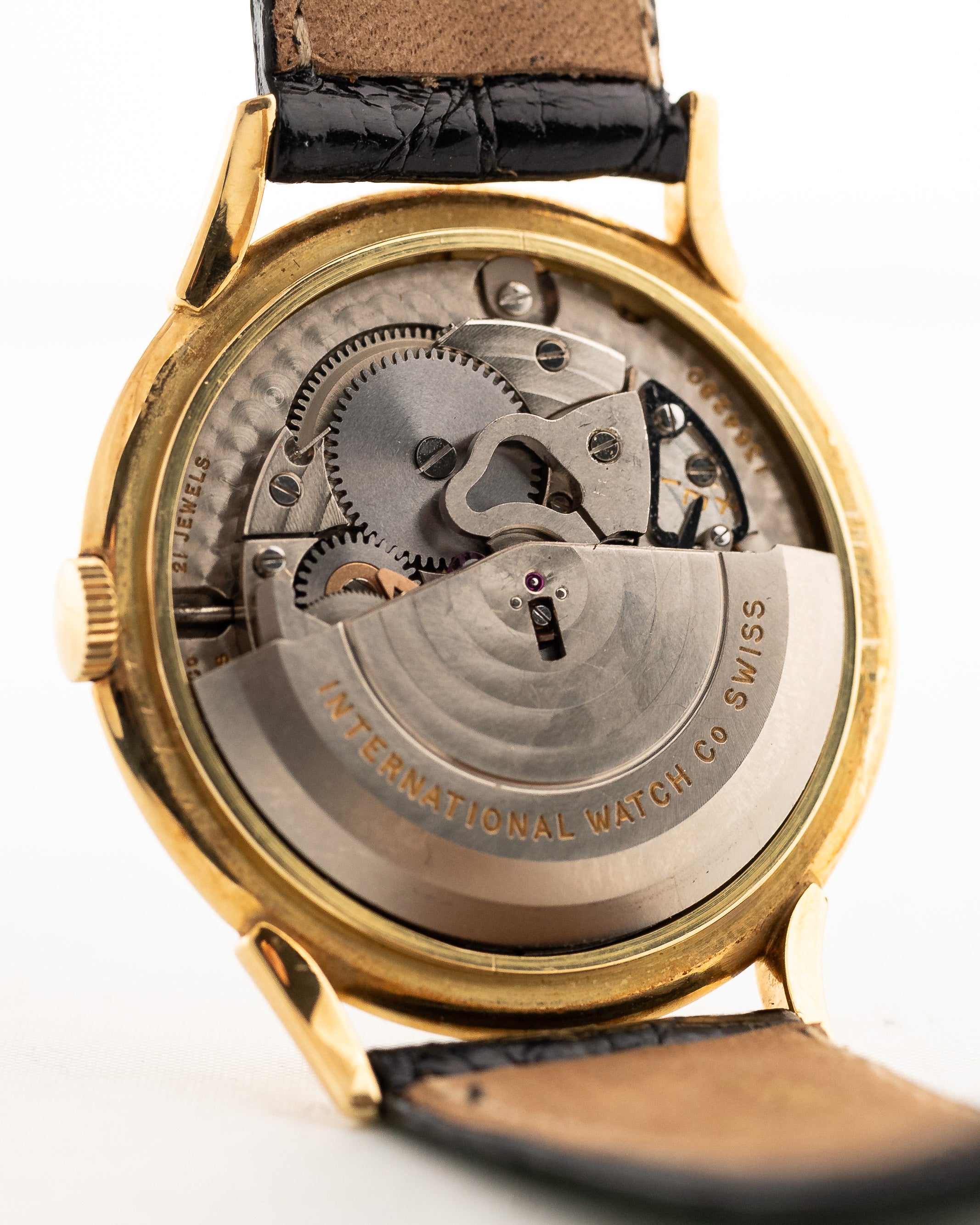 IWC a produit très tôt une grande variété de montres-bracelets, allant des montres habillées aux montres d'aviation. Cet exemplaire, dont le boîtier est en or jaune 18 carats, est en parfait état et possède un magnifique cadran argenté en forme de soleil , avec des index et des aiguilles simples en forme de bâton, qui restera une constante dans les collections de tout un chacun.