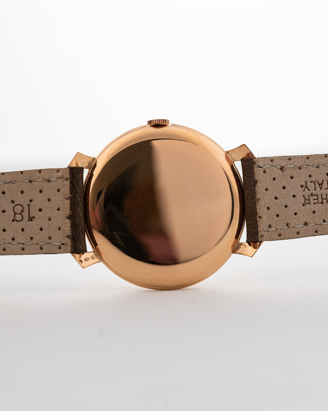 IWC a produit une très grande variété de montres-bracelets depuis le début, allant des montres habillées aux montres d'aviation. Cet exemple, en or rose 18 carats avec des cornes en forme d'aileron de requin, resterait une constante dans les collections, d'autant plus qu'il est dans un état NOS.