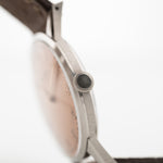 IWC a produit très tôt une très grande variété de montres-bracelets, allant des montres habillées aux montres d'aviation. Cet exemple, en acier inoxydable avec des cornes légèrement inclinées, resterait une constante dans les collections, d'autant plus qu'il possède un cadran de couleur saumon très rare et en très bon état.