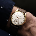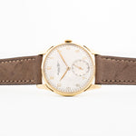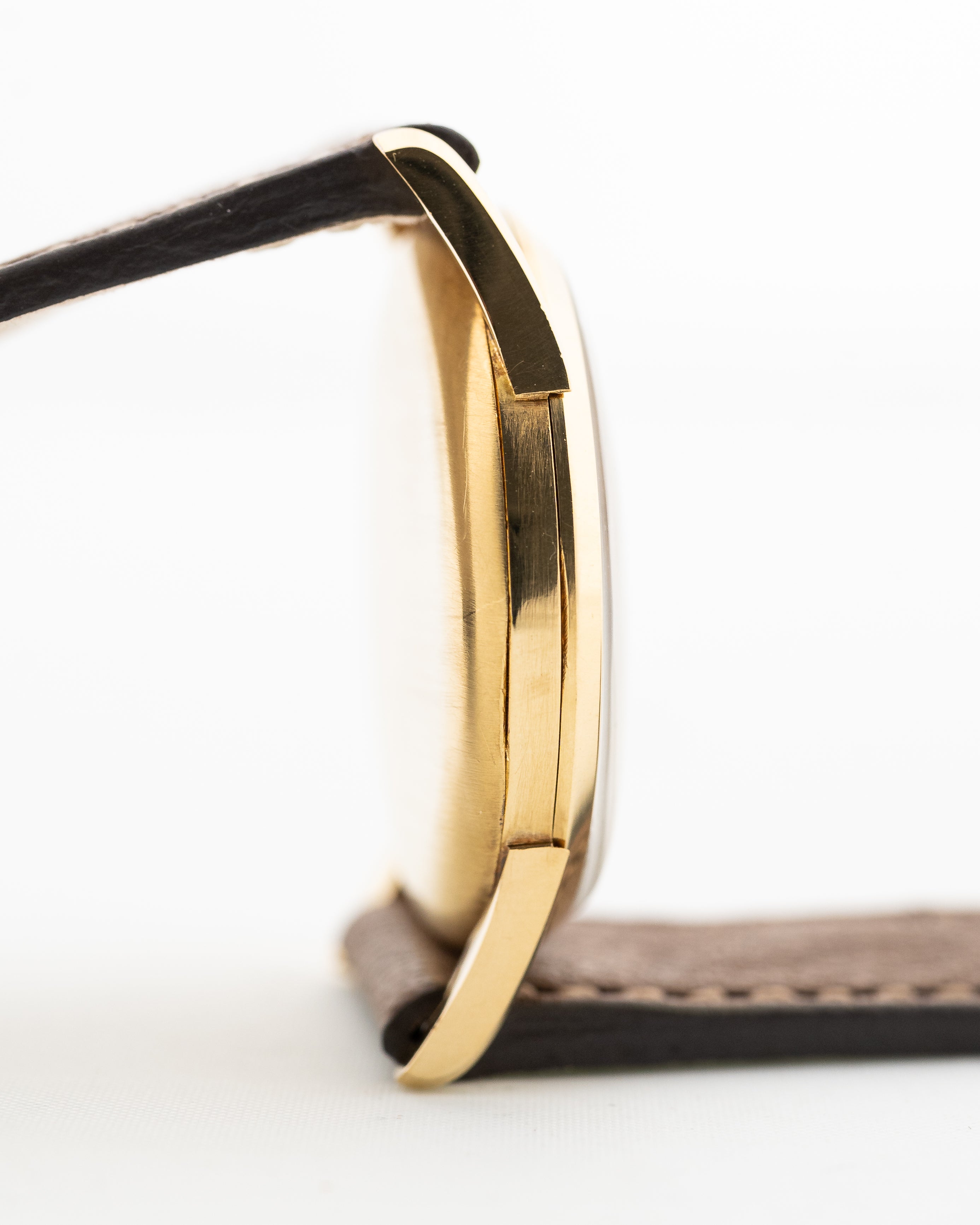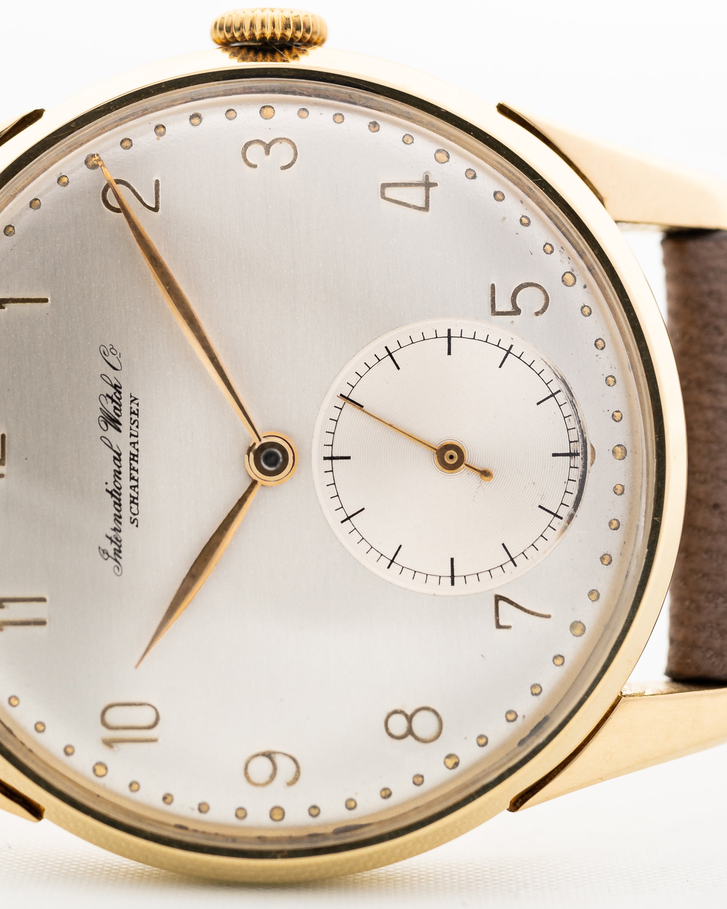 IWC a produit très tôt une très grande variété de montres-bracelets, allant des montres habillées aux montres d'aviation. Notre exemplaire de 1947, avec son boîtier en or jaune 18 carats, ses cornes épaisses et son magnifique cadran blanc des secondes, restera une constante dans les collections, d'autant plus qu'il se présente dans cet état exceptionnel.