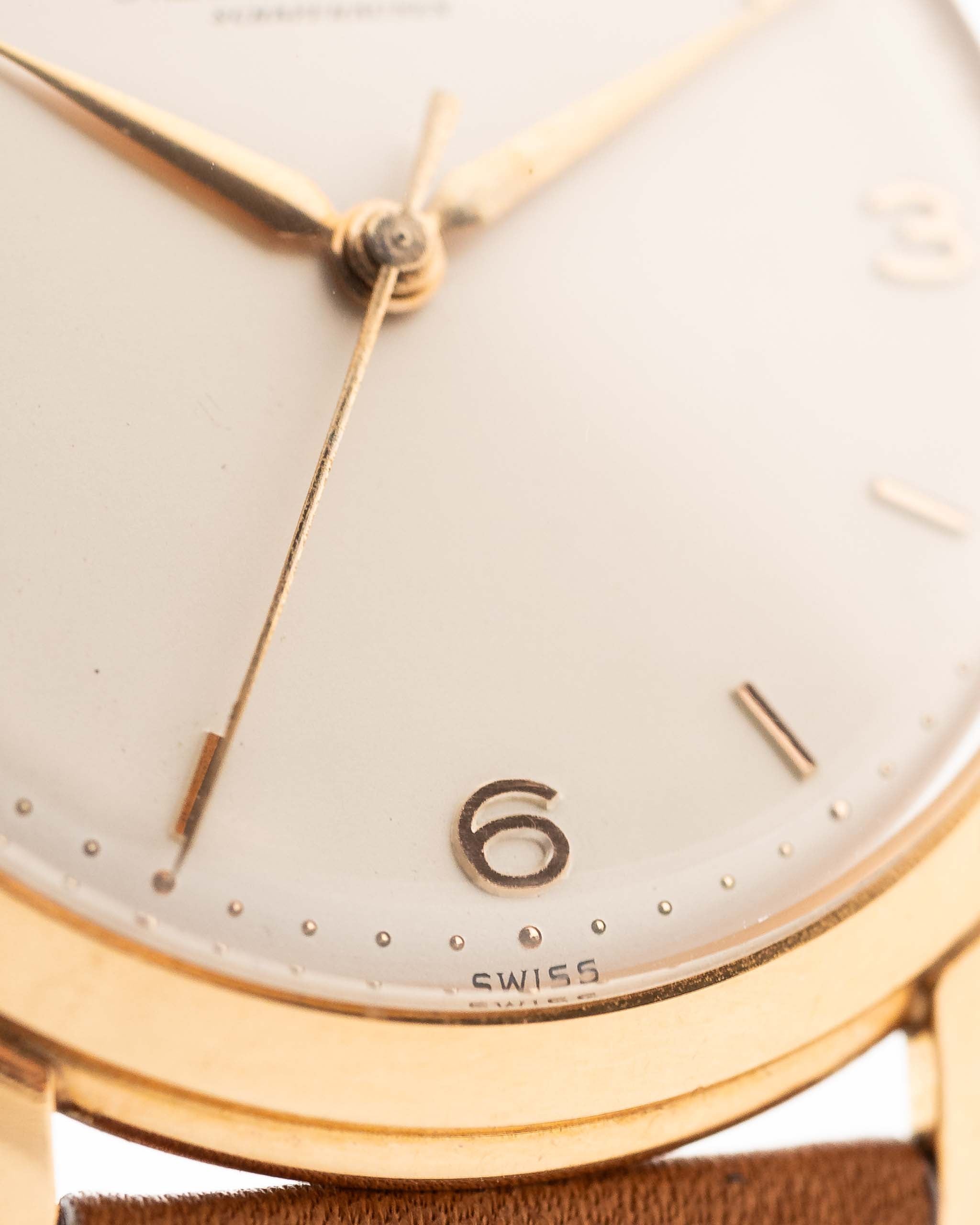 Avec ses 37 mm, cette pièce était considérée comme surdimensionnée à l'époque - et reste parfaitement proportionnée pour les goûts modernes d'aujourd'hui. Le cadran blanc/argenté, avec sa disposition classique 12-3-6-9, ses aiguilles et sa couronne d'origine, a développé une patine subtile et uniforme qui lui confère un caractère vintage sans en compromettre la lisibilité.