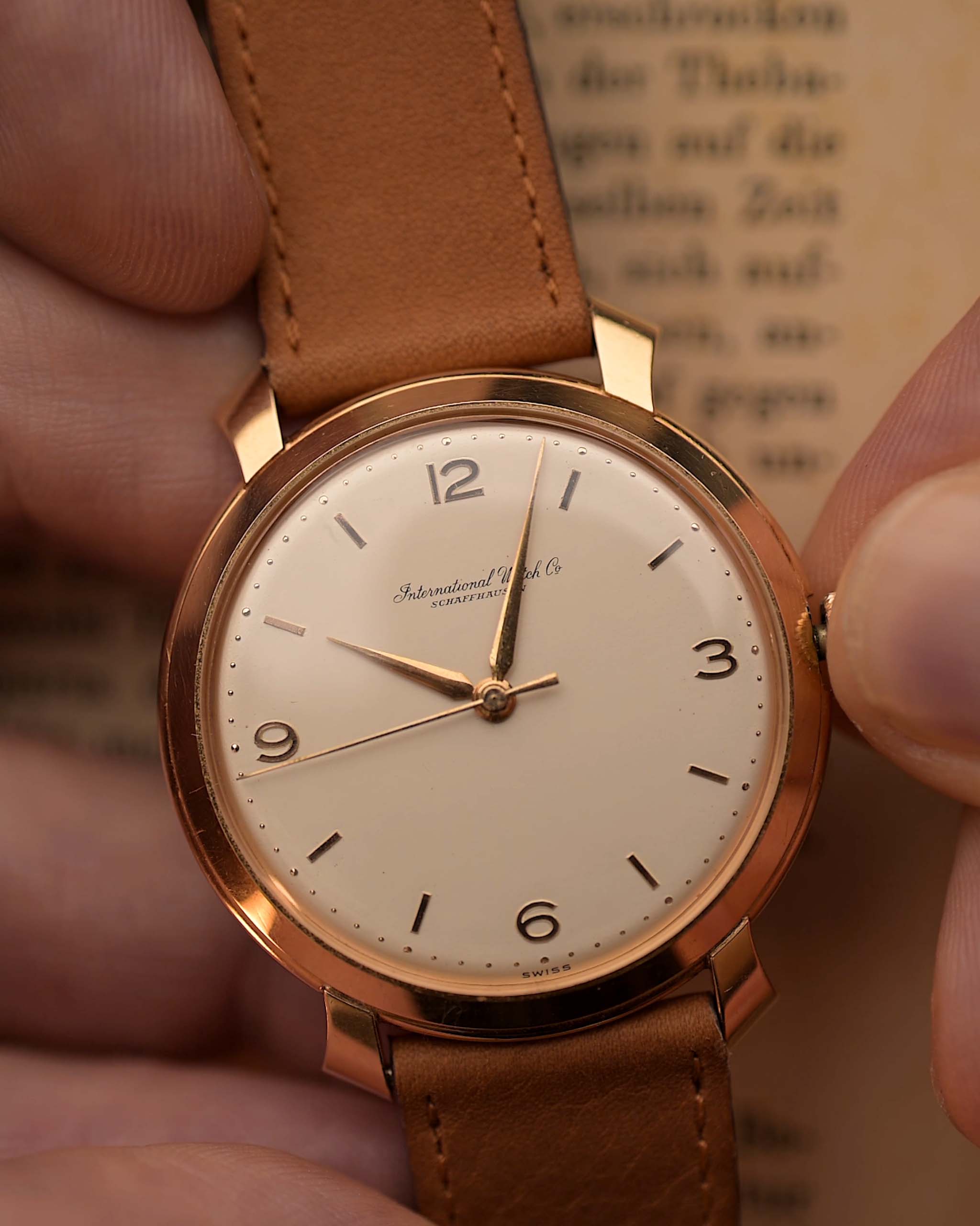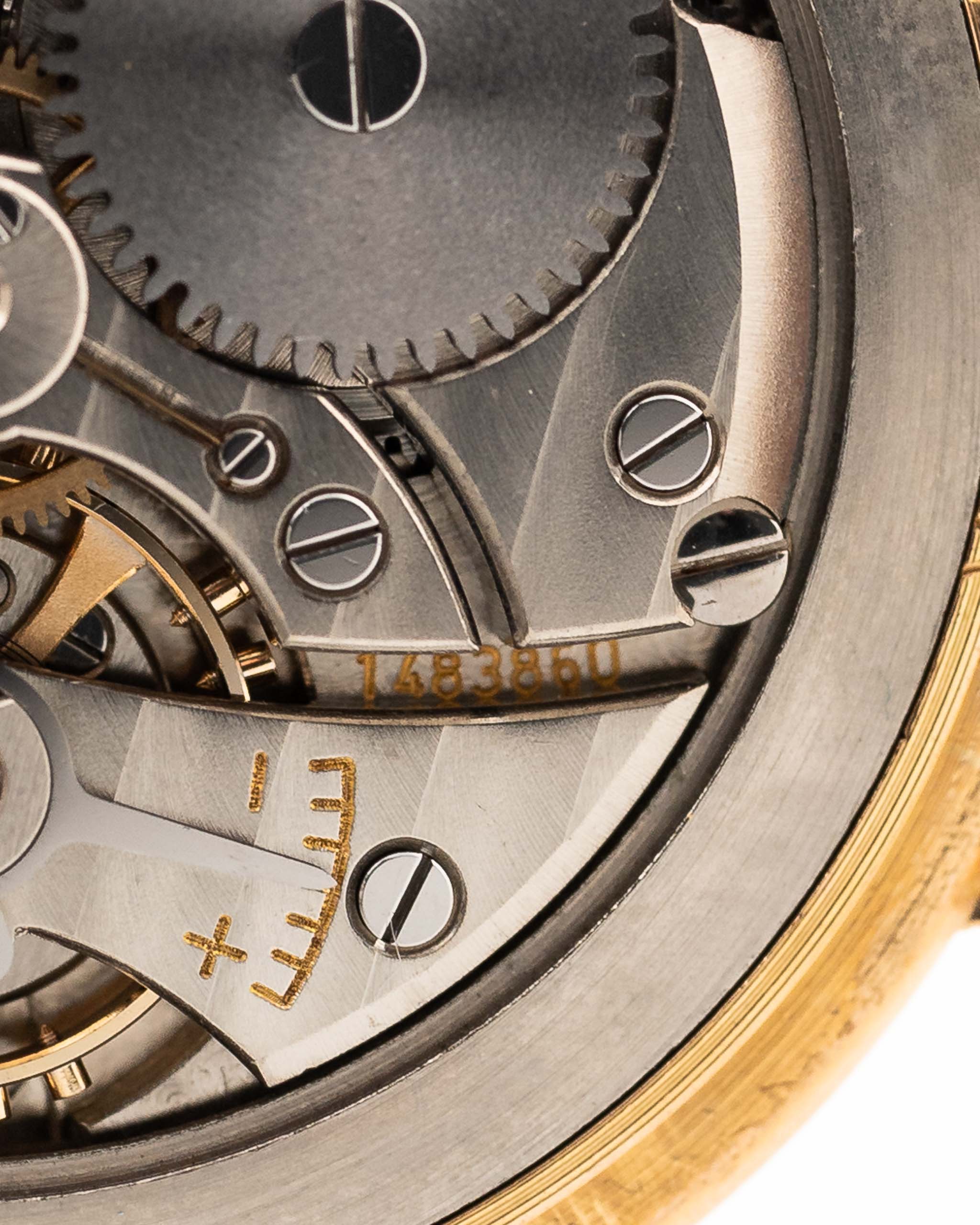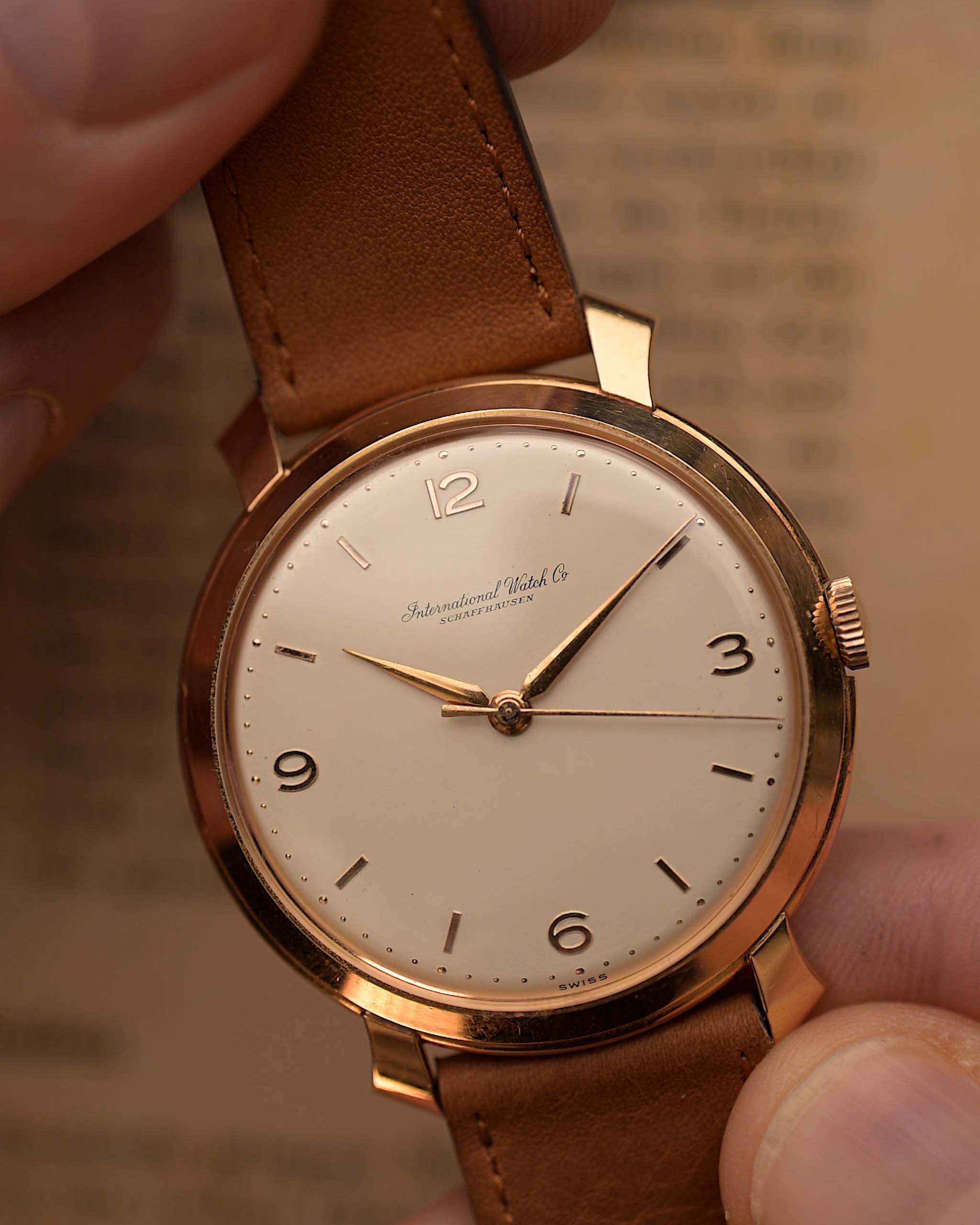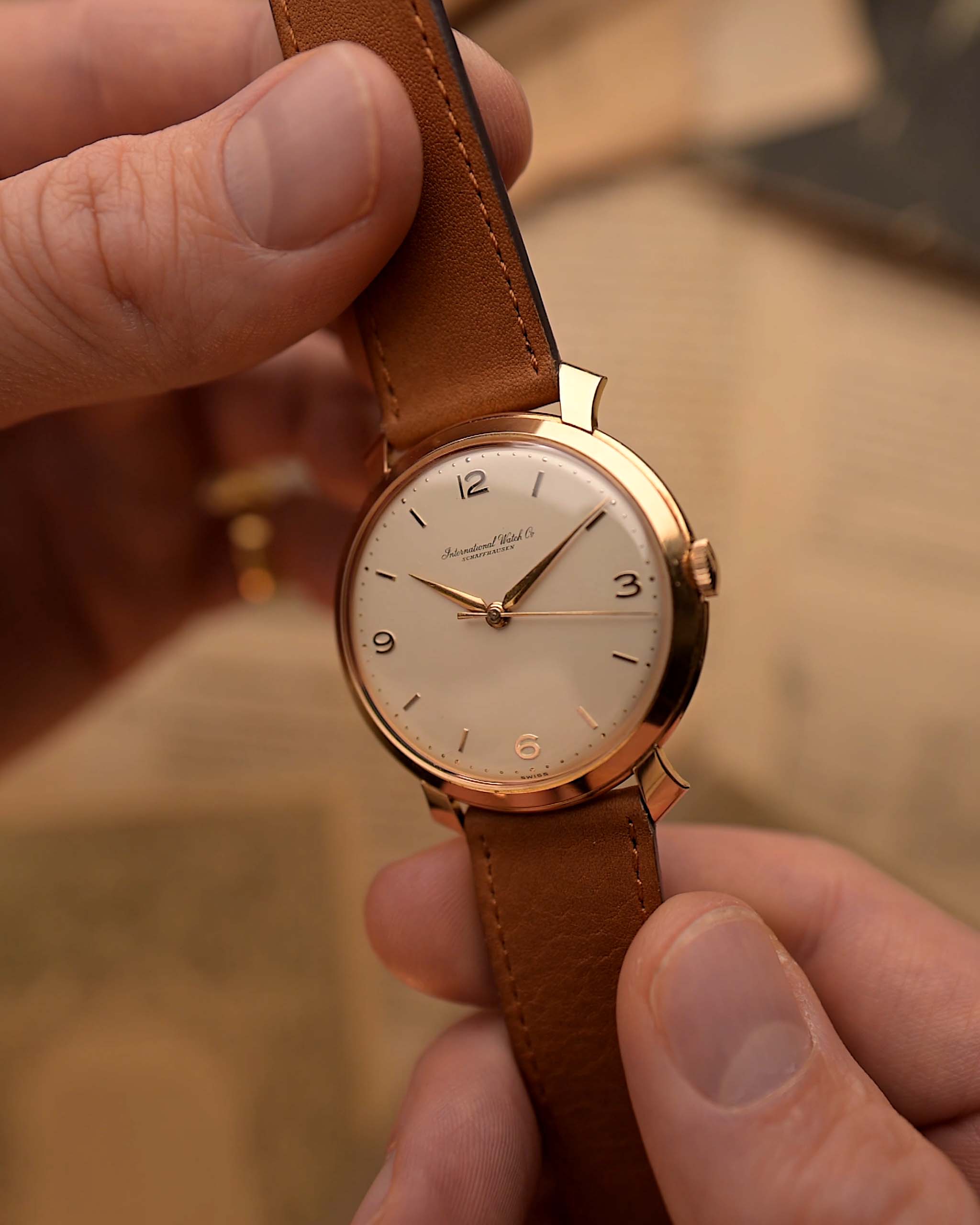 Cette rare montre habillée IWC Calibre 89 datant de 1960 offre un mélange exceptionnel de sophistication discrète et d'architecture de boîtier frappante. Réalisée en or rose 18 carats, elle se distingue par ses cornes sculpturales en forme d'aileron de requin, qui confèrent une touche architecturale audacieuse à l'esthétique épurée et minimaliste.