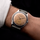 Cette montre de 37,5 mm, connue sous le nom de "Hermet" dans la communauté des collectionneurs, est en parfait état et possède l'un des plus rares cadrans saumon.