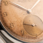 Cette IWC surdimensionnée, que l'on a rarement vue, est un merveilleux exemple de l'élégance intemporelle des montres-bracelets vintage des années 1940. La montre, connue sous le nom de "Hermet", possède un fond de boîtier hermétiquement fermé et une couronne encastrée qui la protègent de l'humidité et de la poussière.