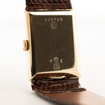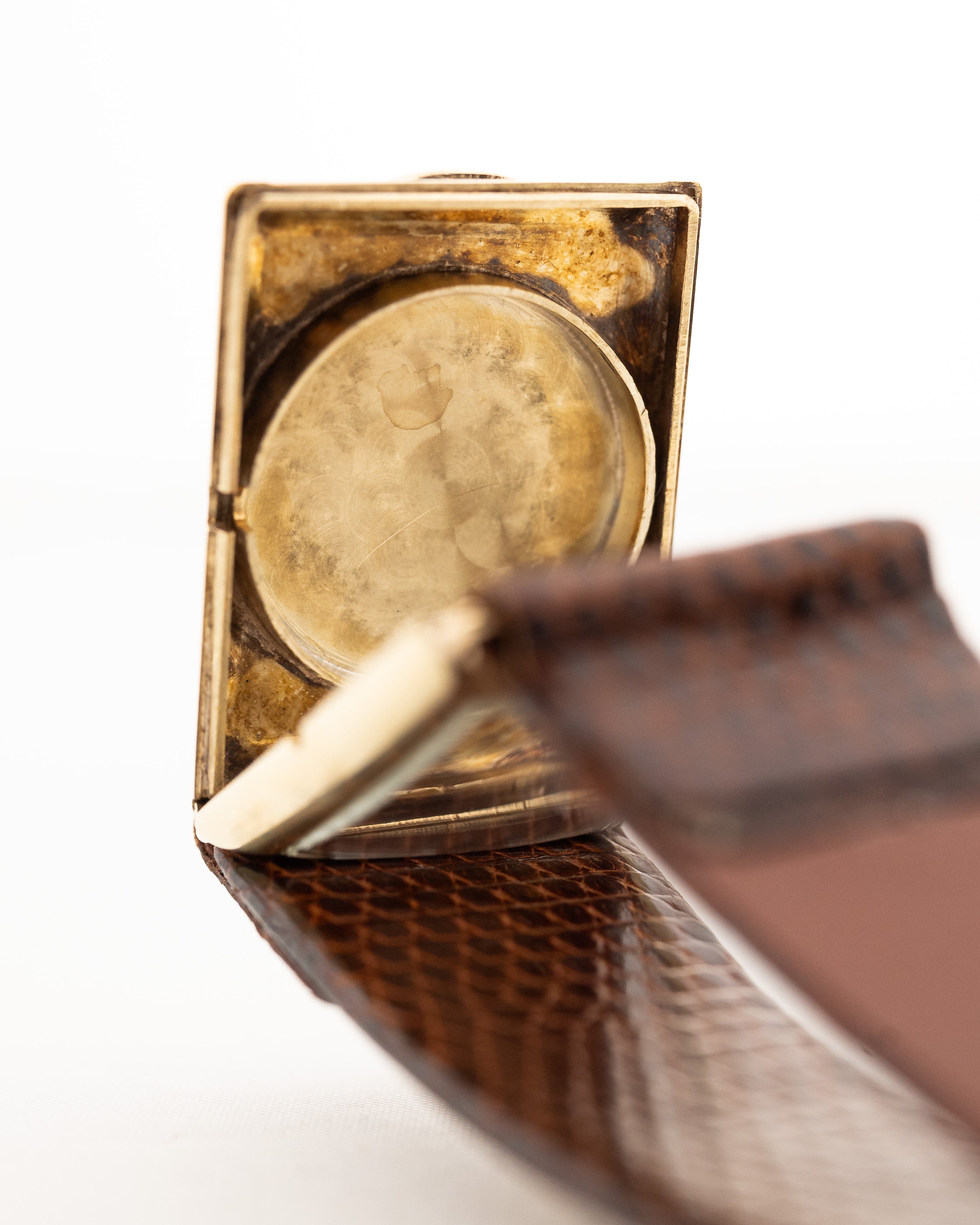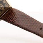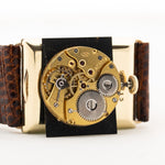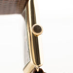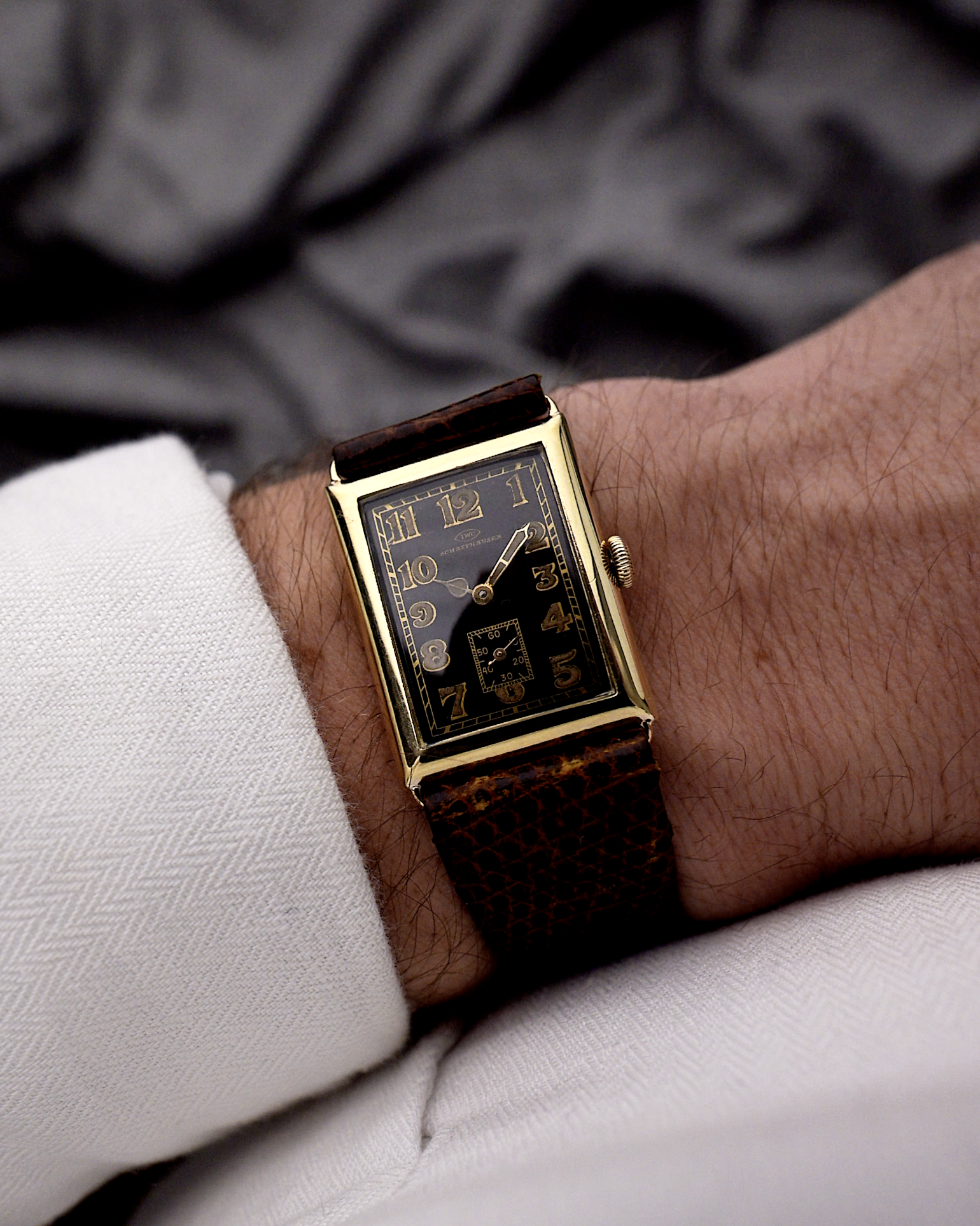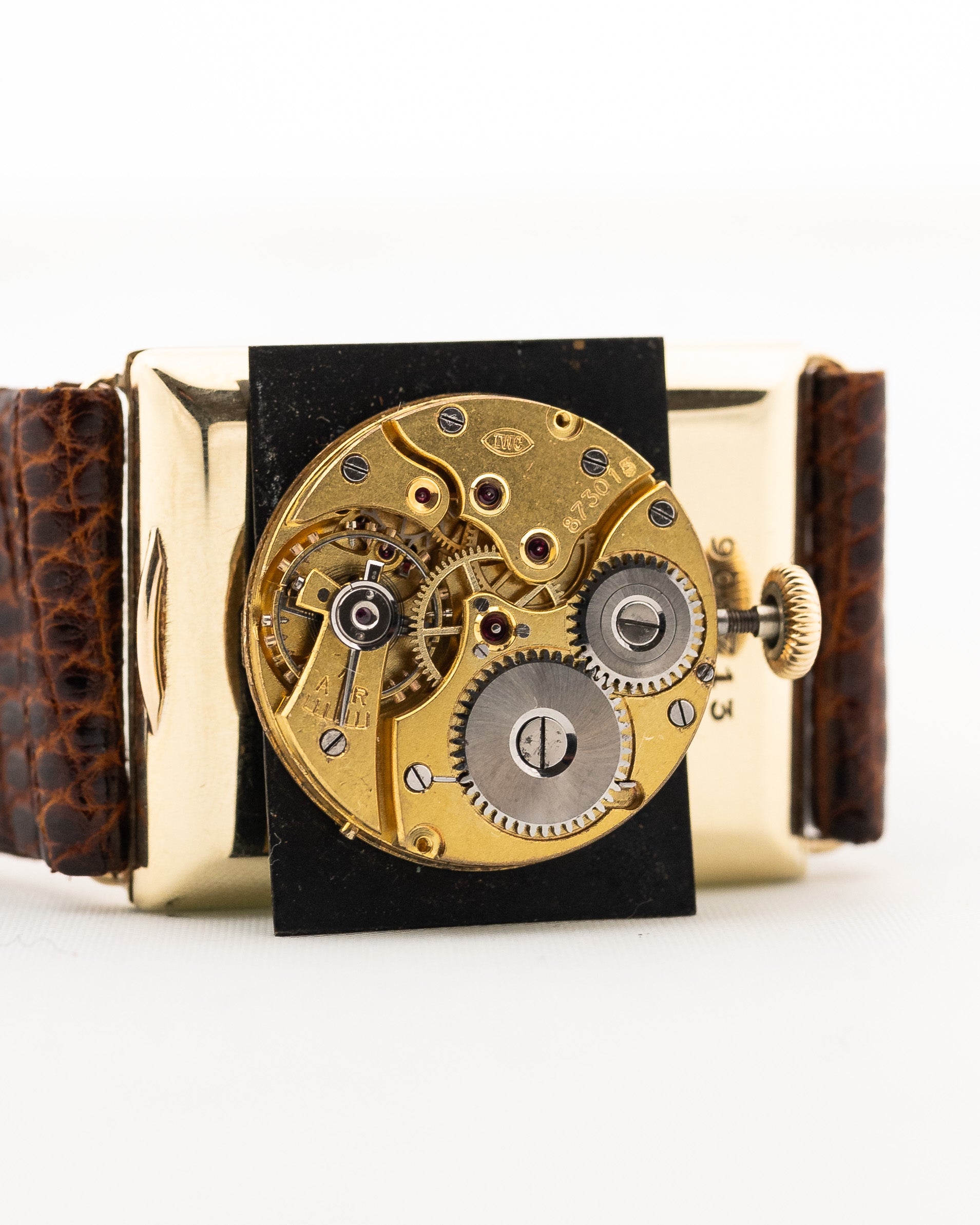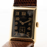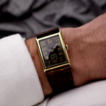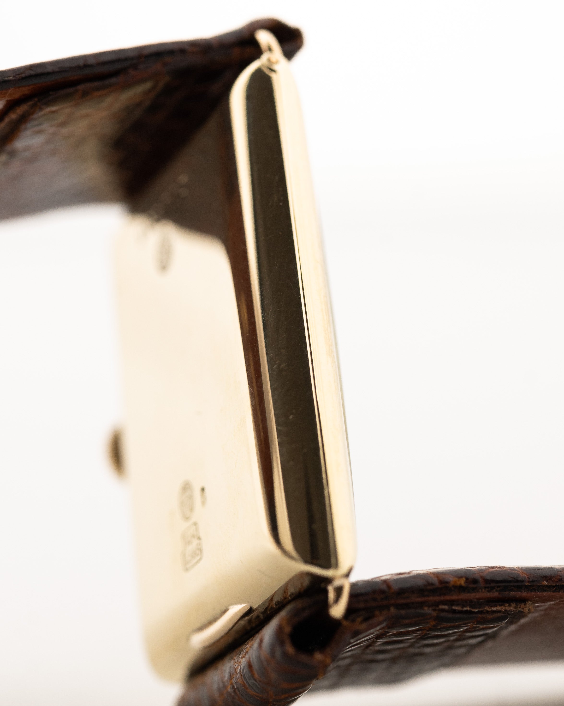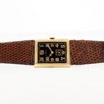 Notre exemplaire, en or jaune 14 carats et de forme rectangulaire avec des cornes fixes, restera une constante dans les collections, d'autant plus qu'il est dans un état exceptionnel et qu'il présente un cadran noir très rare avec des chiffres arabes dans le style Art déco.