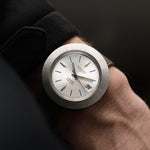 Voici la Longines Admiral oversize "flying saucer" ou "Ufo", en acier inoxydable, avec un énorme boîtier de 42 et un superbe cadran argenté avec des index bleus.