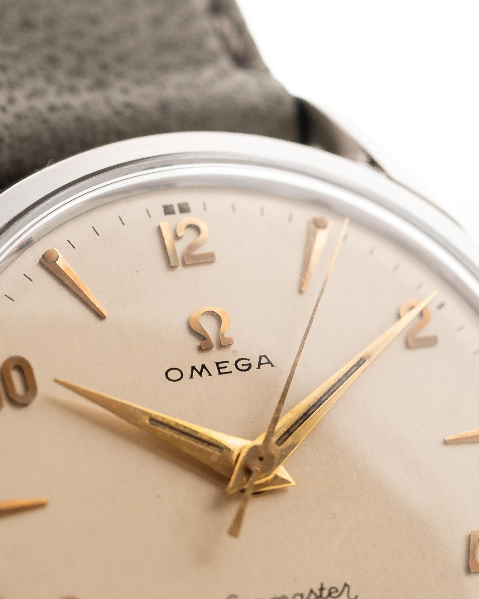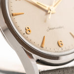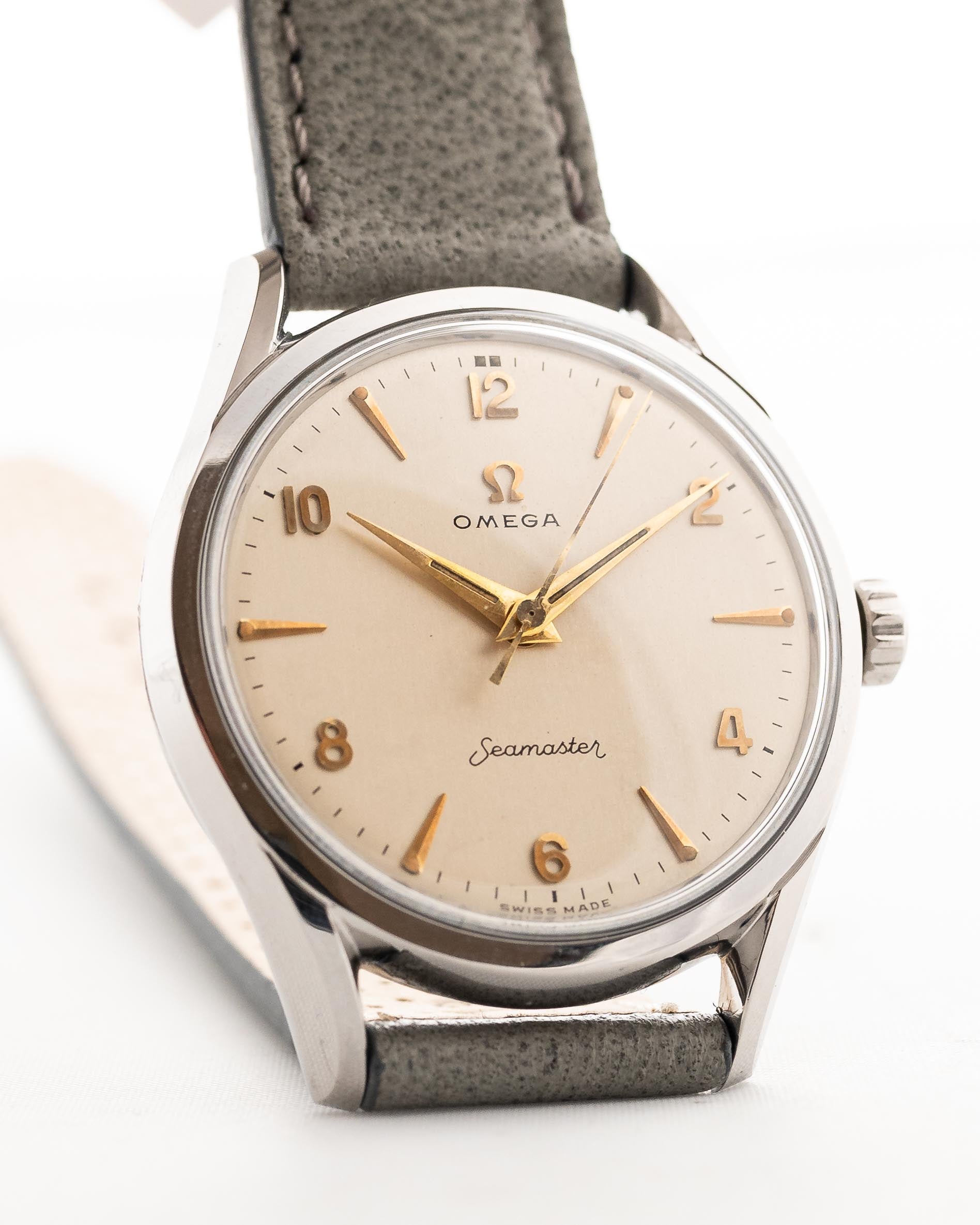 Vous voyez ici une fascinante Seamaster fabriquée par Omega en 1954. Elle est dotée d'un énorme boîtier en acier inoxydable de 36 mm avec des cornes légèrement tournées vers le bas, d'un magnifique cadran crème propre, de beaux index dorés et d'aiguilles dauphines.