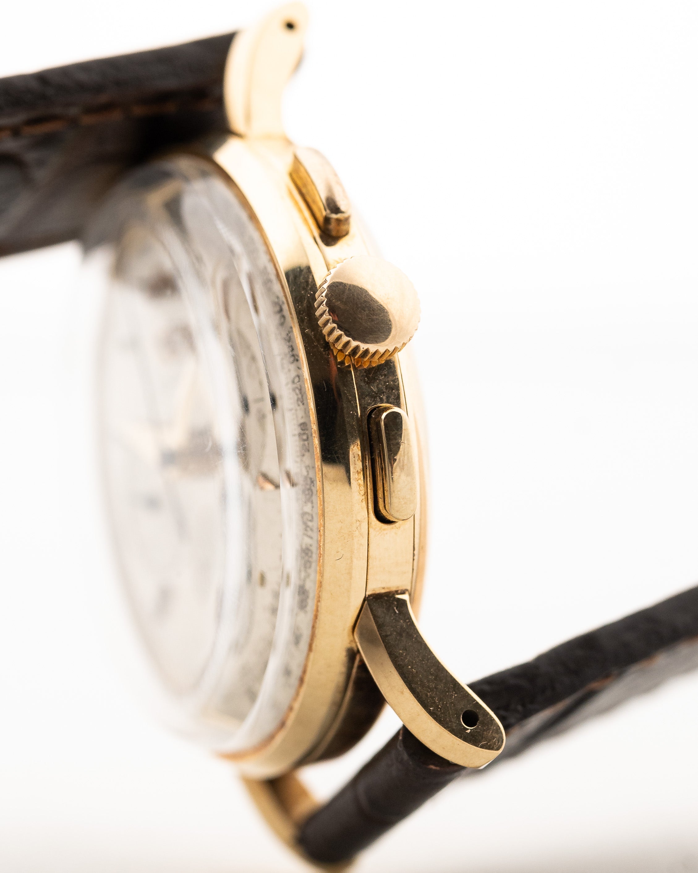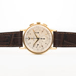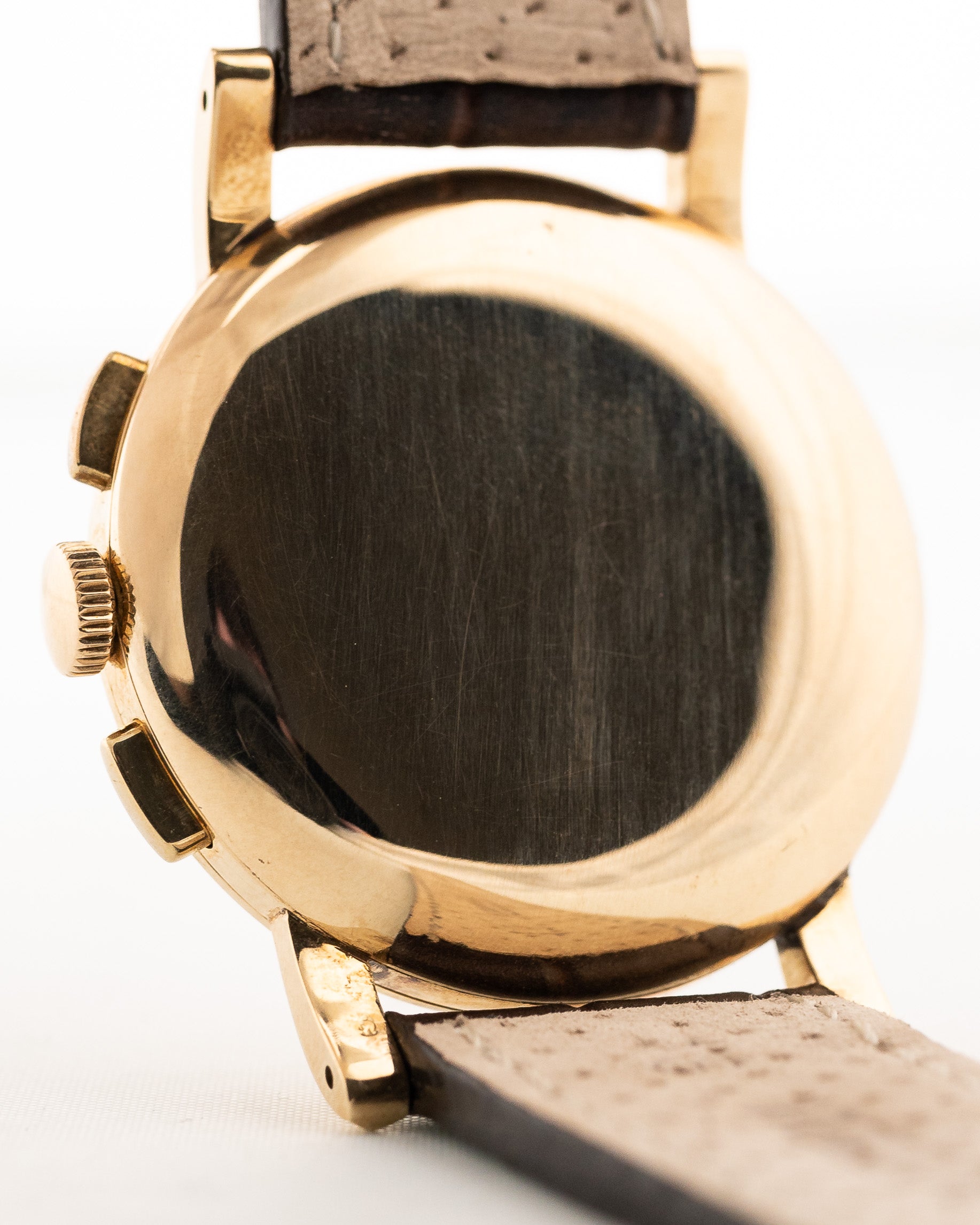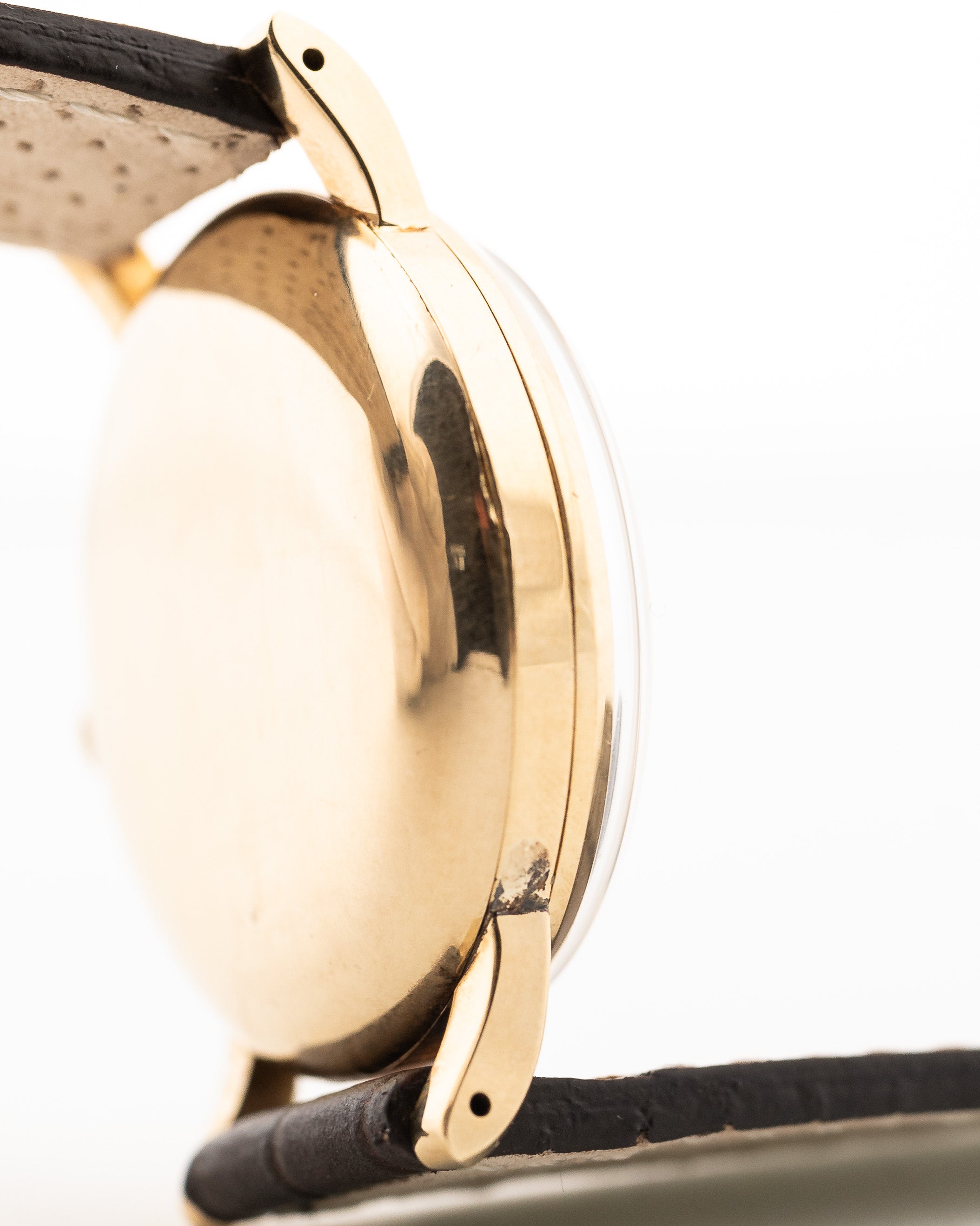 Notre montre particulière, la référence 2439, se présente dans un boîtier en or jaune de 34,5 mm avec de superbes cornes au design unique. Des accents tels que les superbes aiguilles et index en or jaune complètent l'allure classe de cette pièce.
