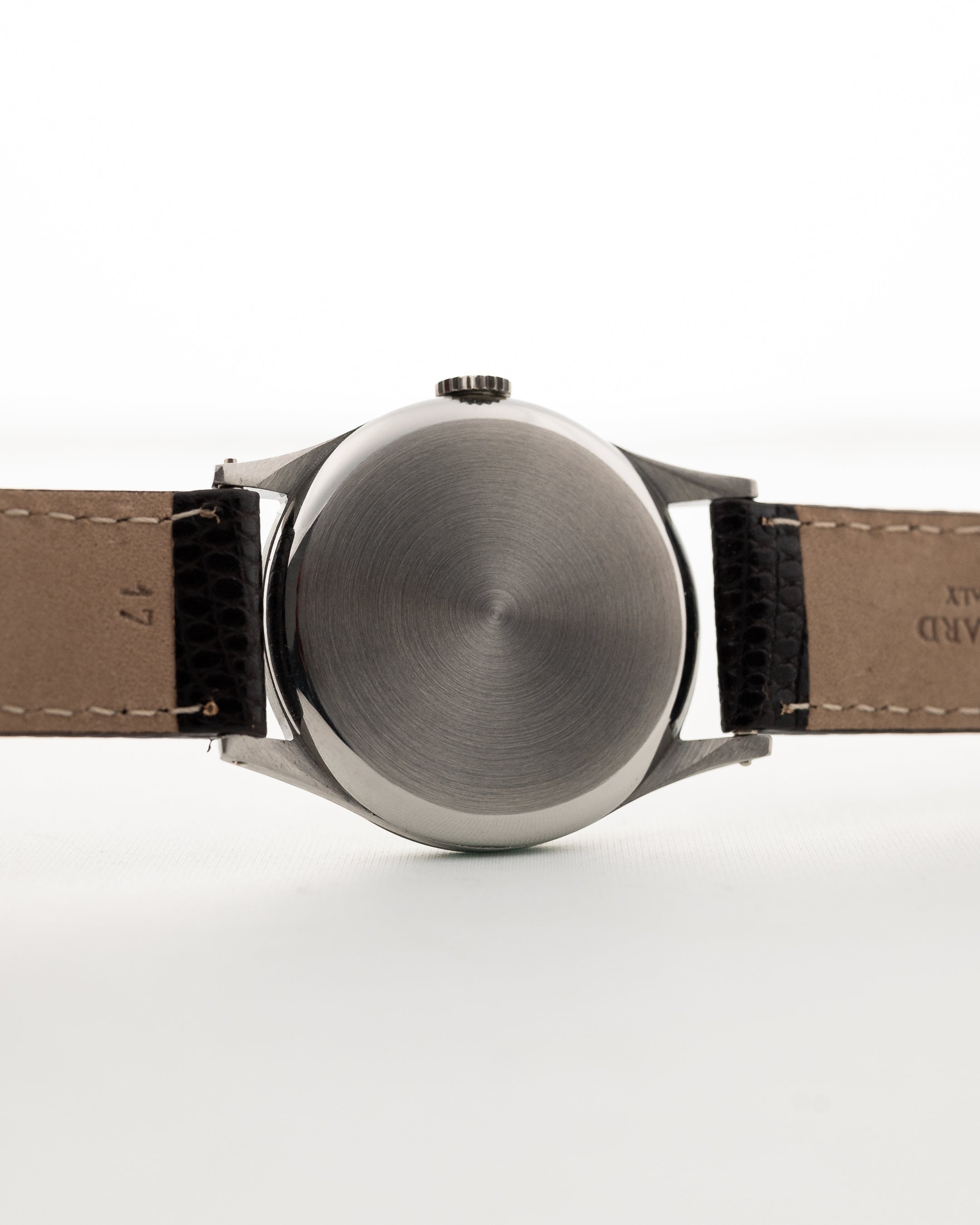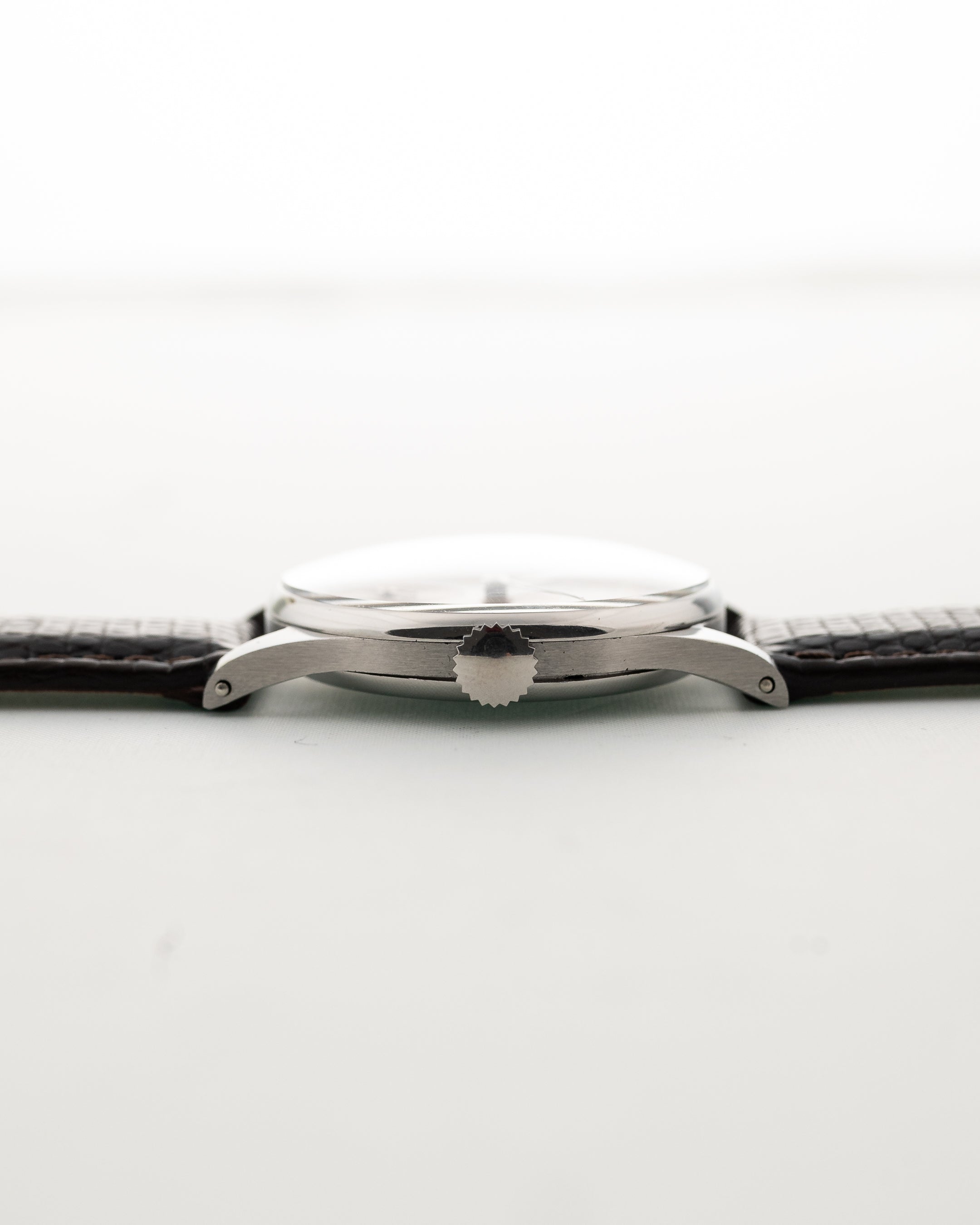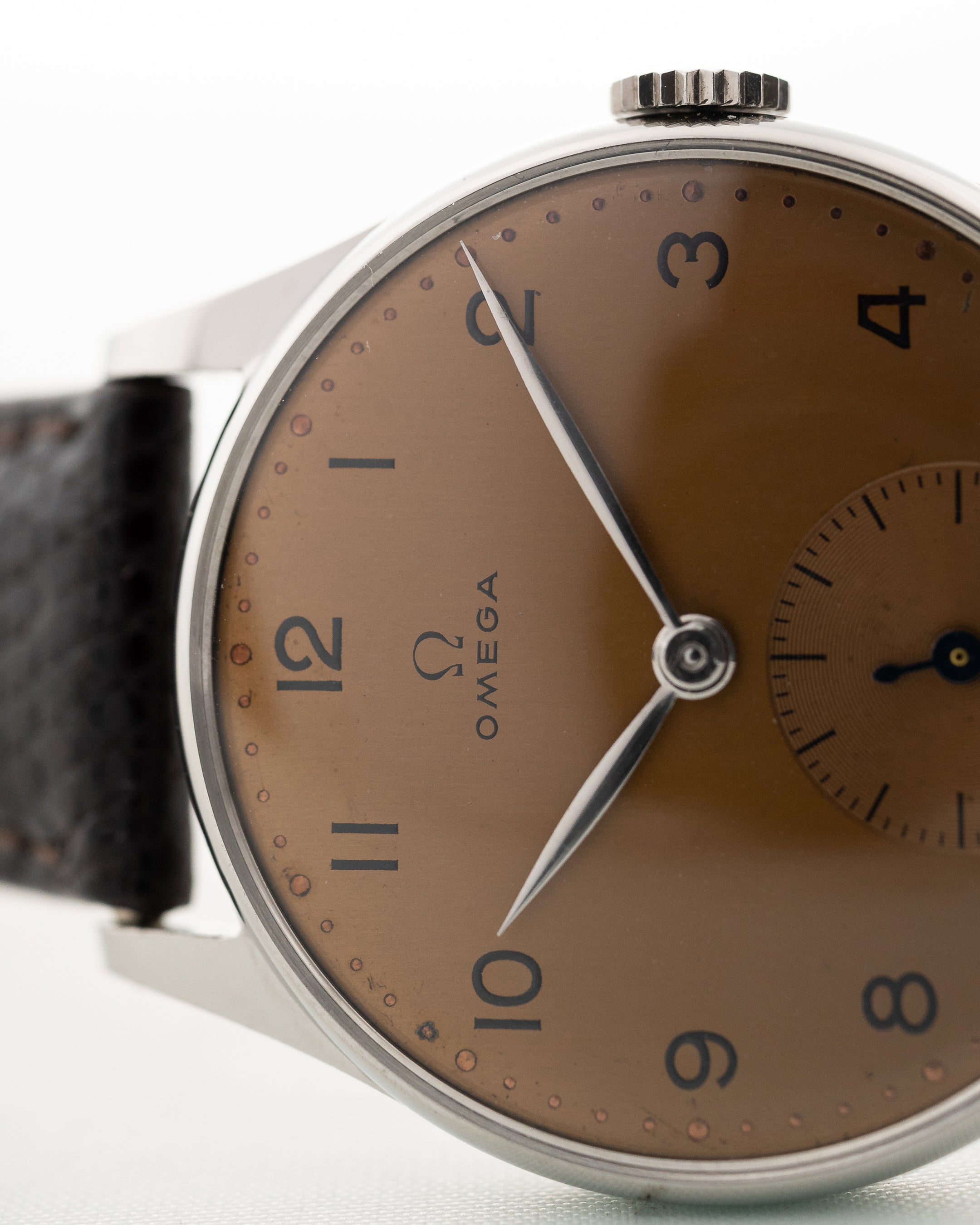 Vous pouvez voir ici une fascinante montre habillée fabriquée par Omega en 1947. Elle est dotée d'un boîtier en acier inoxydable de 33 mm, de cornes angulaires fines et simples, d'un superbe cadran cappuccino en parfait état et d'aiguilles feuilles en acier inoxydable, une pièce à couper le souffle.