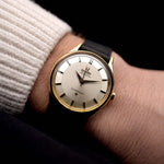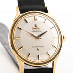 Cette Omega Constellation chronomètre automatique, compacte et magnifique, a tout ce que vous attendez d'une montre habillée : Boîtier de 34 mm en or jaune 18 carats, secondes au centre, cadran argenté à décor solaire, index bâtons avec incrustations d'onyx. Commercialisée pour la première fois en 1952, la Constellation était la réponse d'Omega à la Rolex Datejust.