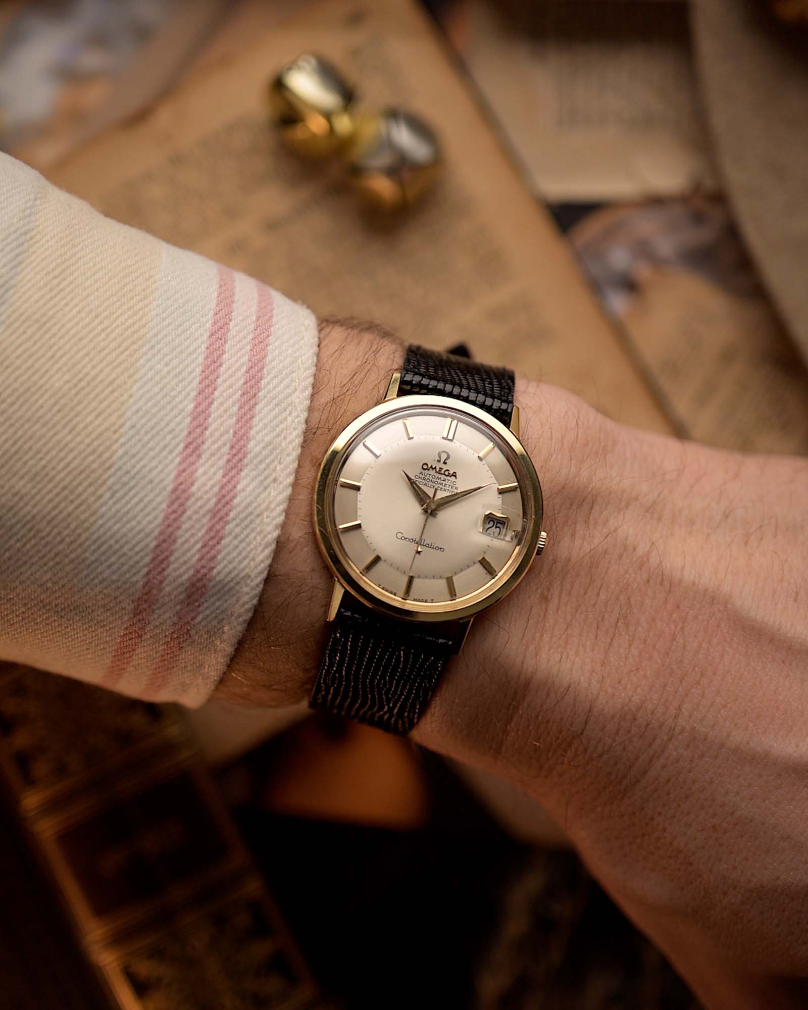Cette Omega Constellation Réf. 168.004 de 1966est un exemple parfait de sophistication vintage. Avec son boîtier en or jaune 18 carats de 35 mmet ses cornes inclinées, elle dégage une confiance discrète et témoigne d'un savoir-faire raffiné.