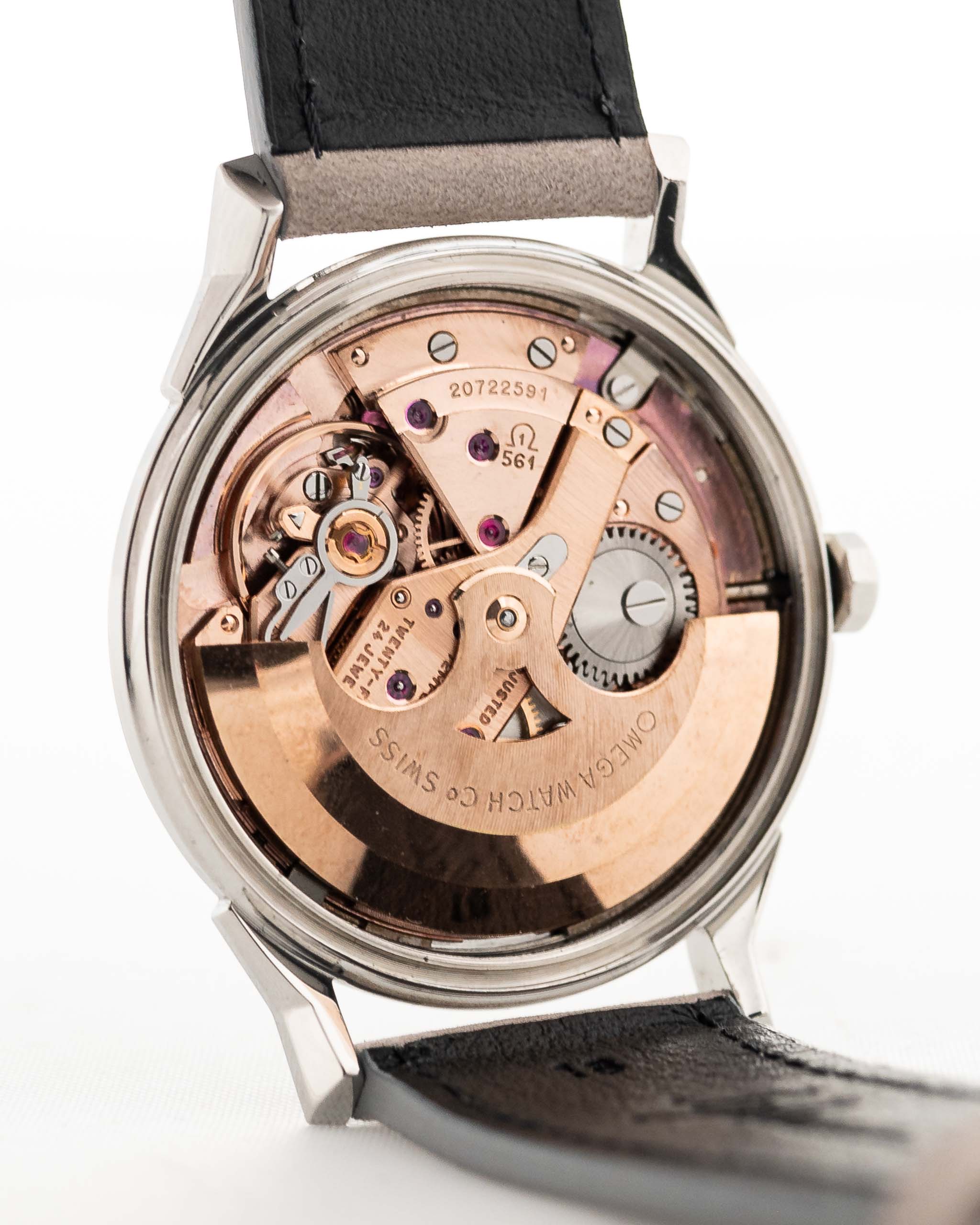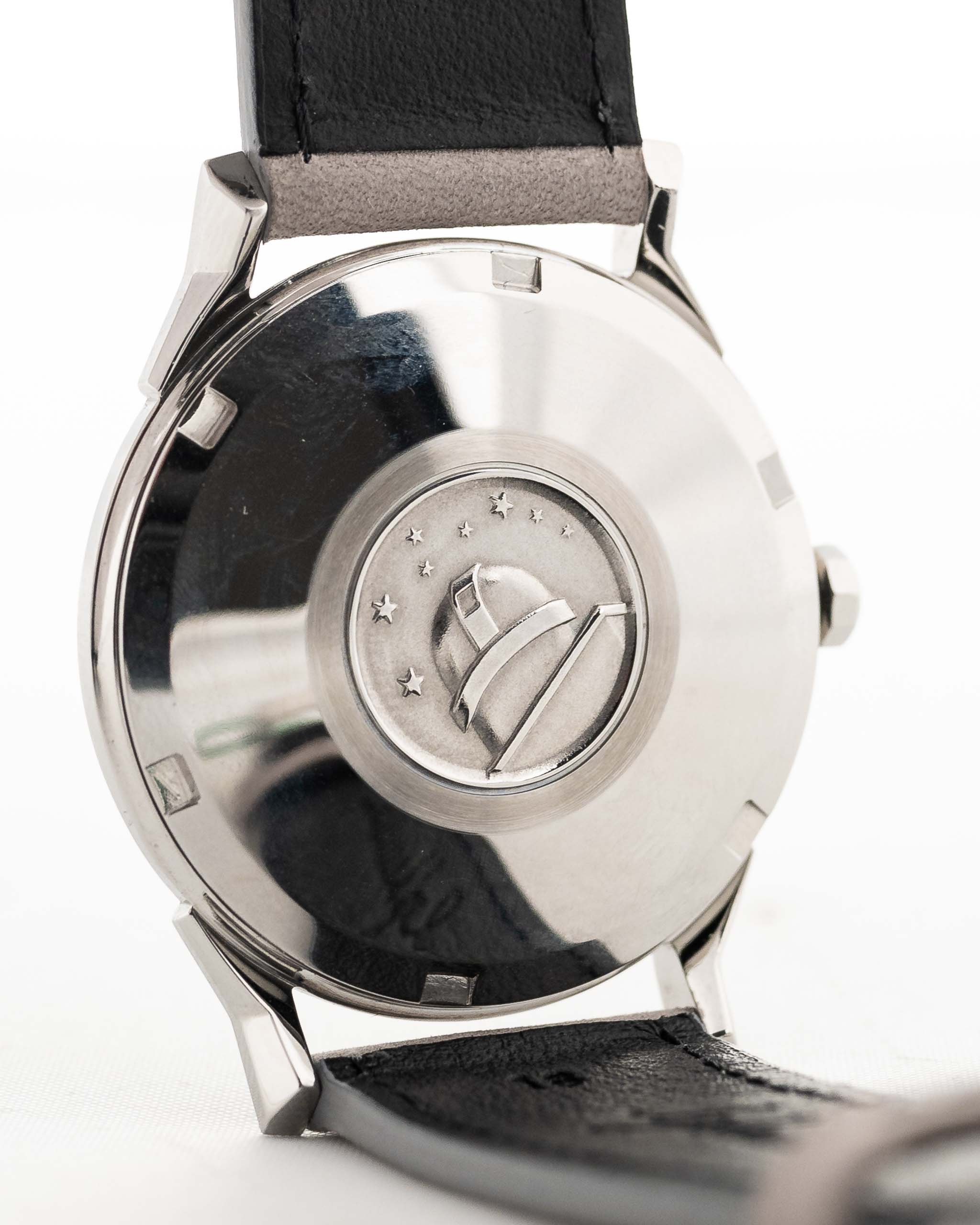 Bien proportionnée, simple et classique, cette Constellation présente un fond de boîtier vissé, le calibre 561 du chronomètre automatique Omega et de superbes cornes en forme de patte de chien.