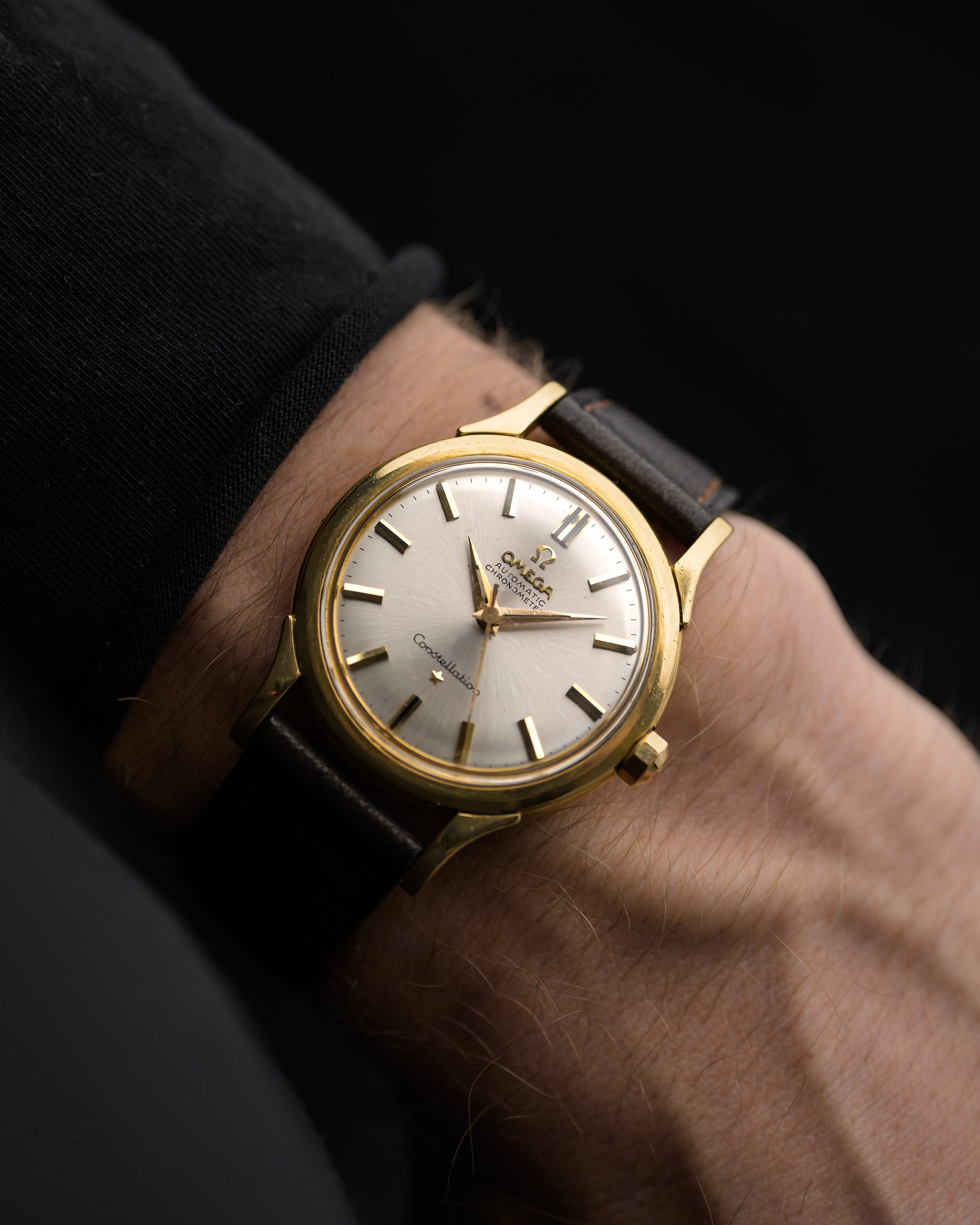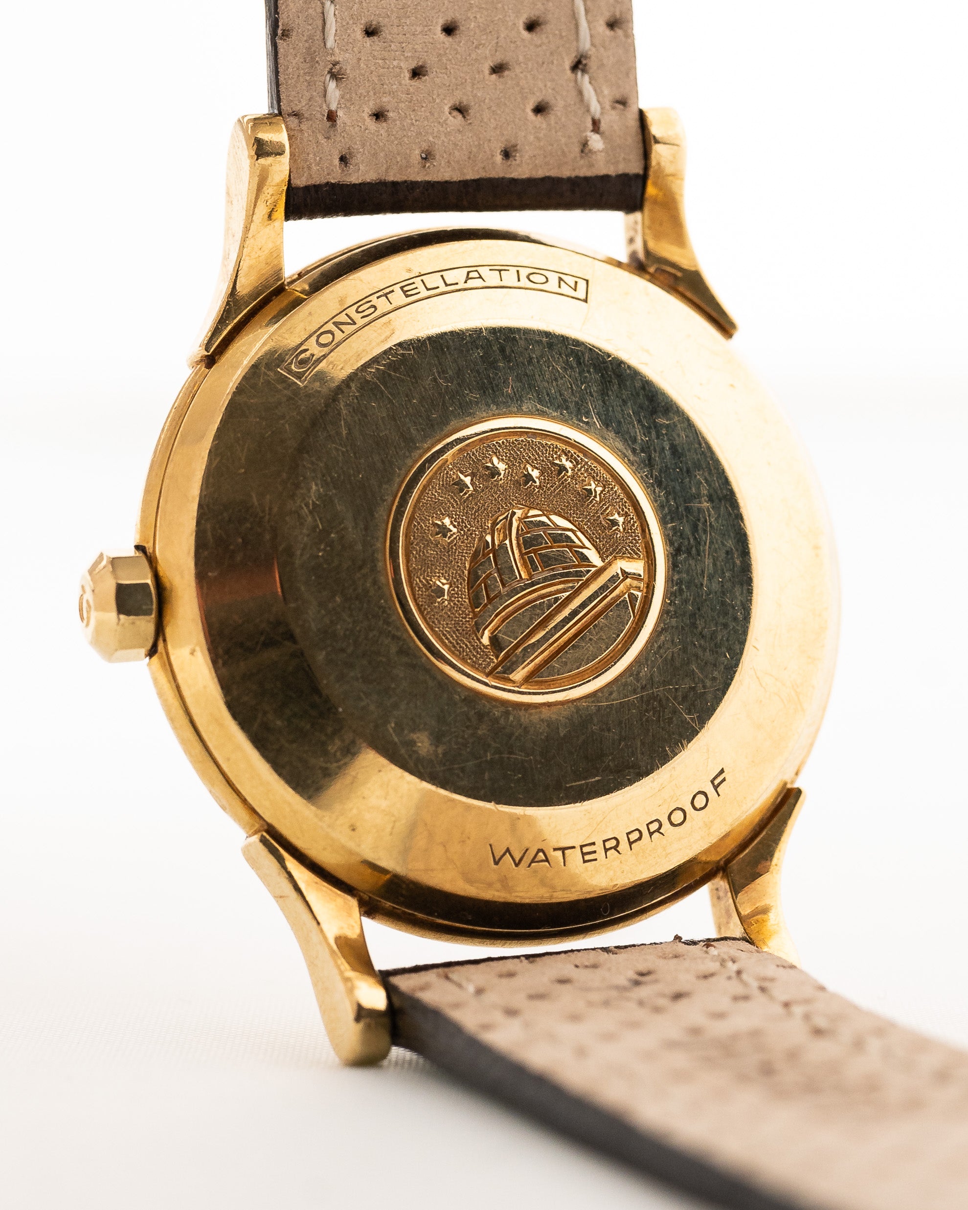 Bien proportionnée, simple et classique, cette Constellation présente un fond de boîtier vissé, le calibre 501 du chronomètre automatique Omega et de superbes cornes légèrement tournées vers le bas.