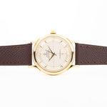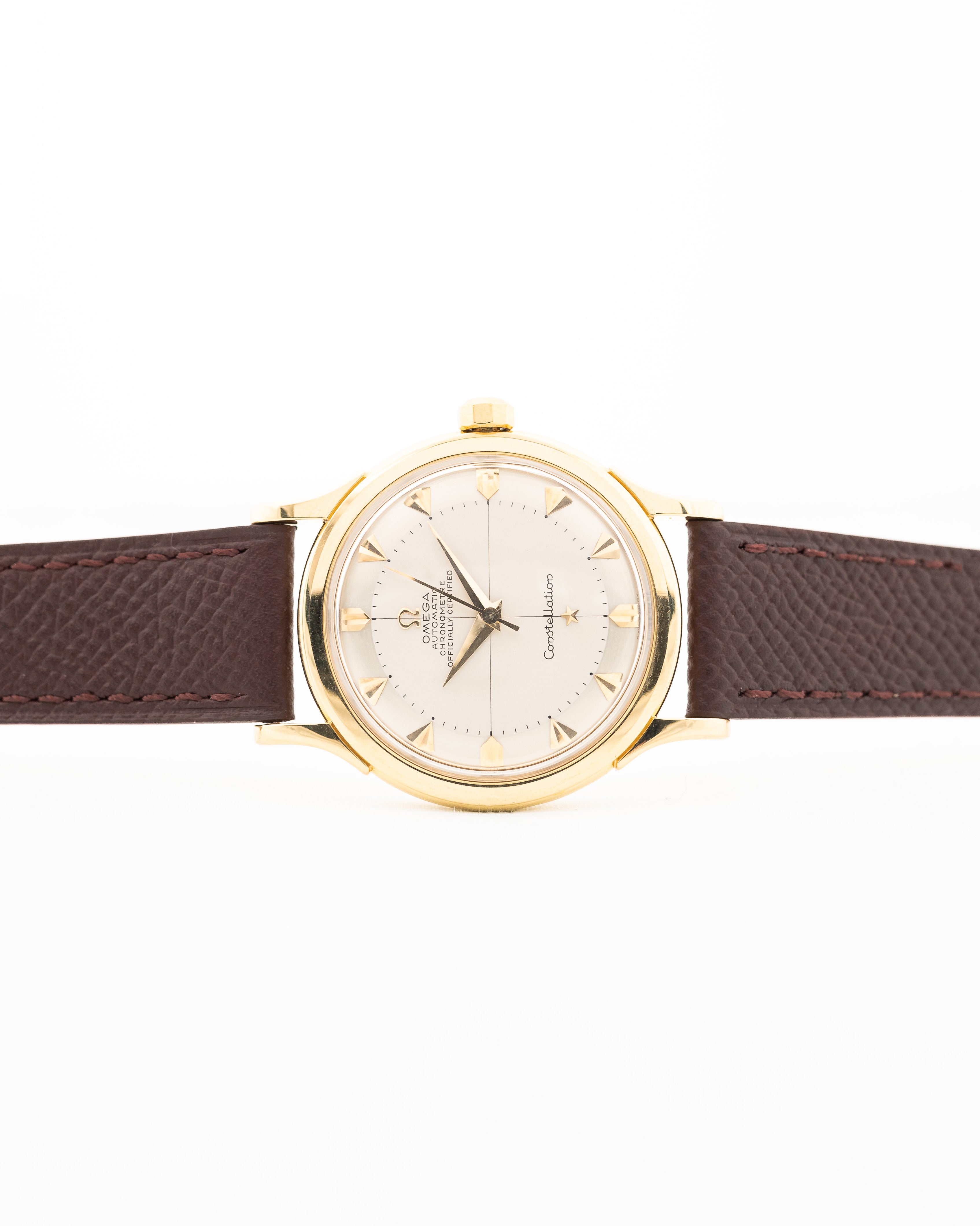 Cette Omega Constellation chronomètre automatique, compacte et magnifique, a tout ce que vous attendez d'une montre habillée : Boîtier de 35 mm en or jaune 18, seconde centrale, très beau cadran bicolore en croix avec index en forme de flèche. Commercialisée pour la première fois en 1952, la Constellation était la réponse d'Omega à la Rolex Datejust.