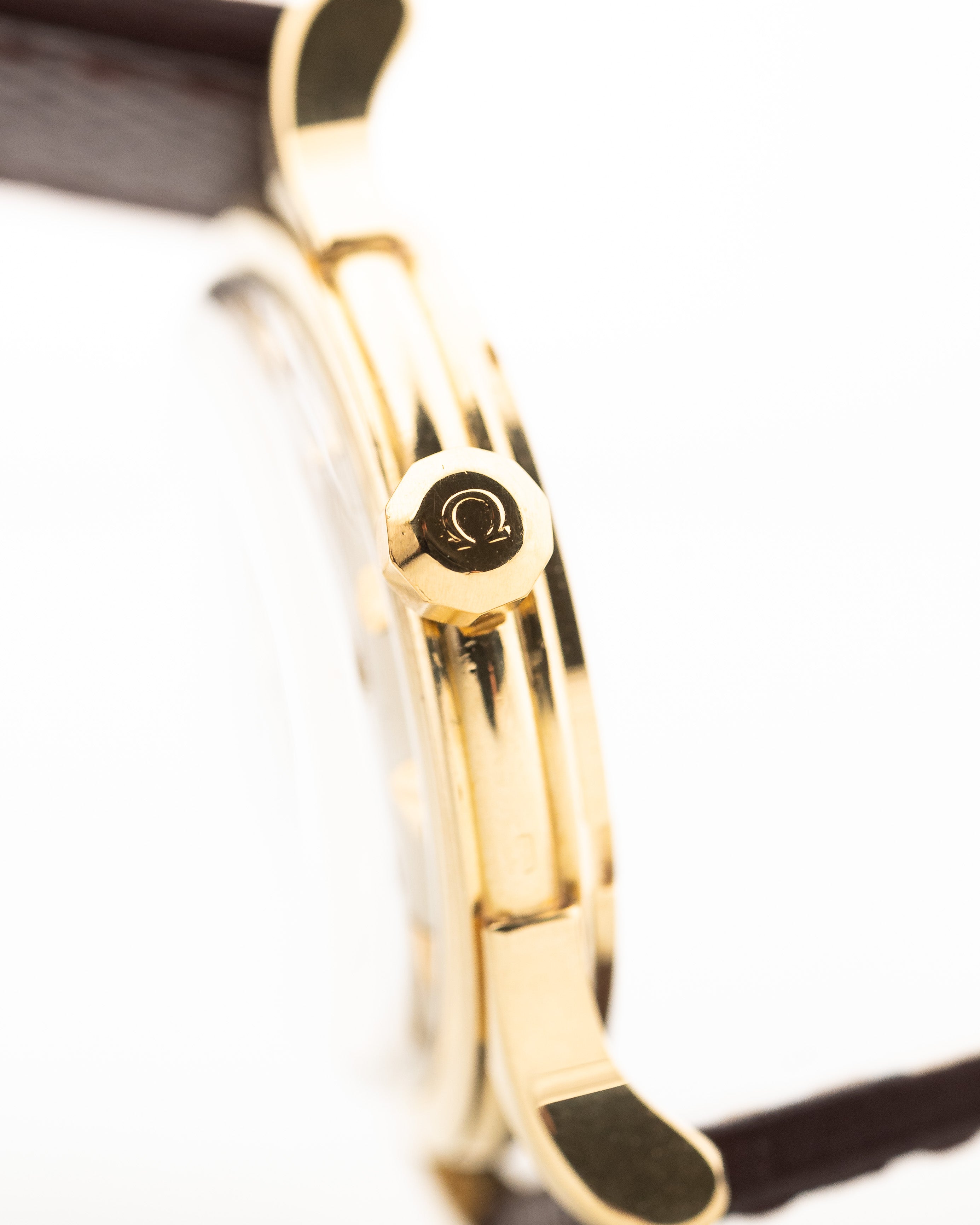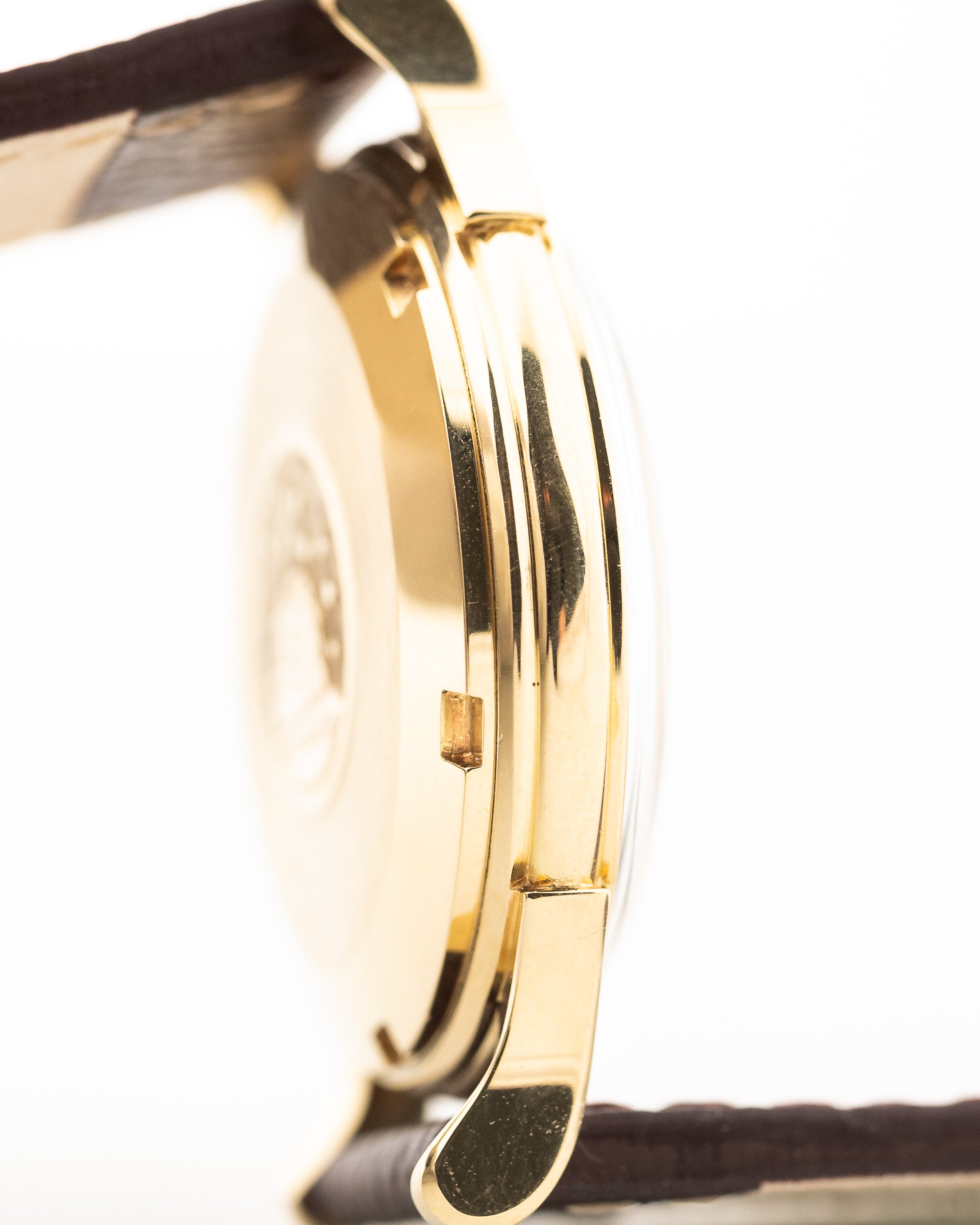 Bien proportionnée, simple et classique, cette Constellation présente un fond de boîtier vissé, le calibre 354 du chronomètre automatique Omega et de superbes cornes légèrement inclinées.