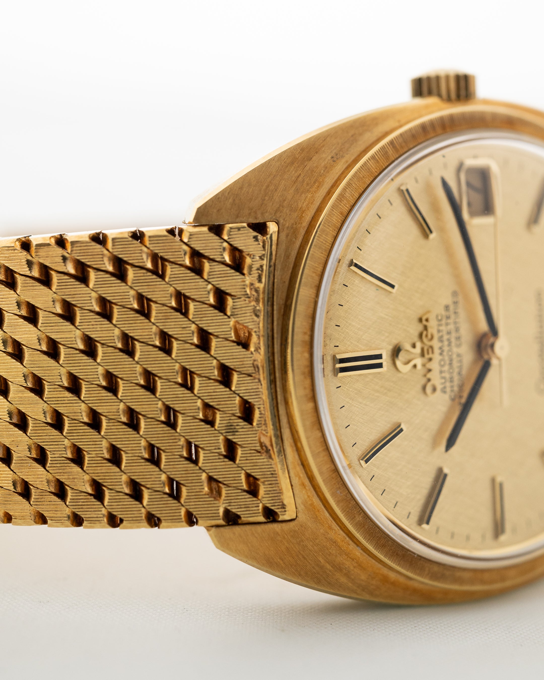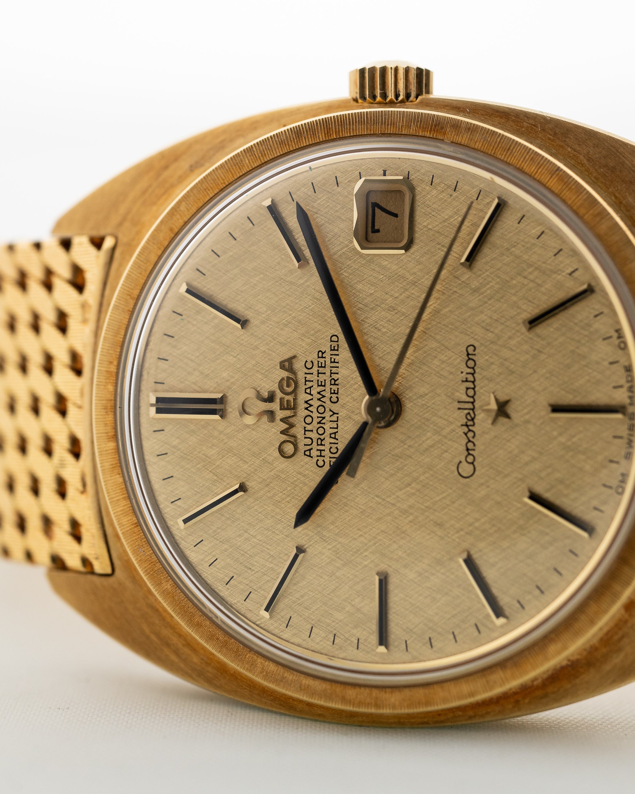 Cette belle et compacte Omega Constellation Date chronomètre automatique a tout ce que vous attendez d'une montre habillée : Un boîtier de 35 mm en or jaune 18 carats, une seconde centrale, un très beau cadran en lin 18 carats et de rares index bâtons en onyx. Commercialisée pour la première fois en 1952, la Constellation était la réponse d'Omega à la Rolex Datejust.