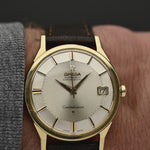 Cette Omega Constellation chronomètre automatique, compacte et magnifique, a tout ce que vous attendez d'une montre habillée : Un boîtier de 35 mm en or jaune 18 carats, une seconde centrale, un très beau cadran Pie Pan et de rares index bâtons minces avec centre en onyx. Commercialisée pour la première fois en 1952, la Constellation était la réponse d'Omega à la Rolex Datejust.