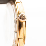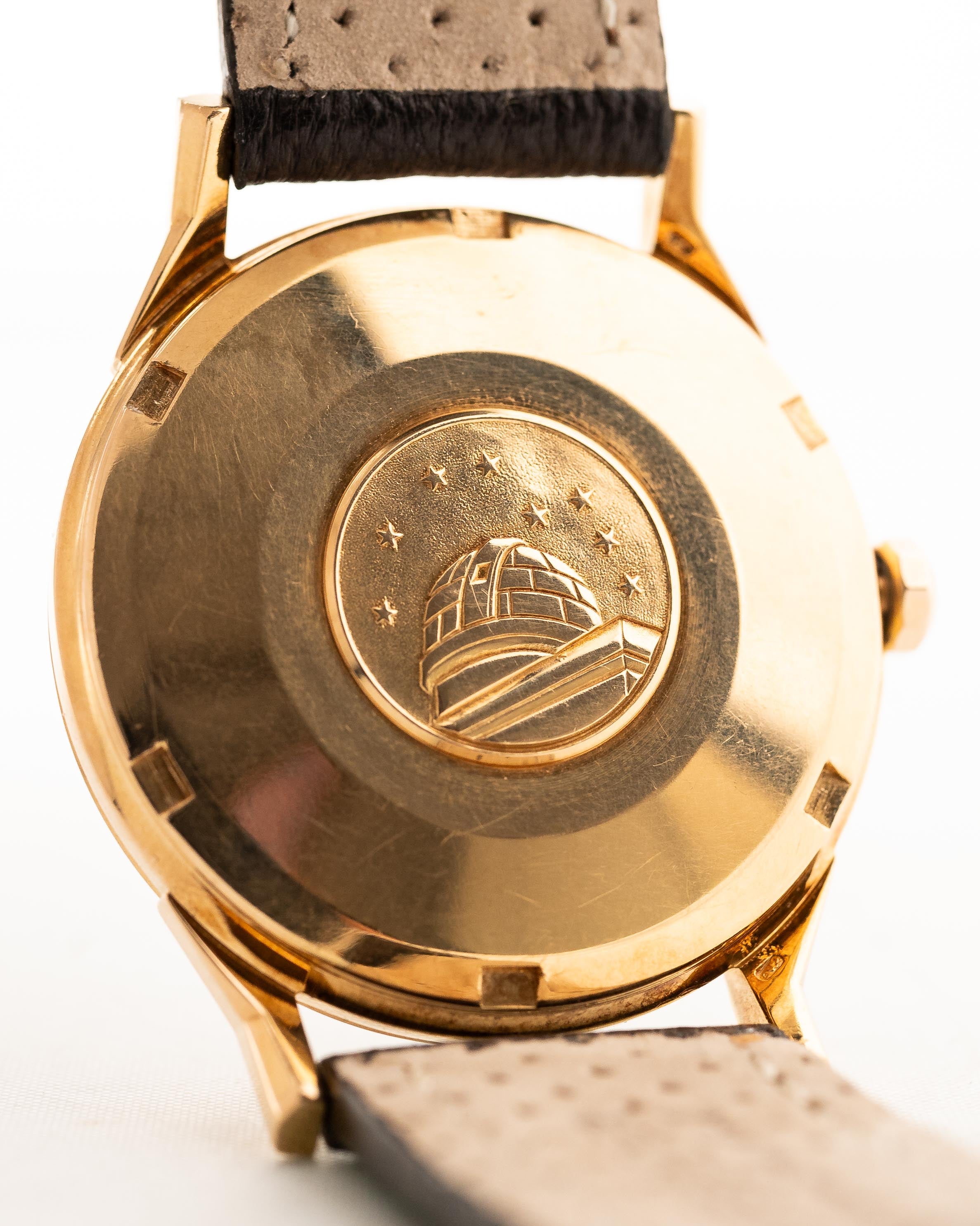 Bien proportionnée, simple et classique, cette Constellation présente un fond de boîtier vissé, le calibre 561 du chronomètre automatique Omega et de superbes cornes légèrement inclinées.