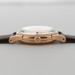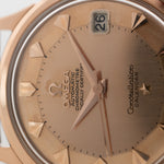 Bien proportionnée, simple et classique, cette Constellation présente un fond de boîtier vissé, le calibre 504 du chronomètre automatique Omega, de superbes cornes légèrement tournées vers le bas et un très rare cadran en or rose 18 carats.