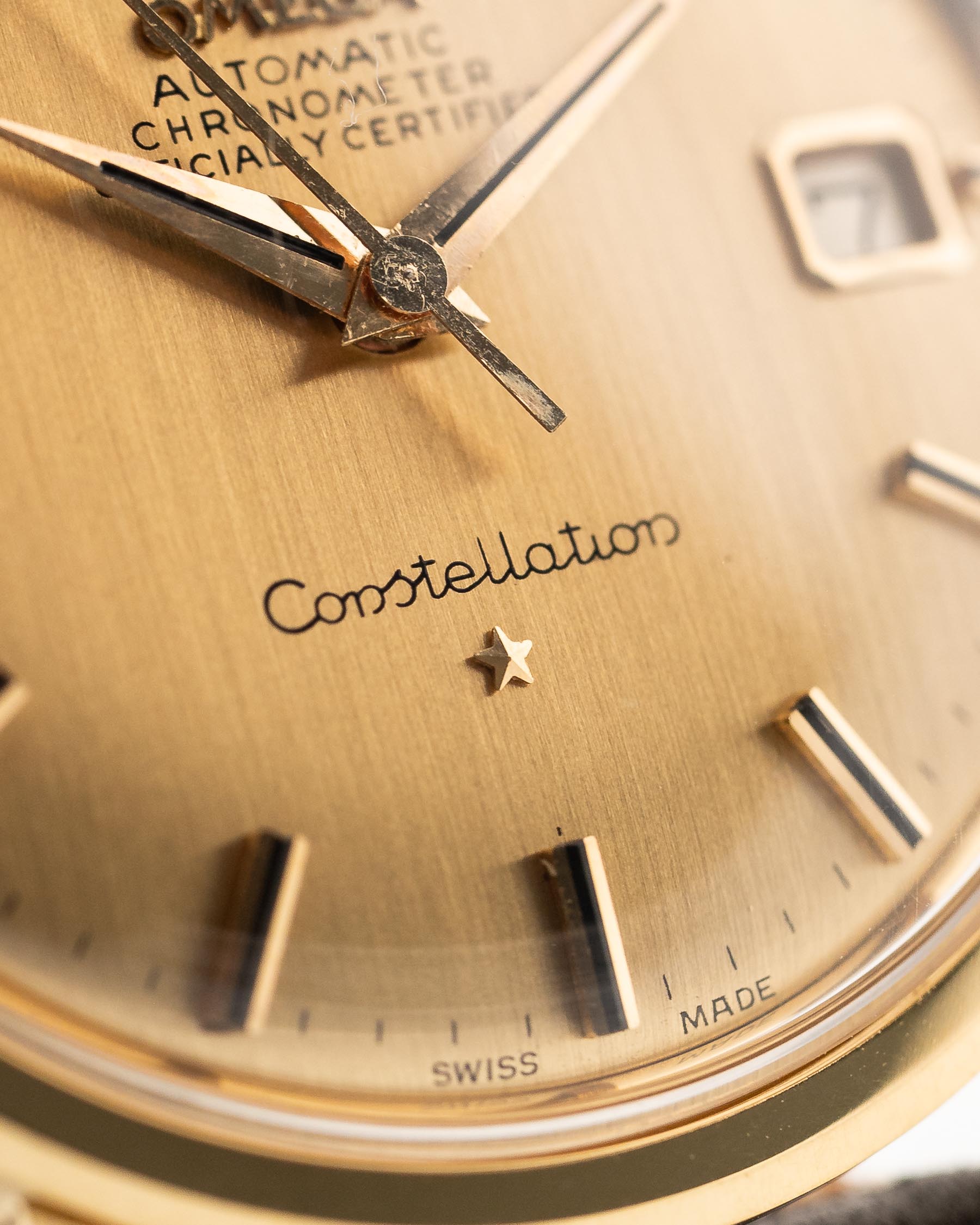 Bien proportionnée, simple et classique, cette Constellation présente un fond de boîtier vissé, le calibre 561 du chronomètre automatique Omega et de superbes cornes légèrement inclinées.