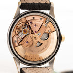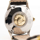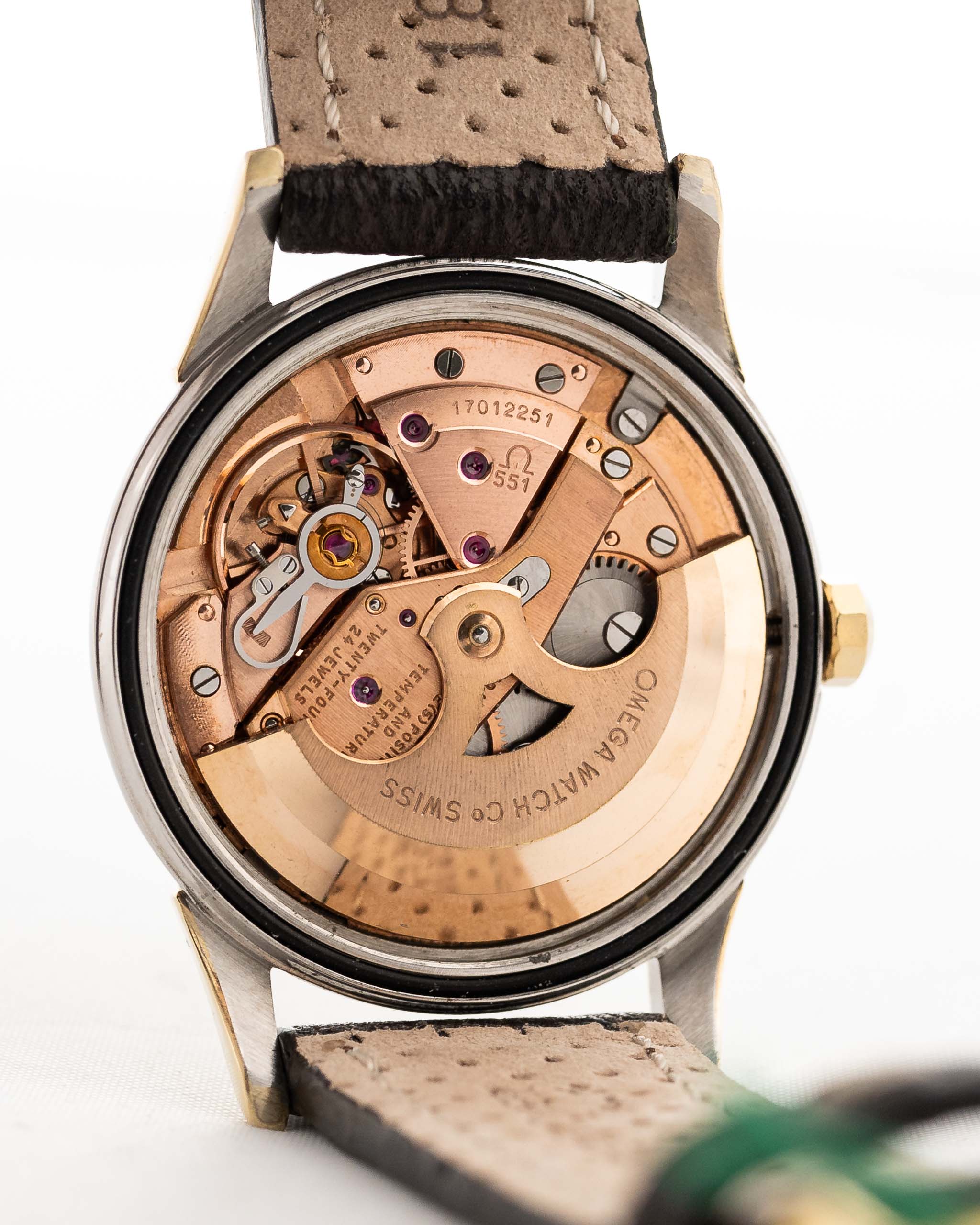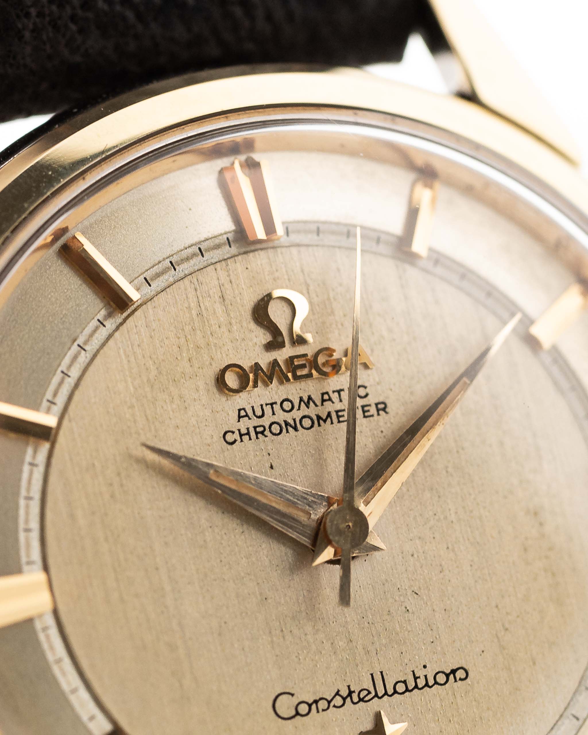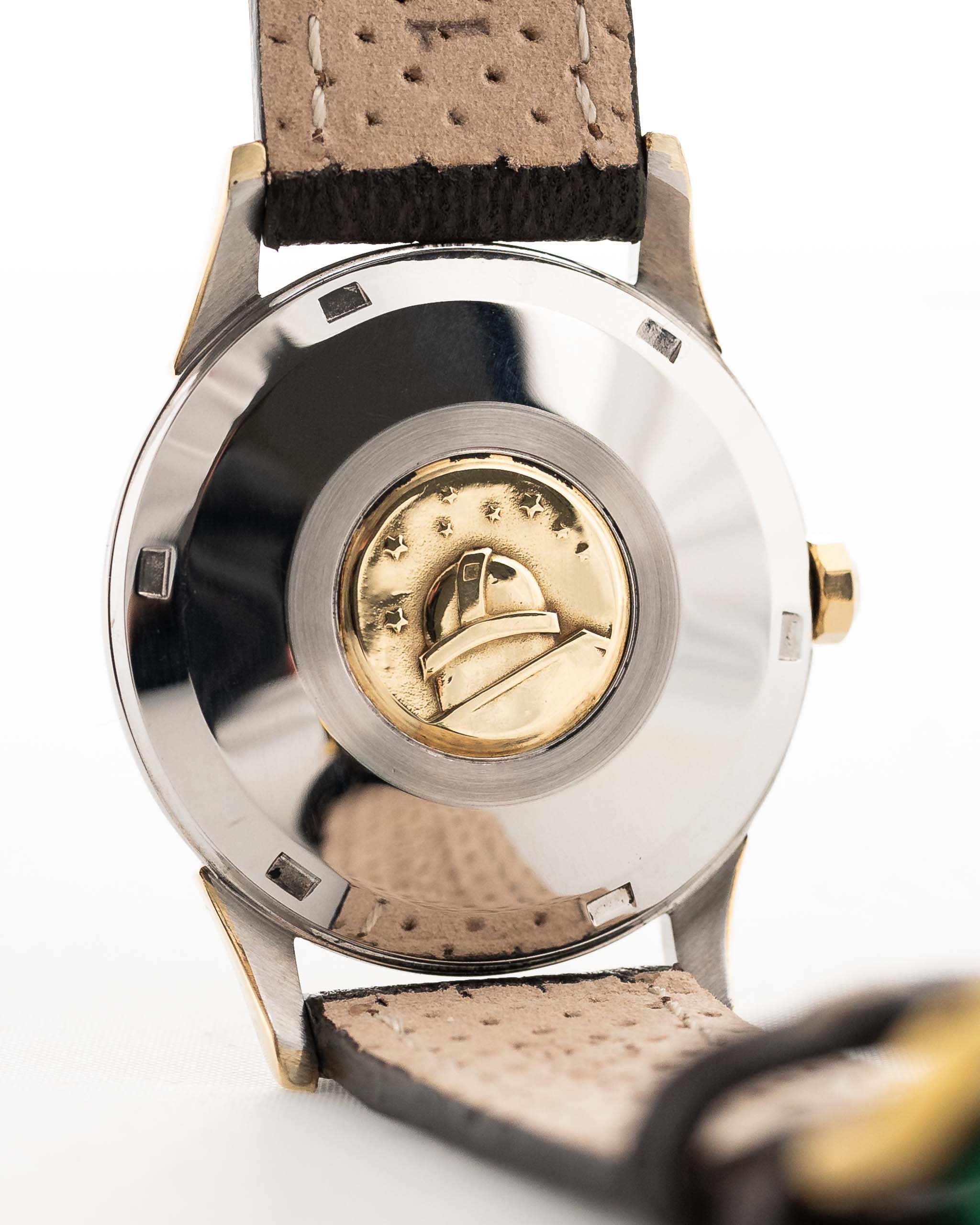 Bien proportionnée, simple et classique, cette Constellation présente un fond de boîtier vissé, le calibre 551 du chronomètre automatique Omega et de superbes cornes légèrement tournées vers le bas.
