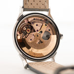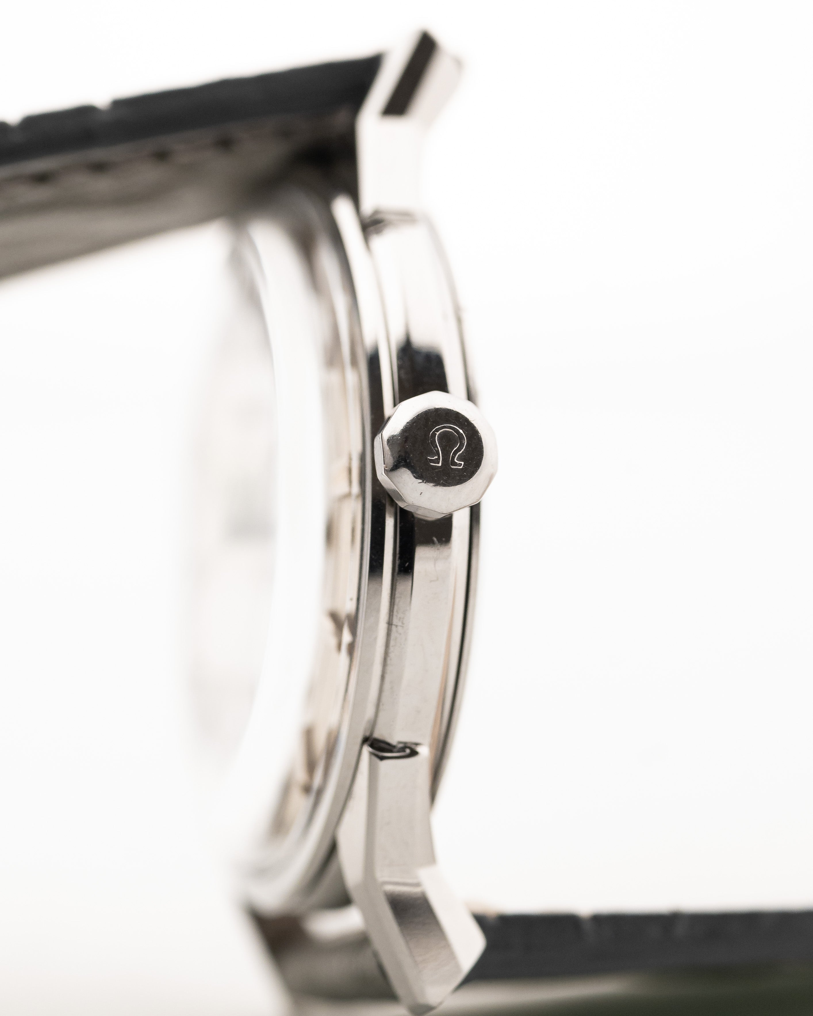 Bien proportionnée, simple et classique, cette Constellation présente un fond de boîtier vissé, le calibre 562 du chronomètre automatique Omega et de superbes cornes légèrement tournées vers le bas.