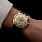 Cette Omega Constellation chronomètre automatique, compacte et magnifique, a tout ce que vous attendez d'une montre habillée : Boîtier plaqué or de 34 mm, seconde centrale, cadran champagne avec index bâtons. Commercialisée pour la première fois en 1952, la Constellation était la réponse d'Omega à la Rolex Datejust.