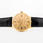 Cet exemple n'est pas seulement beau, il est aussi substantiel. Dotée d'un boîtier en or jaune de 35 mm, de cornes droites et d'un magnifique cadran en or jaune avec index en onyx, cette montre est vraiment incomparable.