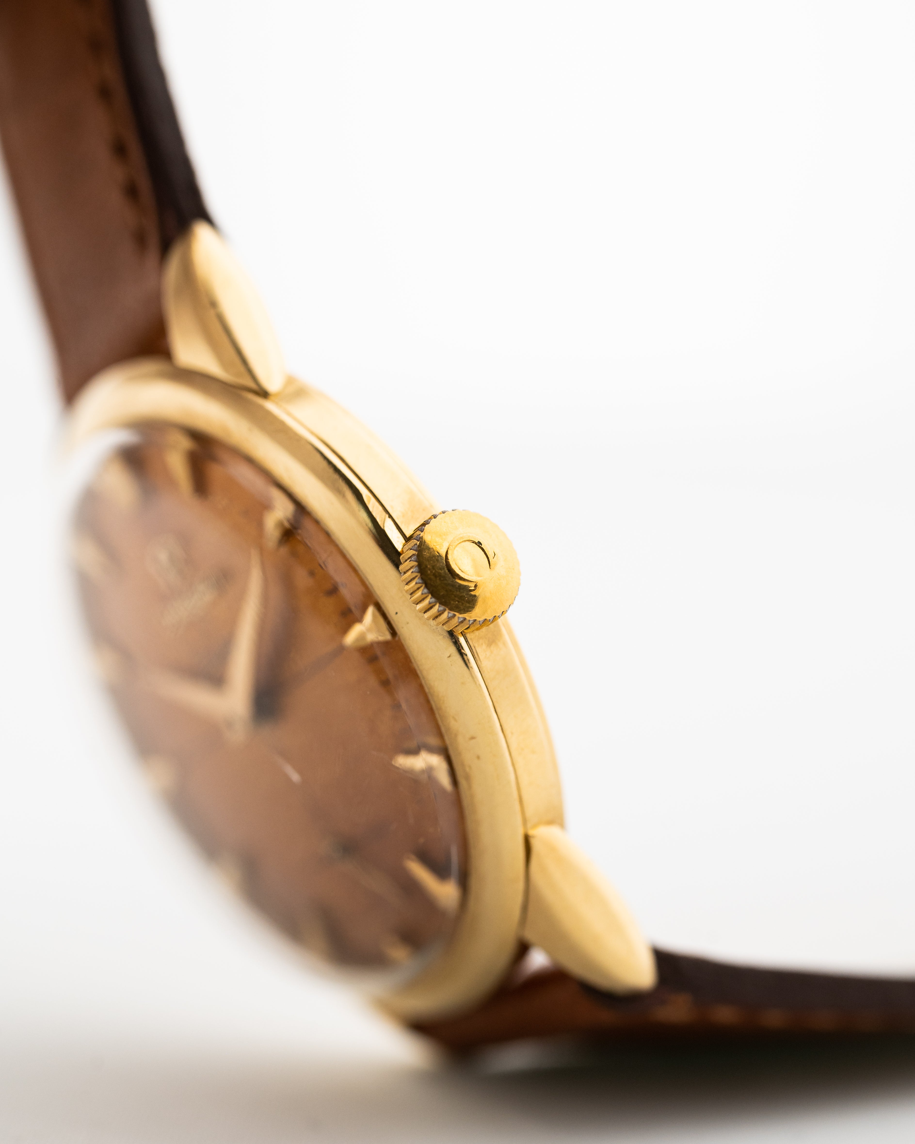 Cet exemple n'est pas seulement beau, il est aussi substantiel. Dotée d'un boîtier en or jaune de 35 mm, de cornes droites et d'un magnifique cadran en or jaune avec index en onyx, cette montre est vraiment incomparable.