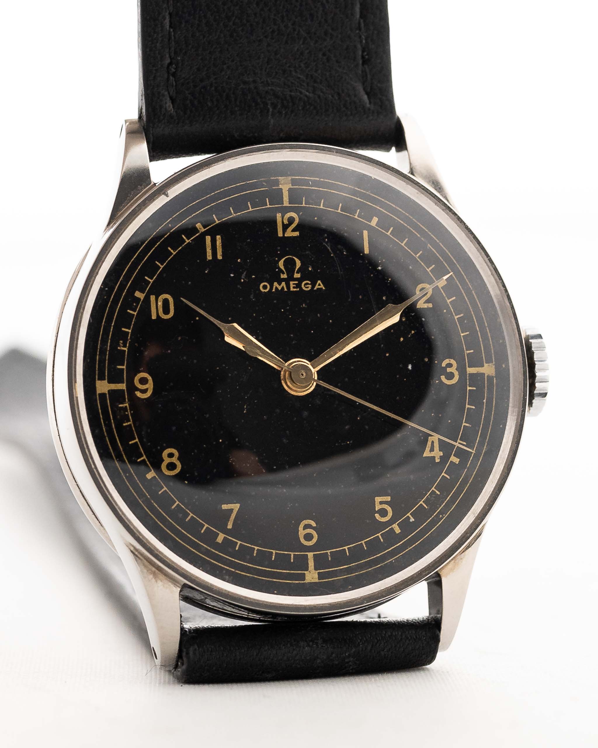 Cette Omega de 1935 est un exemple exceptionnel de l'horlogerie suisse du début du XXe siècle - et un véritable bijou de collection. Son cadran doré noir brillant d'origine, avec ses chiffres arabes dorés, ses aiguilles seringues dorées assorties et sa minuterie, rayonne d'élégance et de caractère. Il est rare que des cadrans de ce type soient conservés dans un si bel état.