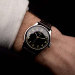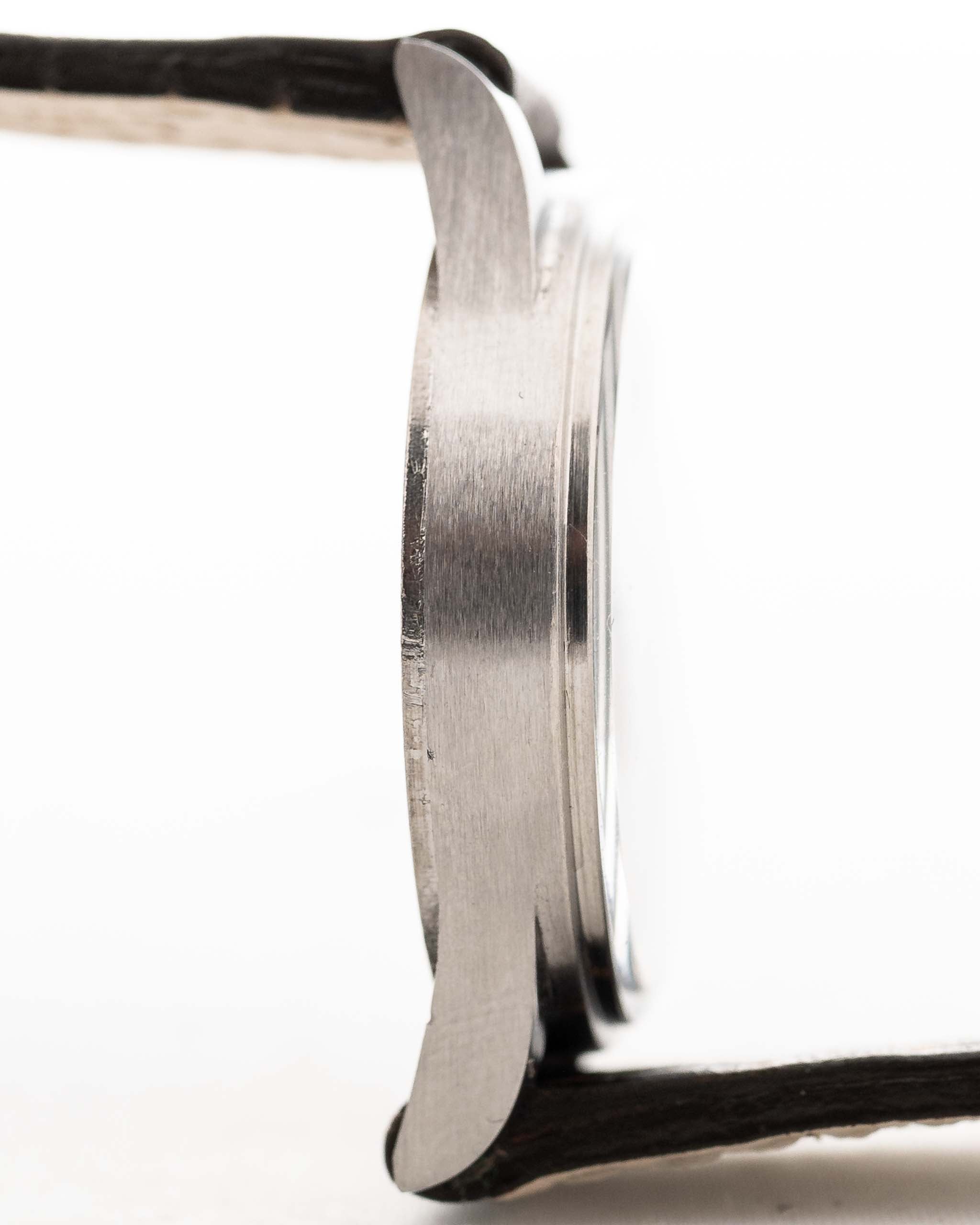 Cette beauté présente un boîtier en acier inoxydable avec un rare cadran noir brillant et est conçue dans le style Art déco. Un véritable trésor du siècle dernier.