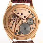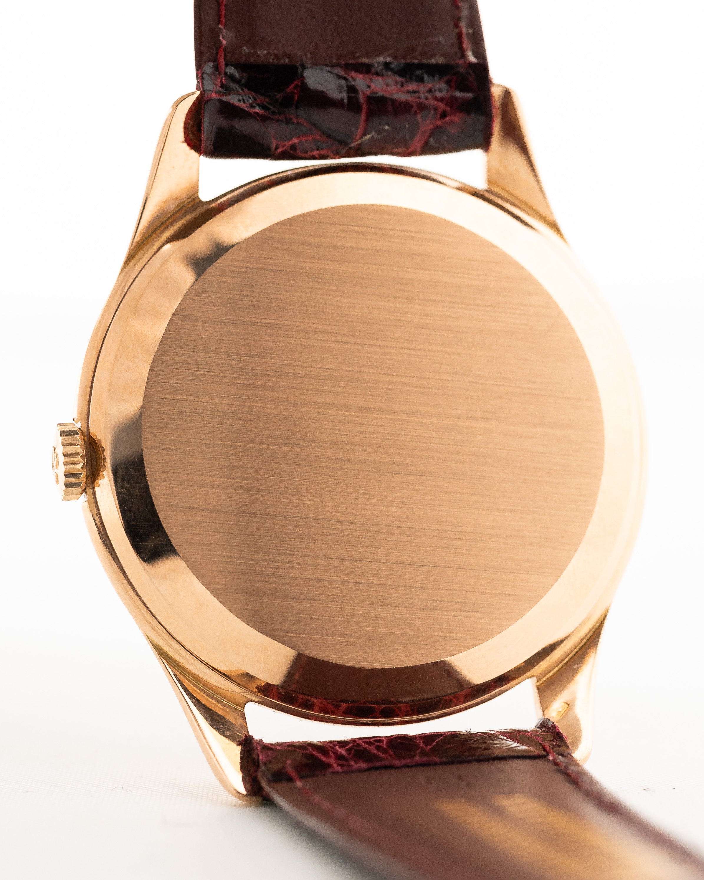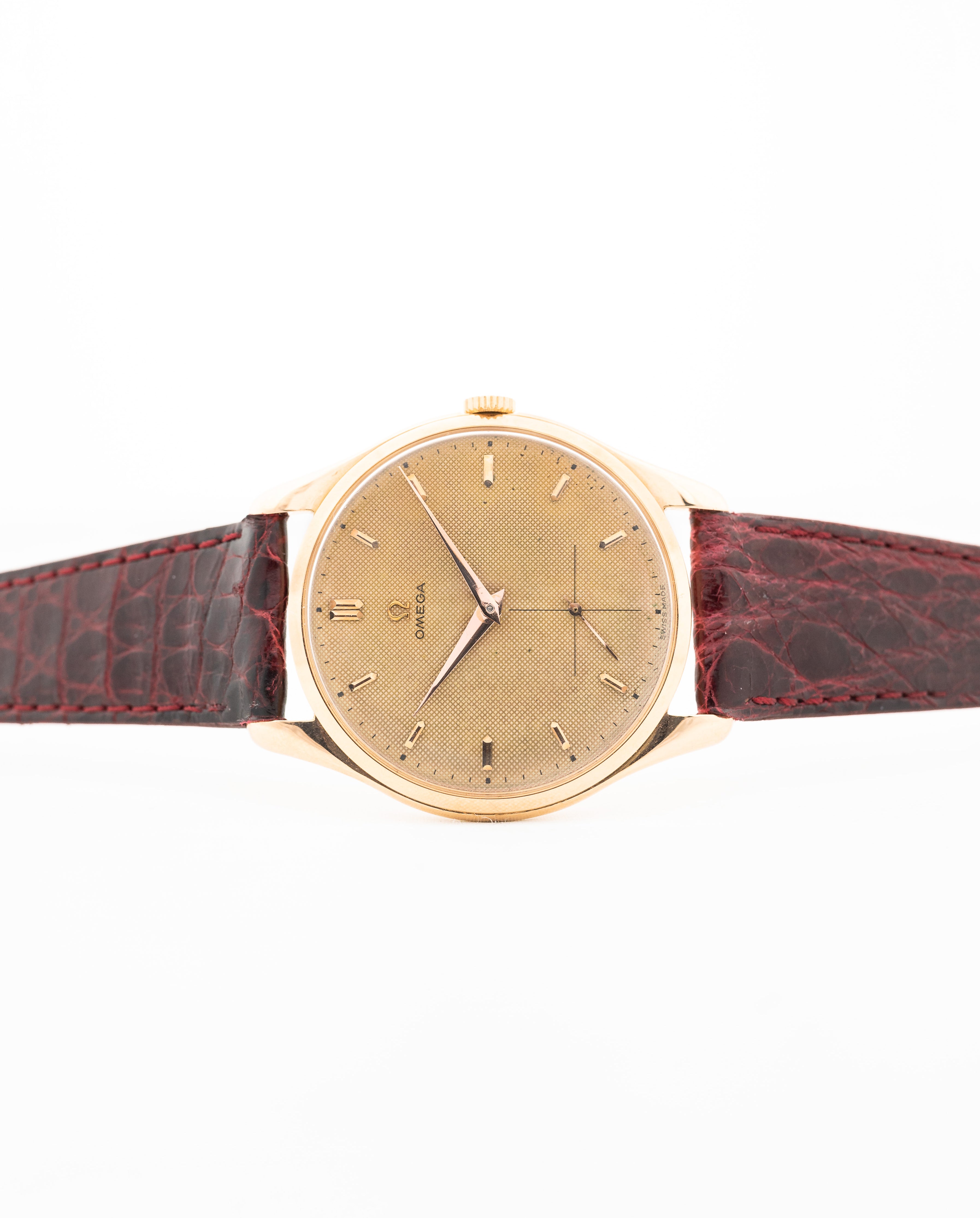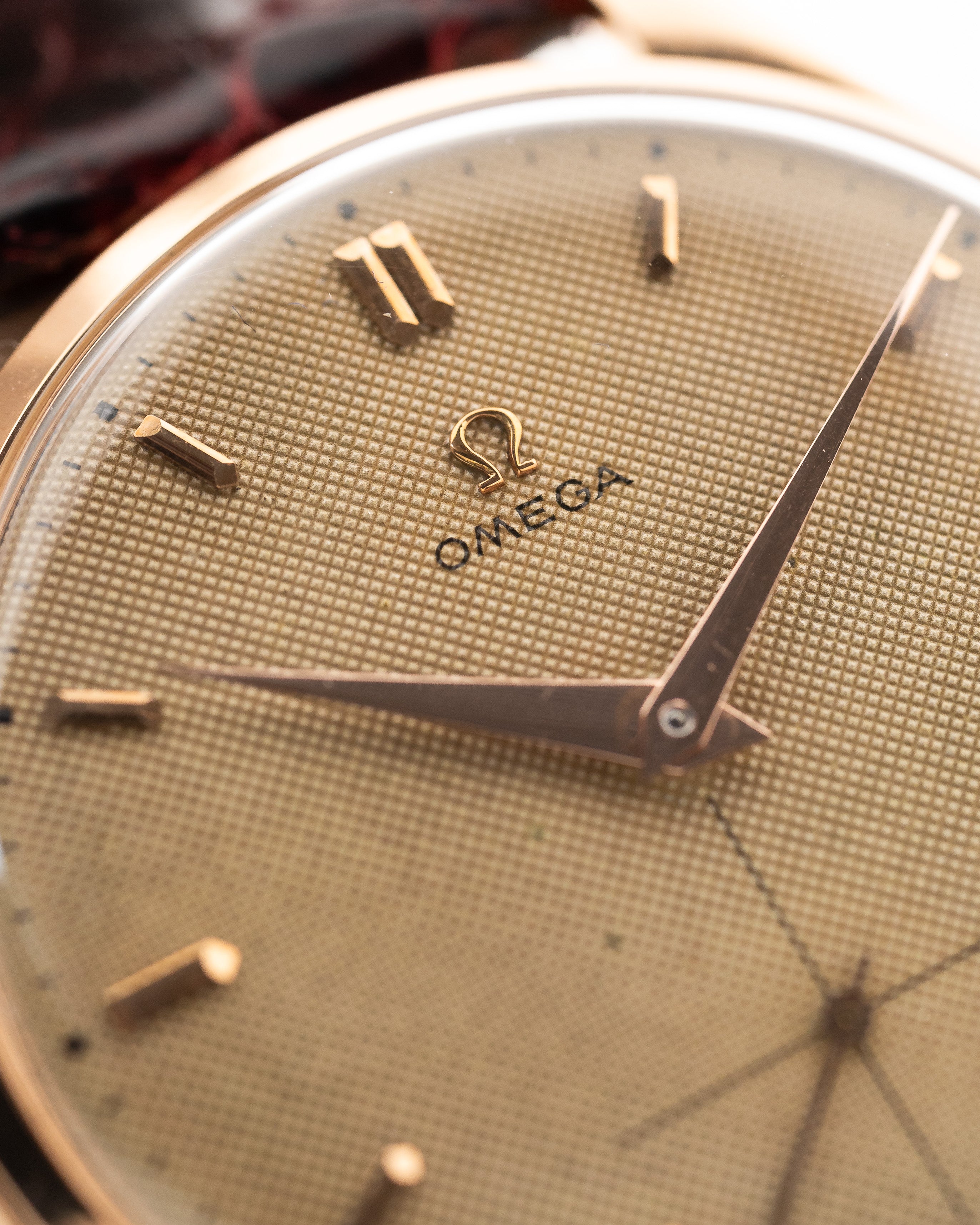 Cette Omega de 1950 a tout ce que vous attendez d'une montre habillée : un boîtier surdimensionné de 38 mm, un superbe cadran en nid d'abeille avec une seconde subsidiaire, un magnifique boîtier, des aiguilles et des index en or rose et le logo Omega en or rose appliqué.