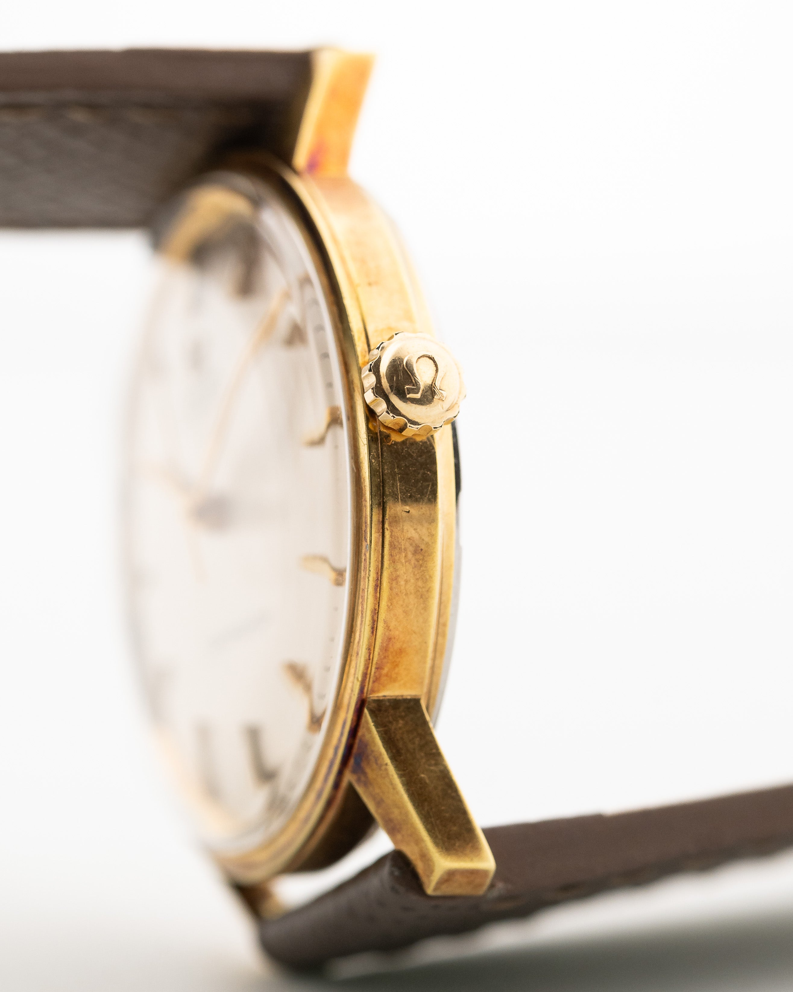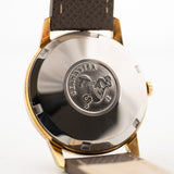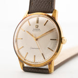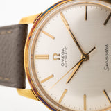 Vous voyez ici une fascinante Seamaster fabriquée par Omega en 1967. Elle est dotée d'un boîtier en acier inoxydable plaqué or de 34,5 mm avec des cornes droites et d'un magnifique cadran argenté soleillé et d'index et d'aiguilles en forme de bâton.