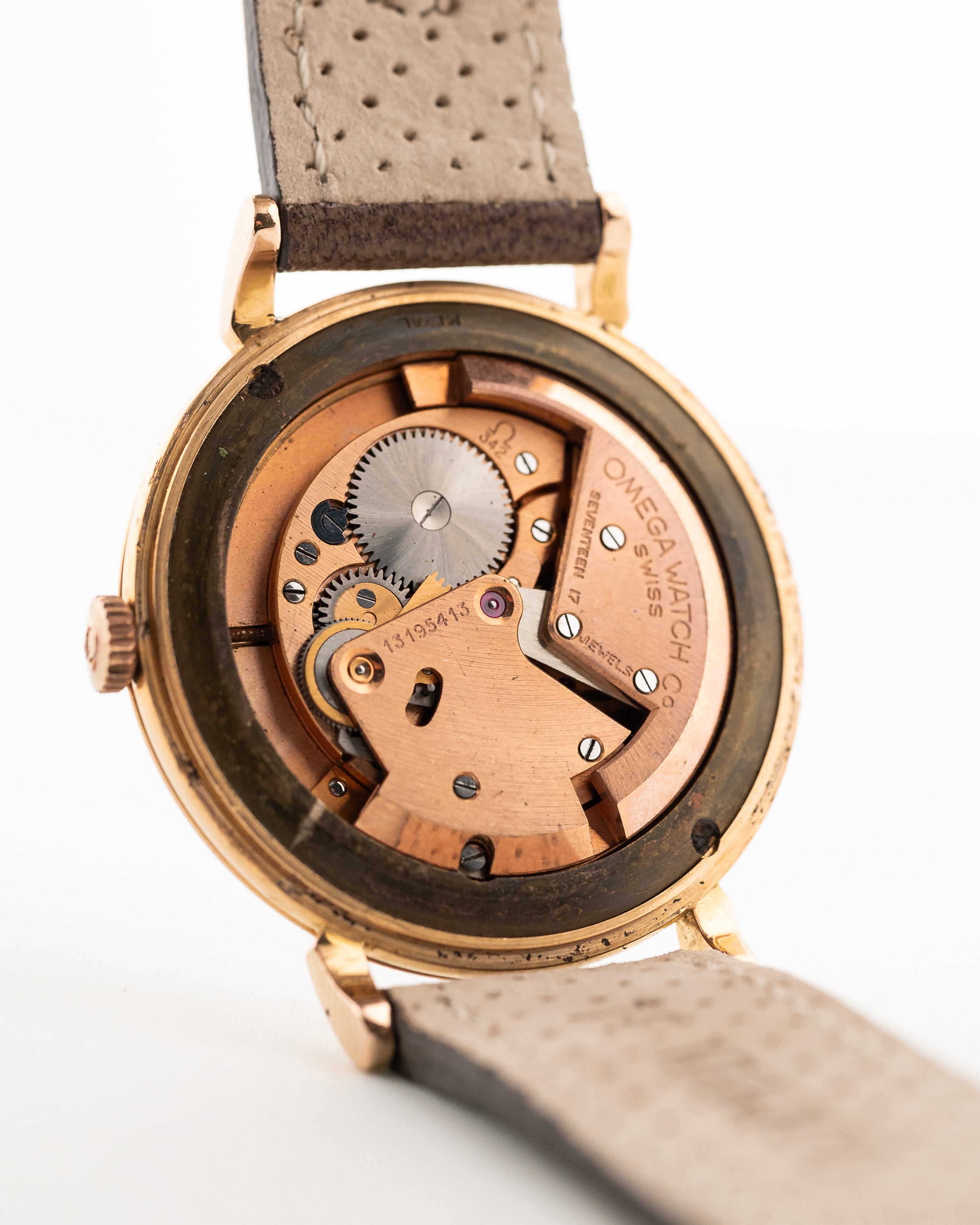 Le cadran est en très bon état et présente des chiffres arabes en or rose, une grande seconde subsidiaire, des aiguilles en or rose, le logo Omega et des index en forme de poignard. Cet exemplaire est dans un état incroyable, le boîtier est net et propre.