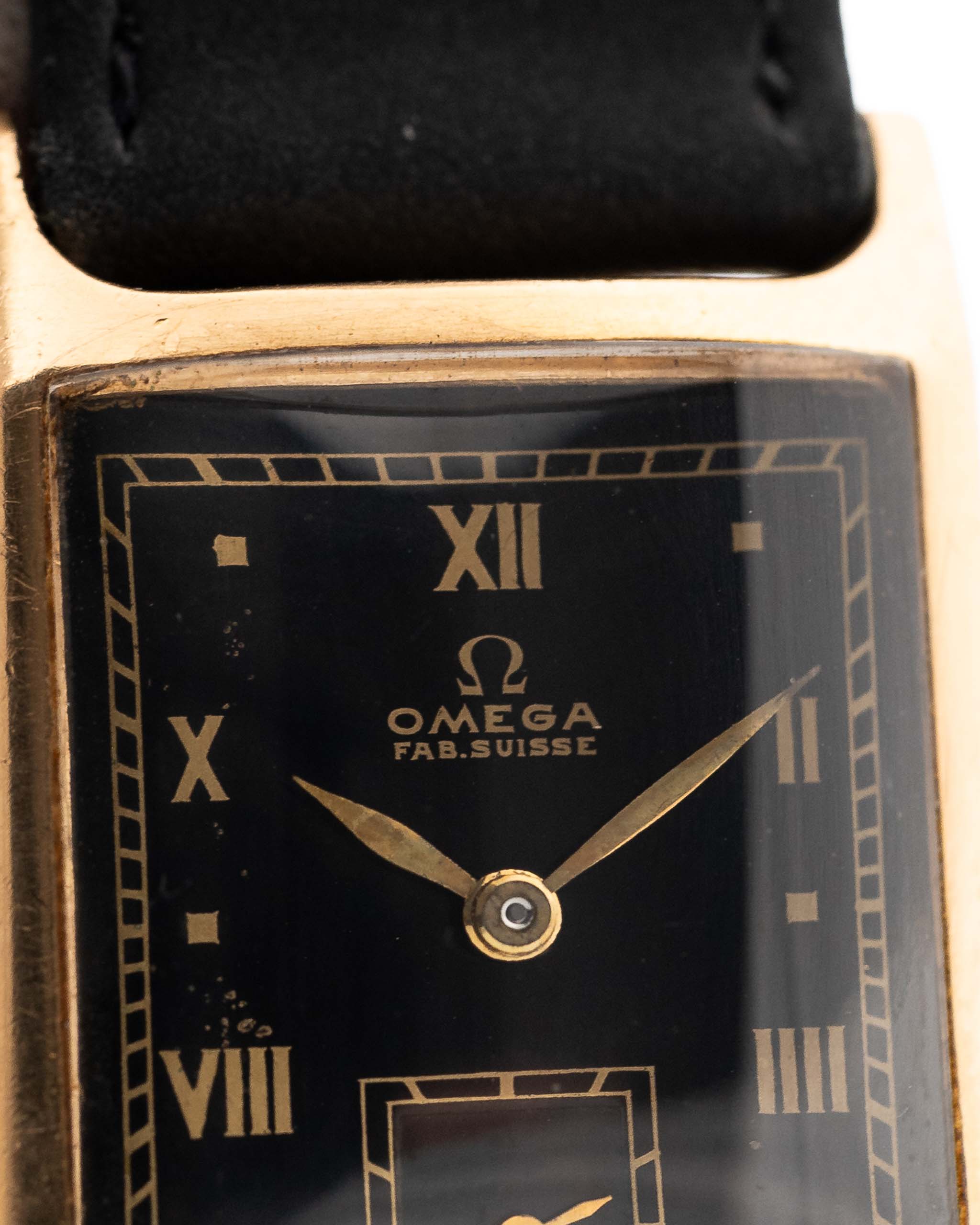 Vintage Omega Tank Gilt watch Roman from 1944. 18mm wide with 18k Rose Gold Case, Manual Wind Movement, Black Gilt Dial, Roman Numerals and Black Leather Strap.