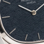 Parfaitement équilibrée entre ronde et rectangulaire, la Patek Philippe Ellipse est depuis longtemps considérée comme un modèle de proportions parfaites. Cette référence 3545 des années 1970 illustre l'élégance architecturale du modèle, avec son boîtier harmonieux en or blanc 18 carats et son superbe cadran guilloché Sigma bleu qui rayonne d'un éclat discret.