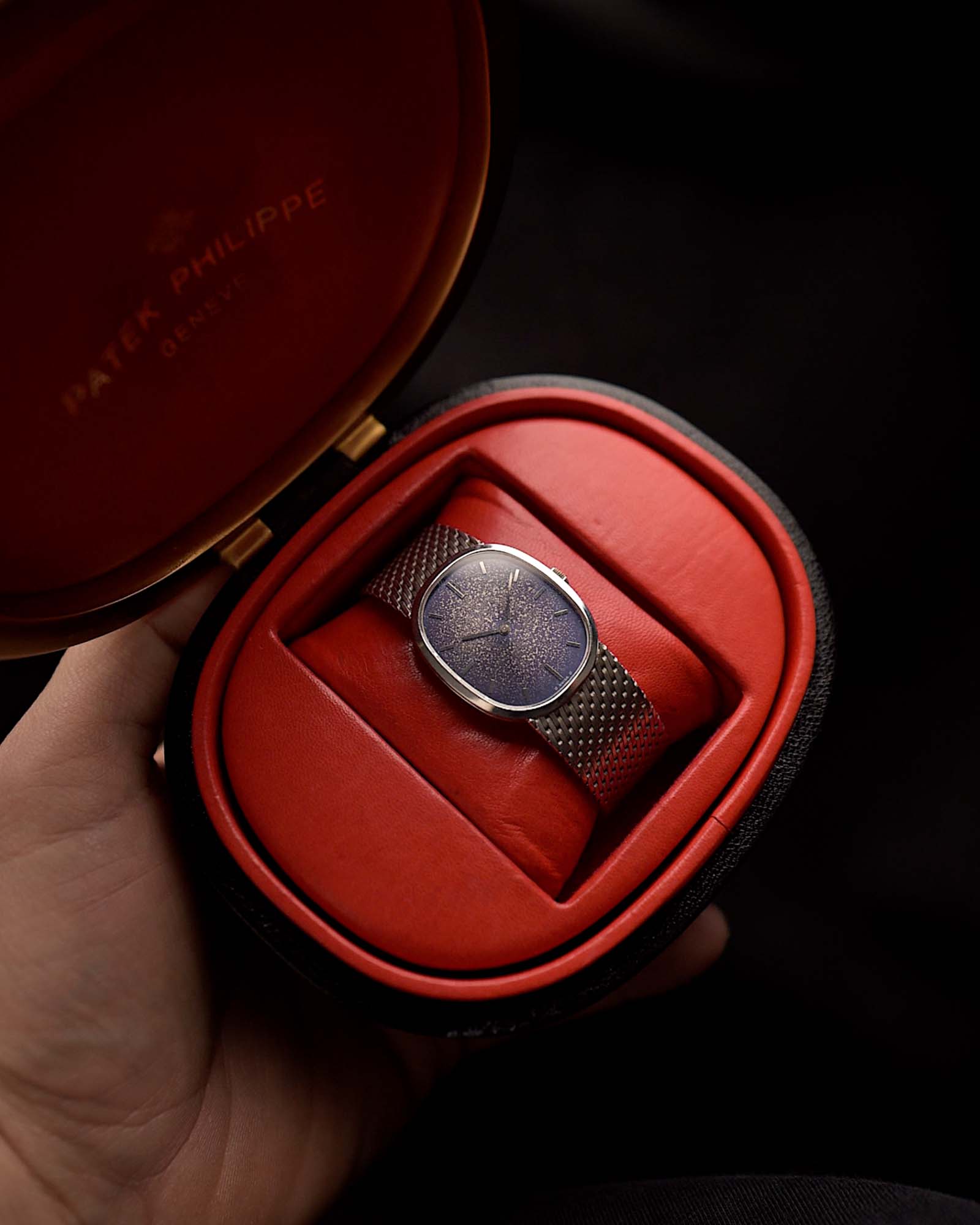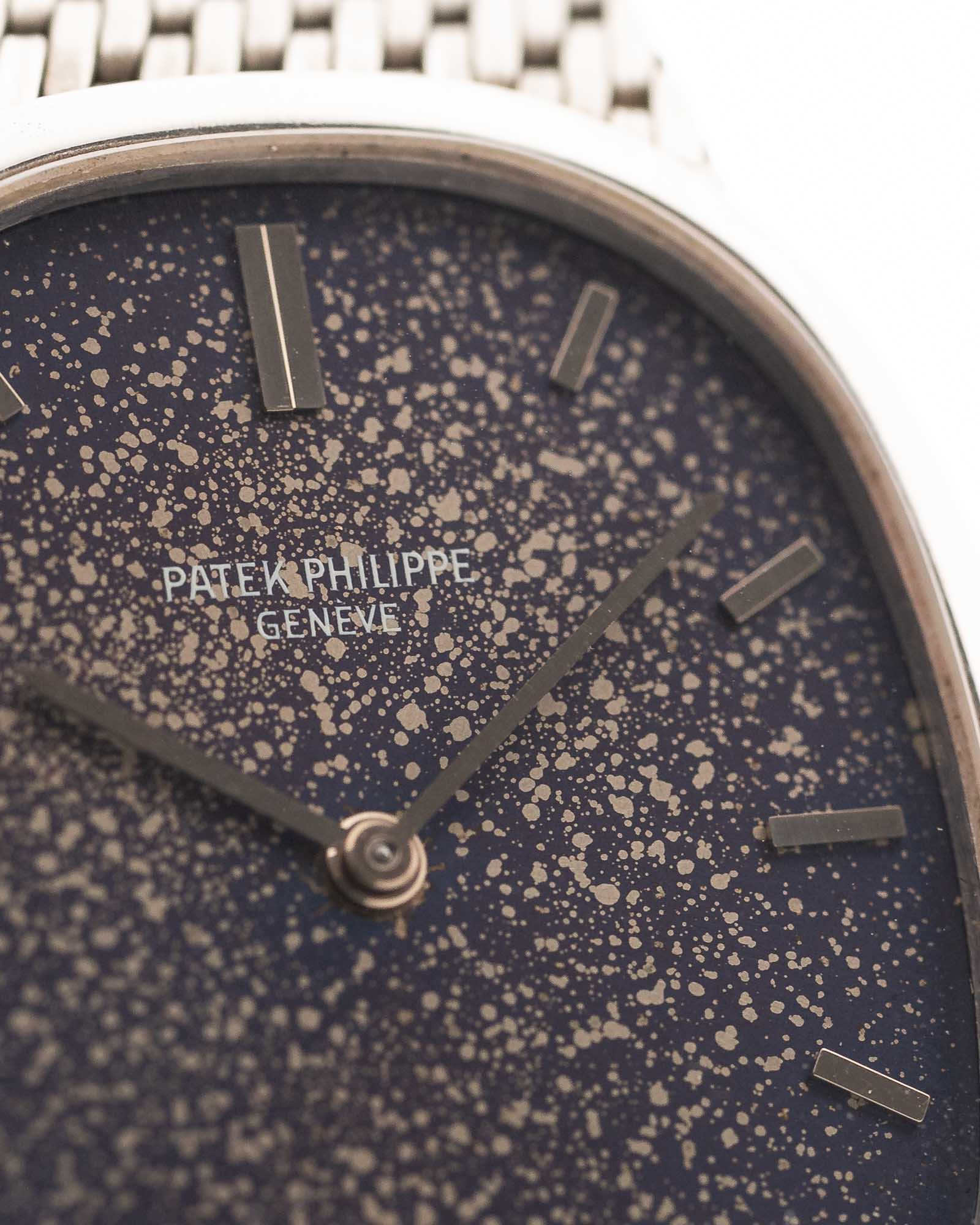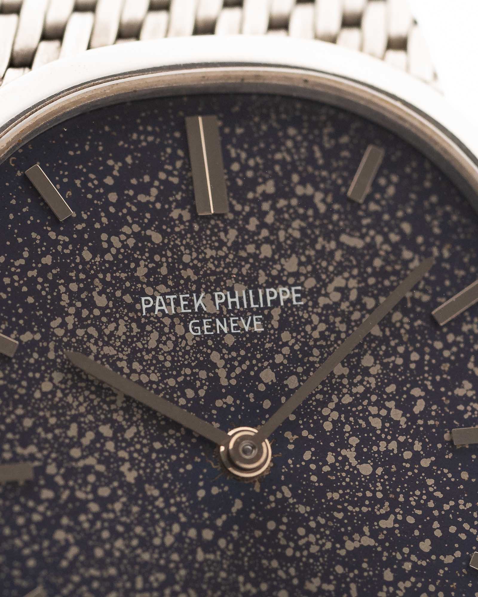 Cet exemplaire est en excellent état général, avec un cadran bleu Sigma magnifiquement vieilli et une patine unique en son genre. Le boîtier fin en or blanc 18 carats est associé à un bracelet intégré en or blanc, tandis qu'à l'intérieur bat le mouvement à remontage manuel Patek Philippe Cal. 23-300, réputé pour sa précision et son raffinement.