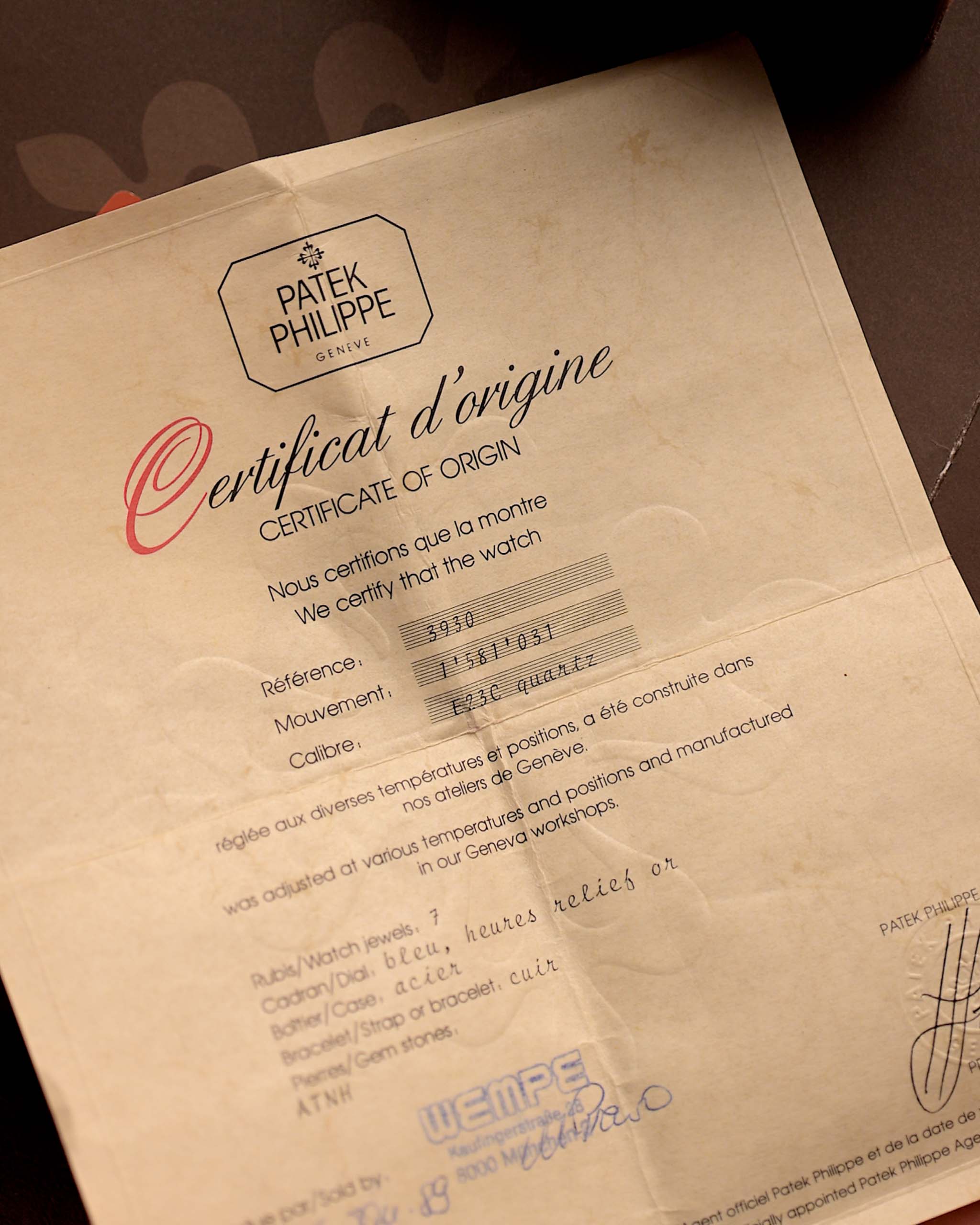 Mieux encore, cet exemplaire est livré dans son intégralité, avec le certificat d'origine, la facture d'achat de Wempe Munich et le coffret Patek Philippe - un véritable coffret de collection rarement vu pour cette référence.