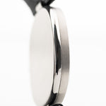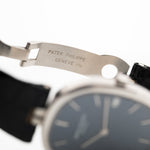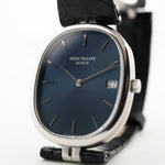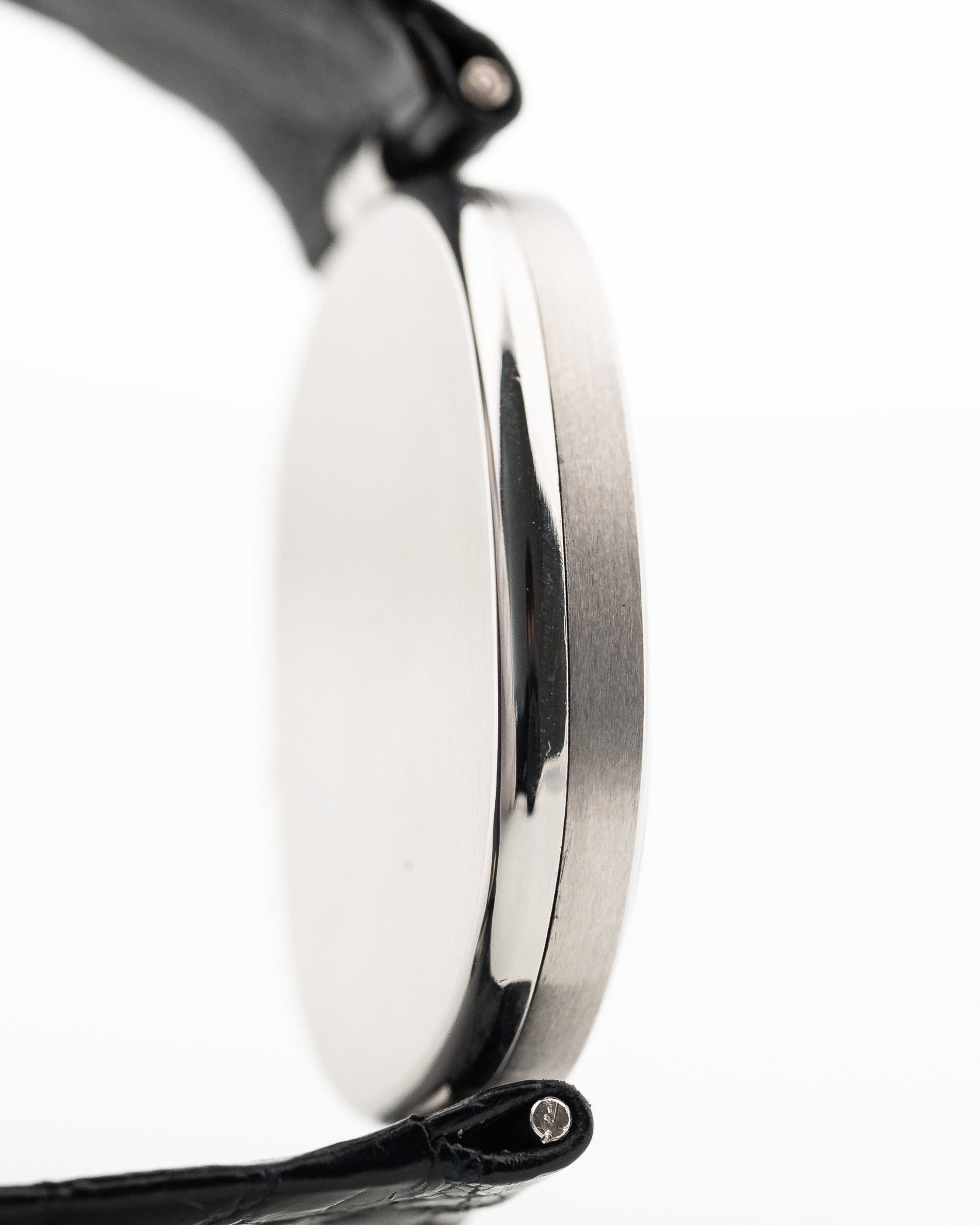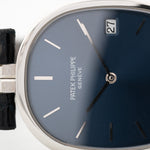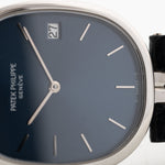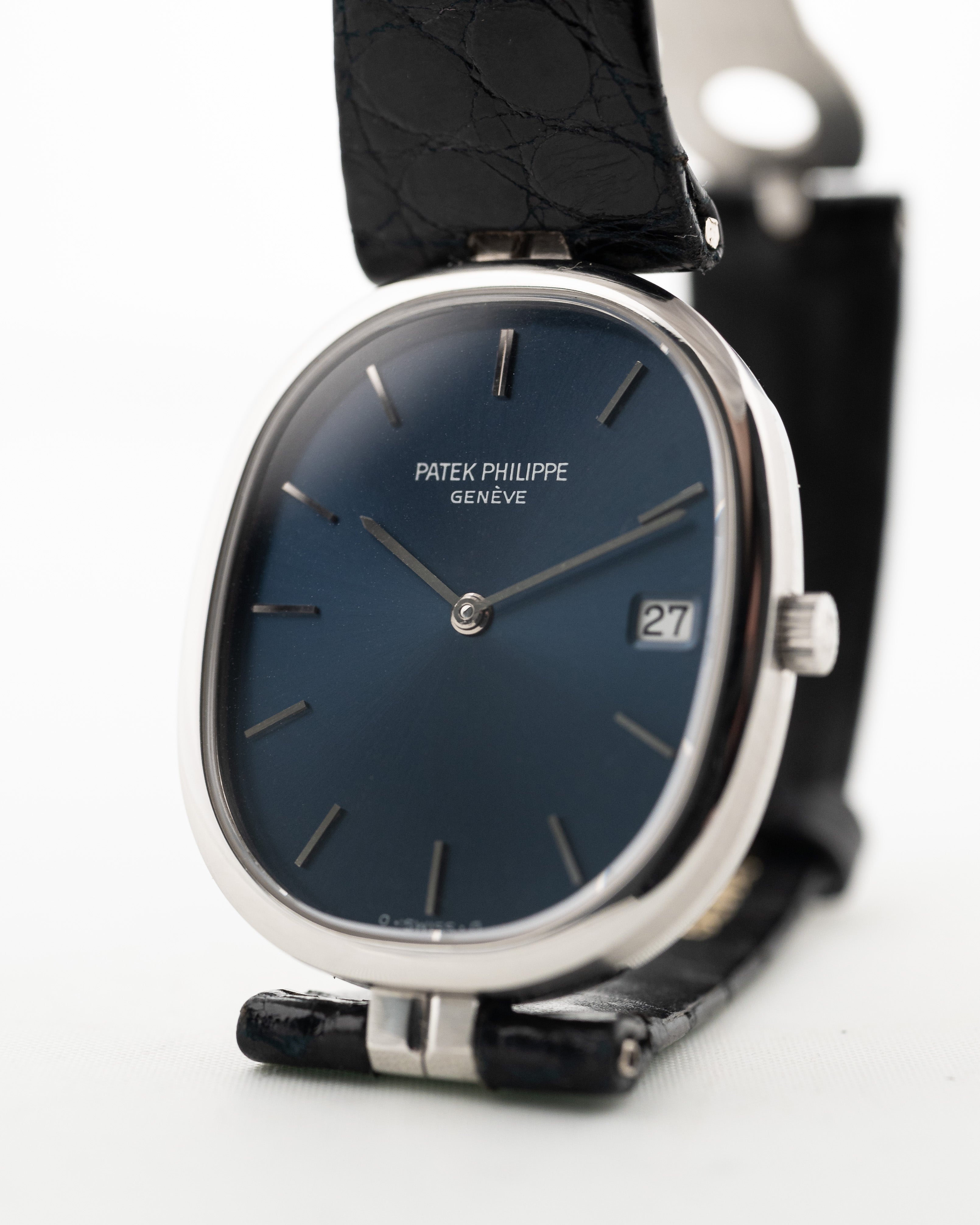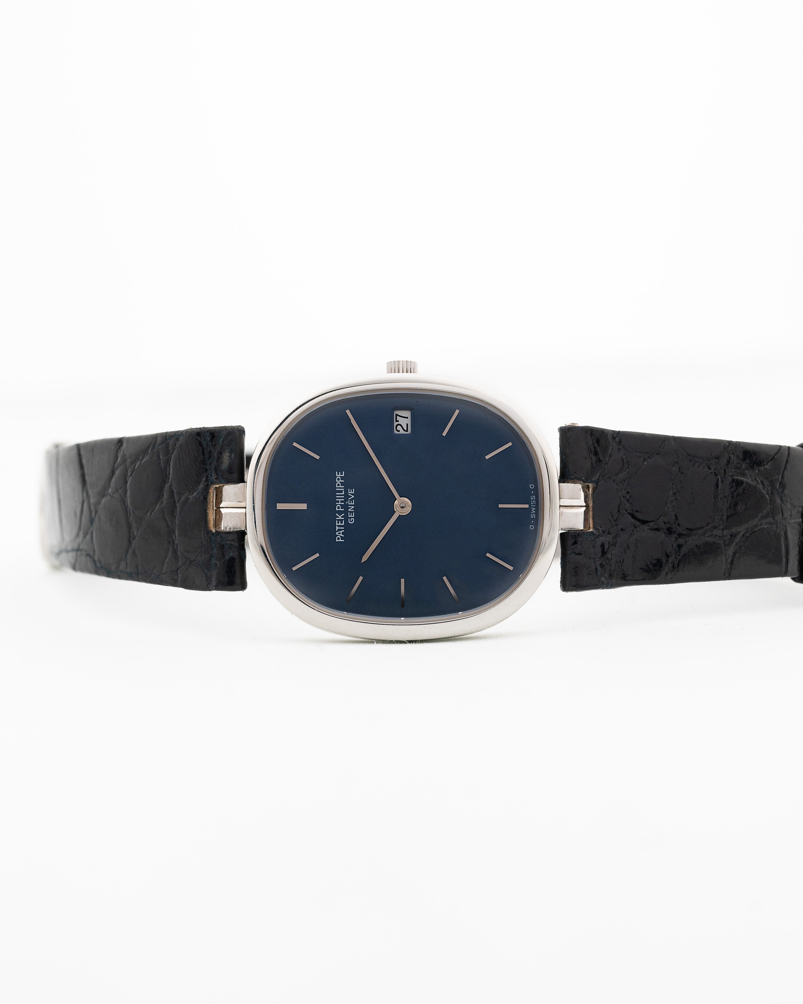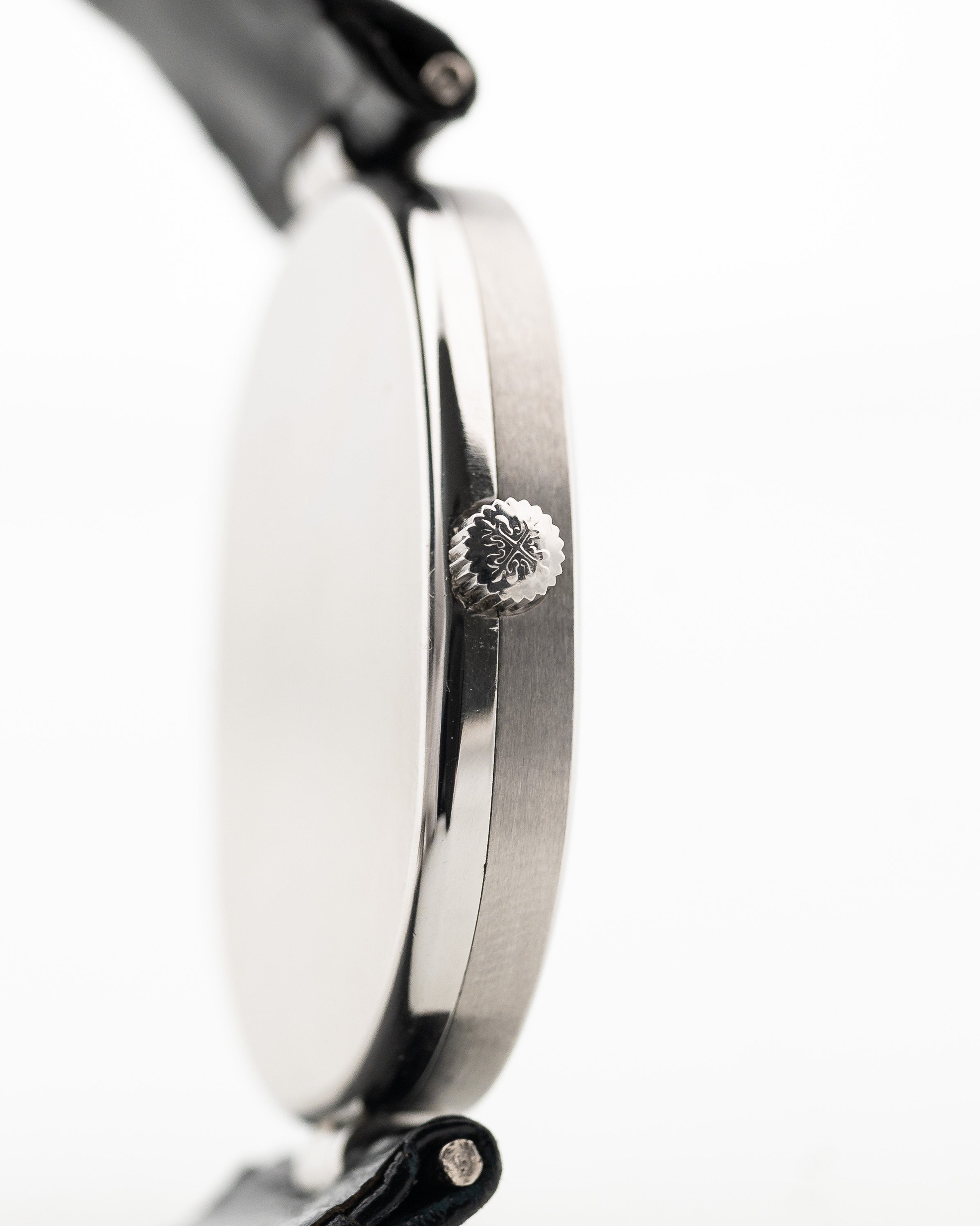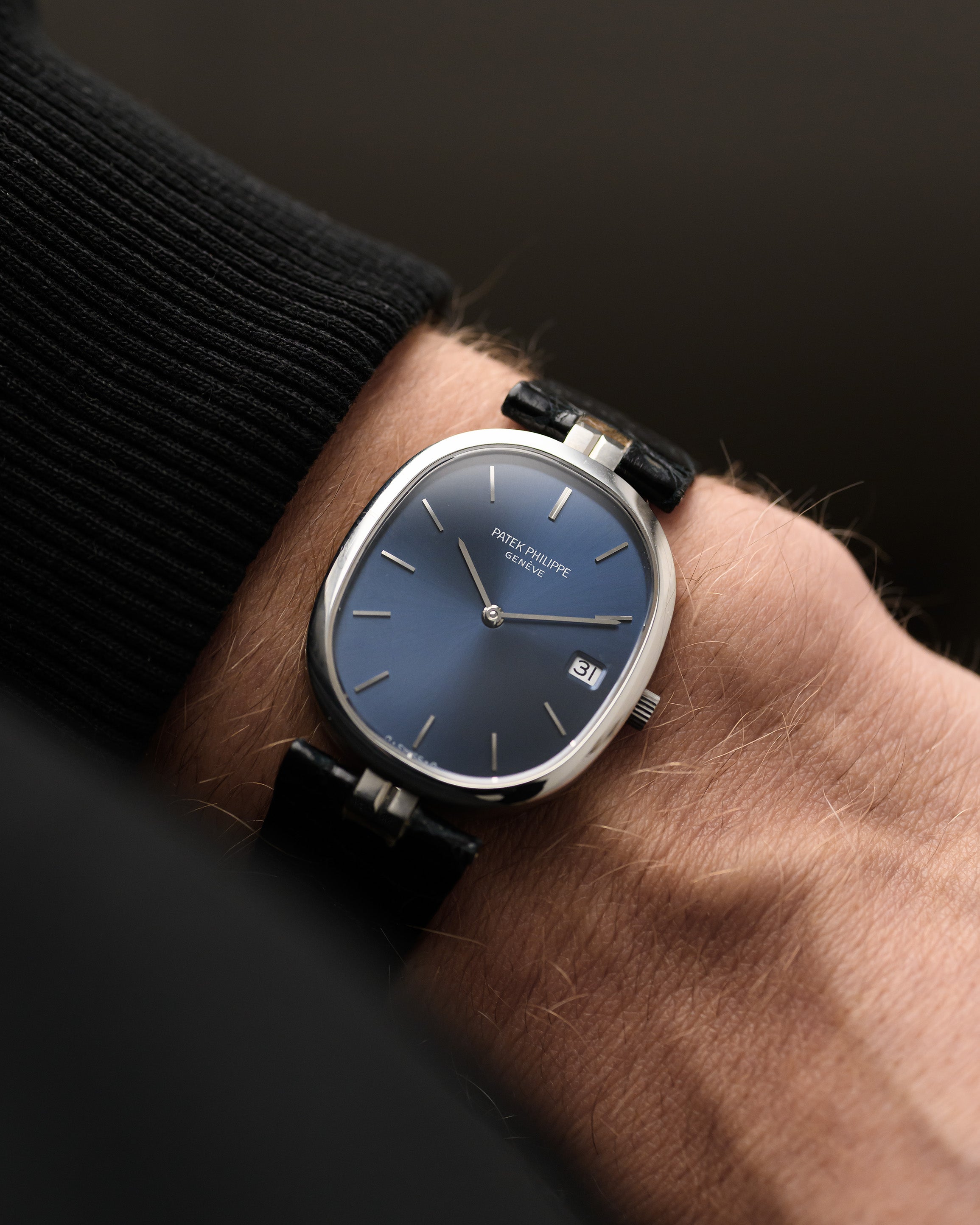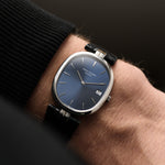 Nous avons ici une excellente représentation des montres habillées de Patek Philippes, cette ref. 3930 a atteint tous les sommets avec un rare boîtier en acier inoxydable, des cornes intégrées et un magnifique cadran sigma bleu profond dans un état impeccable.
