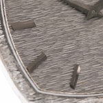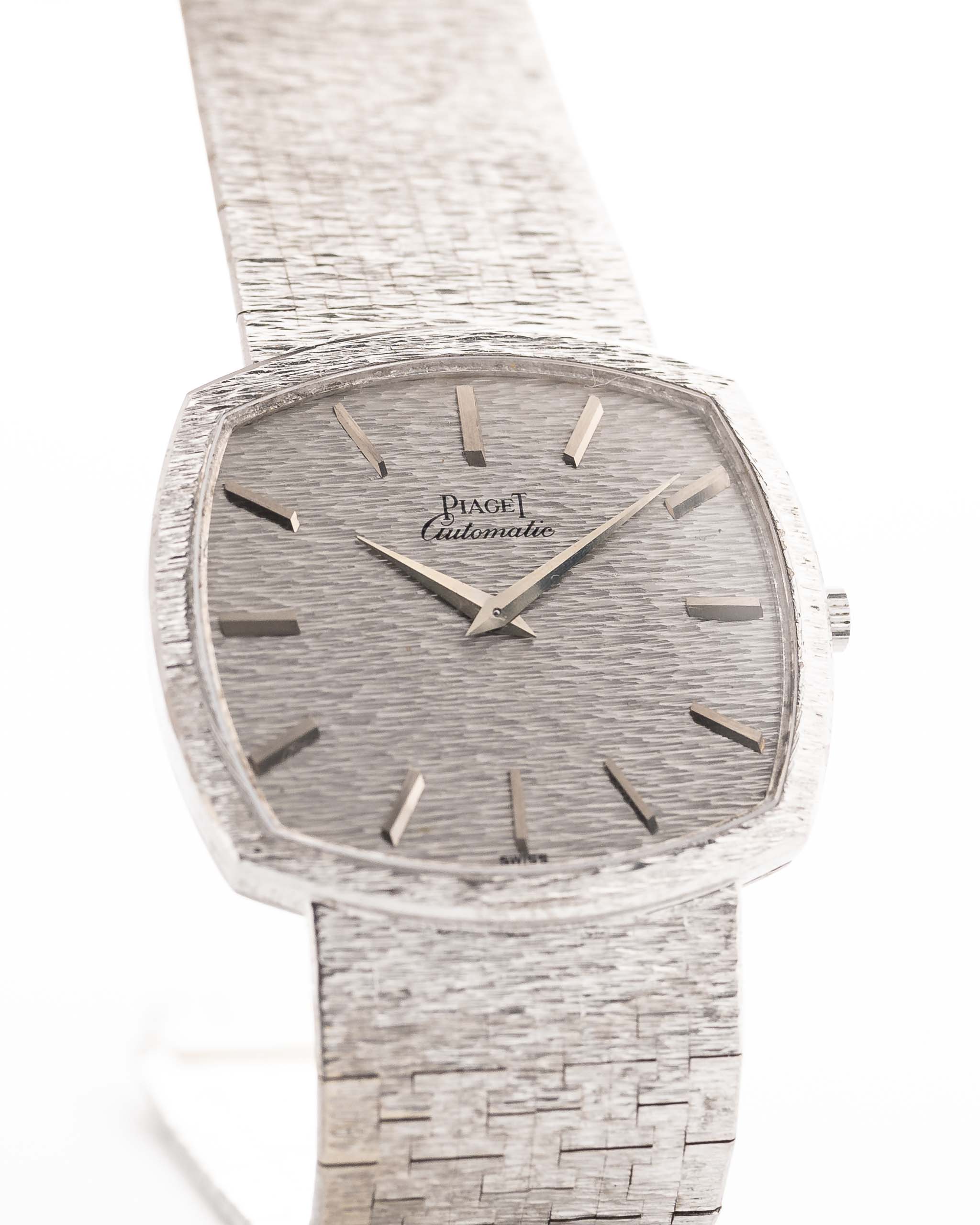 Présentée dans un état quasi neuf, elle est dotée d'un bracelet intégré spectaculaire en or blanc 18 carats et d'un cadran martelé en or blanc impeccable. Le boîtier distinctif en forme de téléviseur, avec une finition écorce sur l'ensemble de la lunette, du cadran et du bracelet, transforme cette montre en une véritable œuvre d'art à porter.