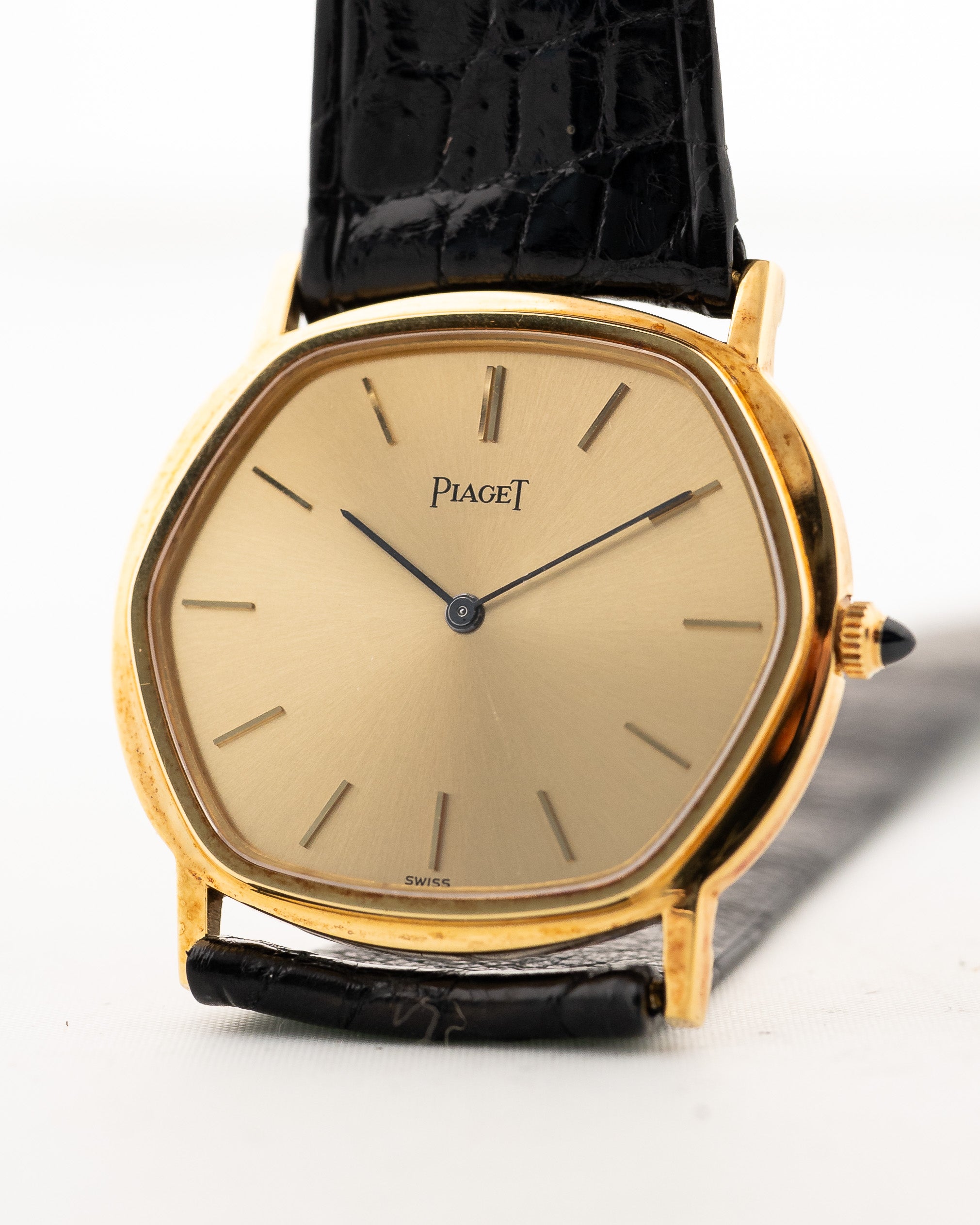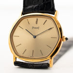 Notre pièce est livrée en état non poli avec le bracelet en cuir Piaget d'origine et la boucle en or jaune 18 carats. Le cadran est impeccable et la forme hexagonale du boîtier est une pièce d'art vraiment unique.