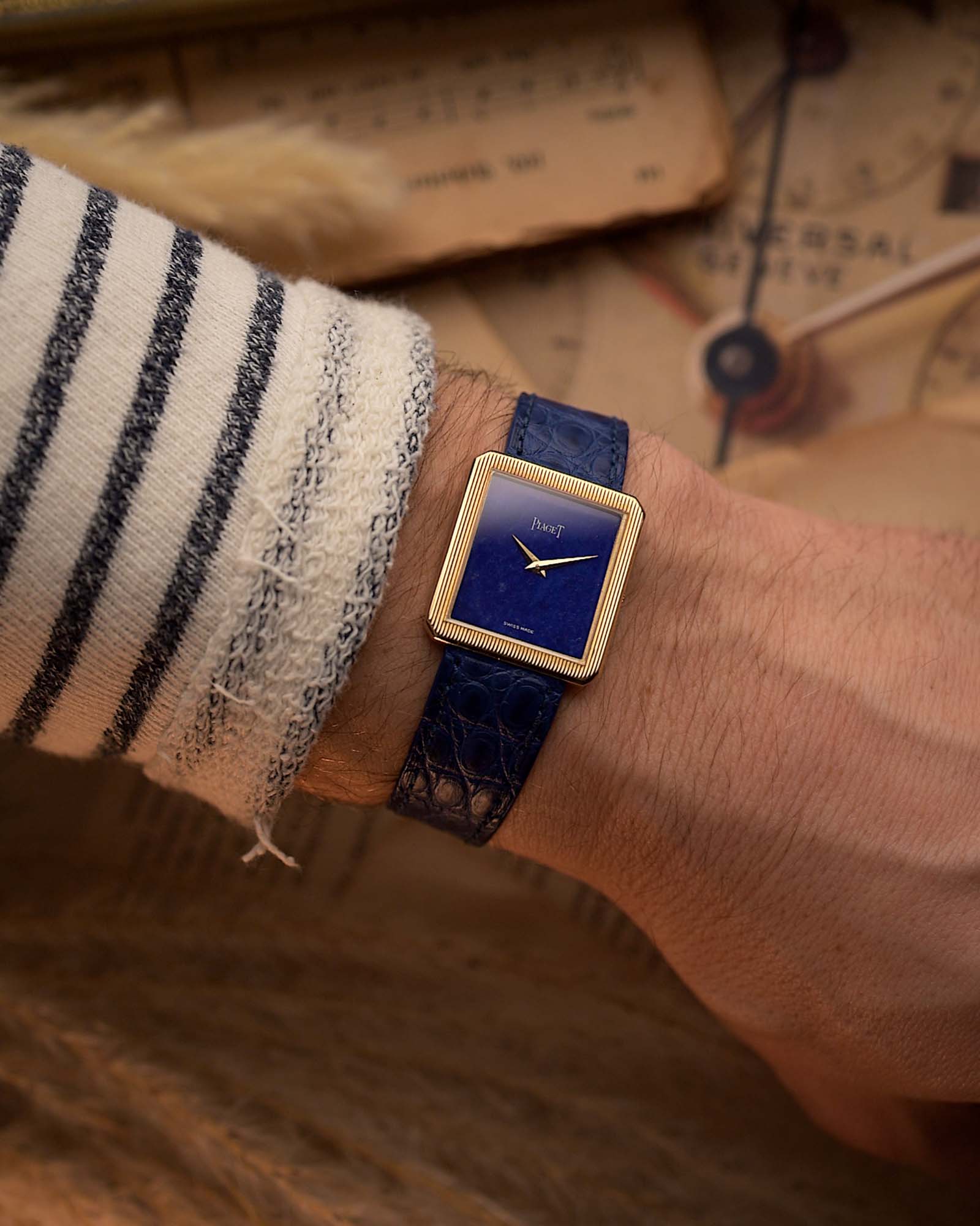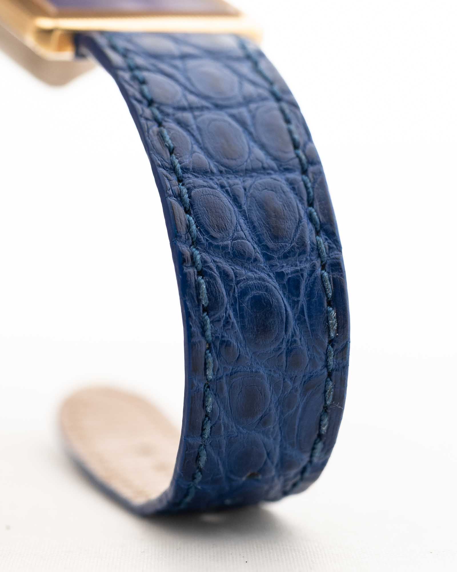 Peu de montres incarnent l'élégance des années 1970 comme cette Piaget Réf. 9154, une création élégante en forme de tank, fabriquée en or jaune massif 18 carats et dotée d'un cadran en lapis-lazuli naturel qui scintille de mille feux.