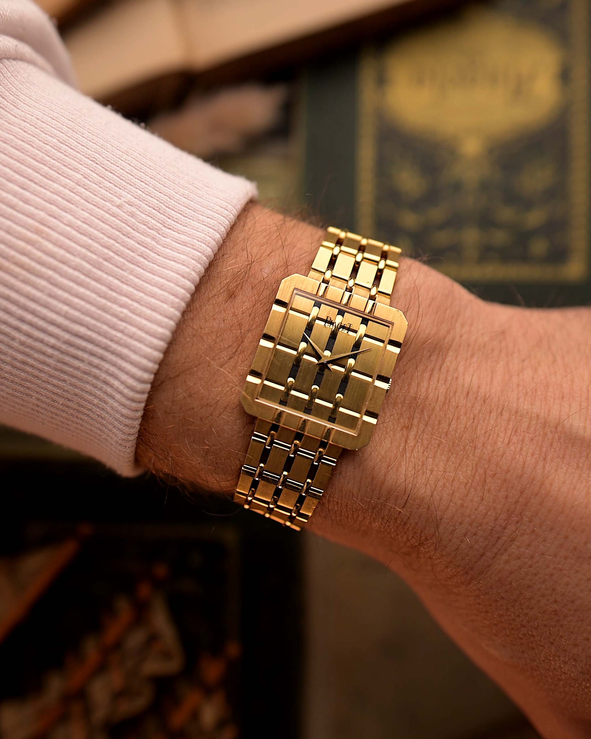 Cette interprétation de la Protocole séduit dès le premier regard : un boîtier géométrique en or jaune 18 carats s'intègre parfaitement à son bracelet en or assorti, formant un langage de design unifié aux lignes épurées et aux proportions sculpturales. Le cadran doré, qui reflète subtilement la texture du bracelet, apporte harmonie et sophistication comme seul Piaget pouvait le faire.